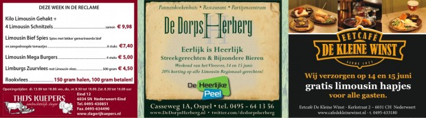 De Dorpsherberg heeft een speciale actie in het weekend van 14 en 15 juni waarbij er 20 % korting wordt gegeven op alle gerechten bereidt met Limousinvlees. In de ambachtelijke slagerij van Thijs Kuepers kunt u profiteren van speciale acties op Limousinvlees. En natuurlijk kunt u in het weekend van het vlees vee ook eens gaan kijken hoe de dieren er in de natuur bij lopen.