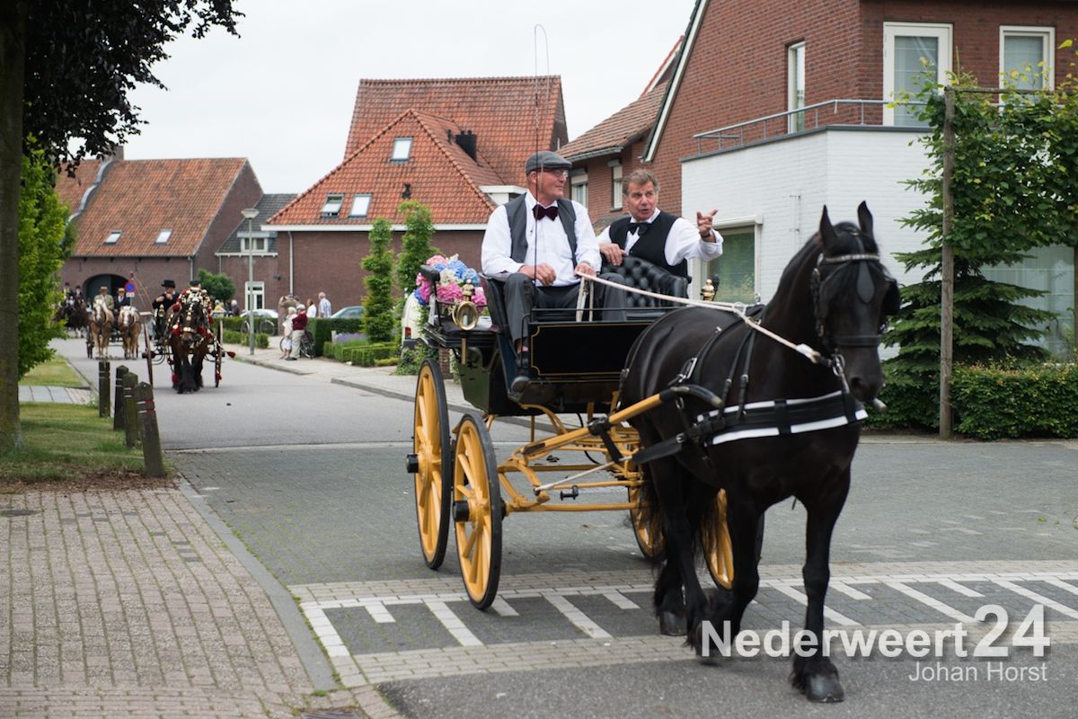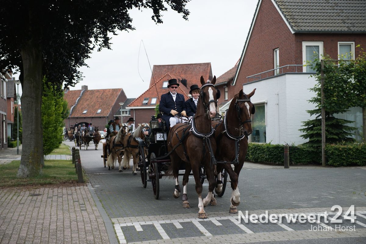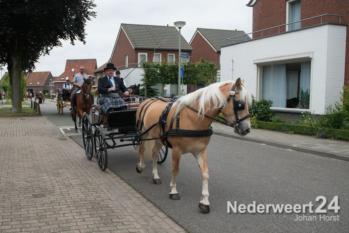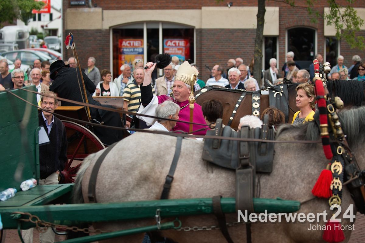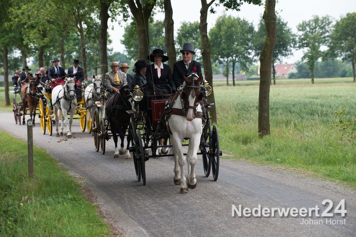 Na de zegen van hulpbisschop de Jong trok de grote Koetsentocht vanuit Stramproy richting Weert. Ruim dertig koetsen maakten een lint van antieke en hedendaagse koetsen.