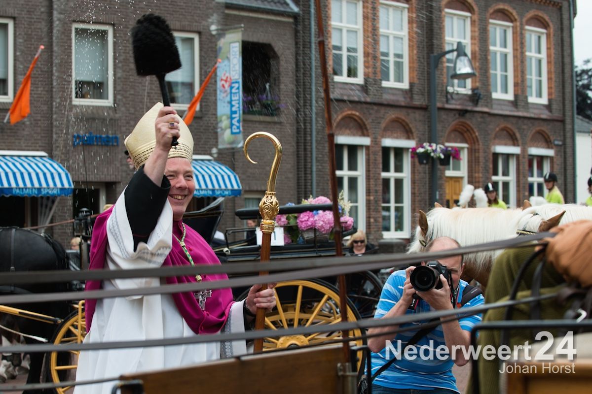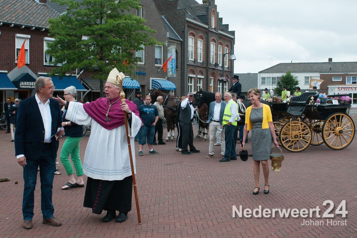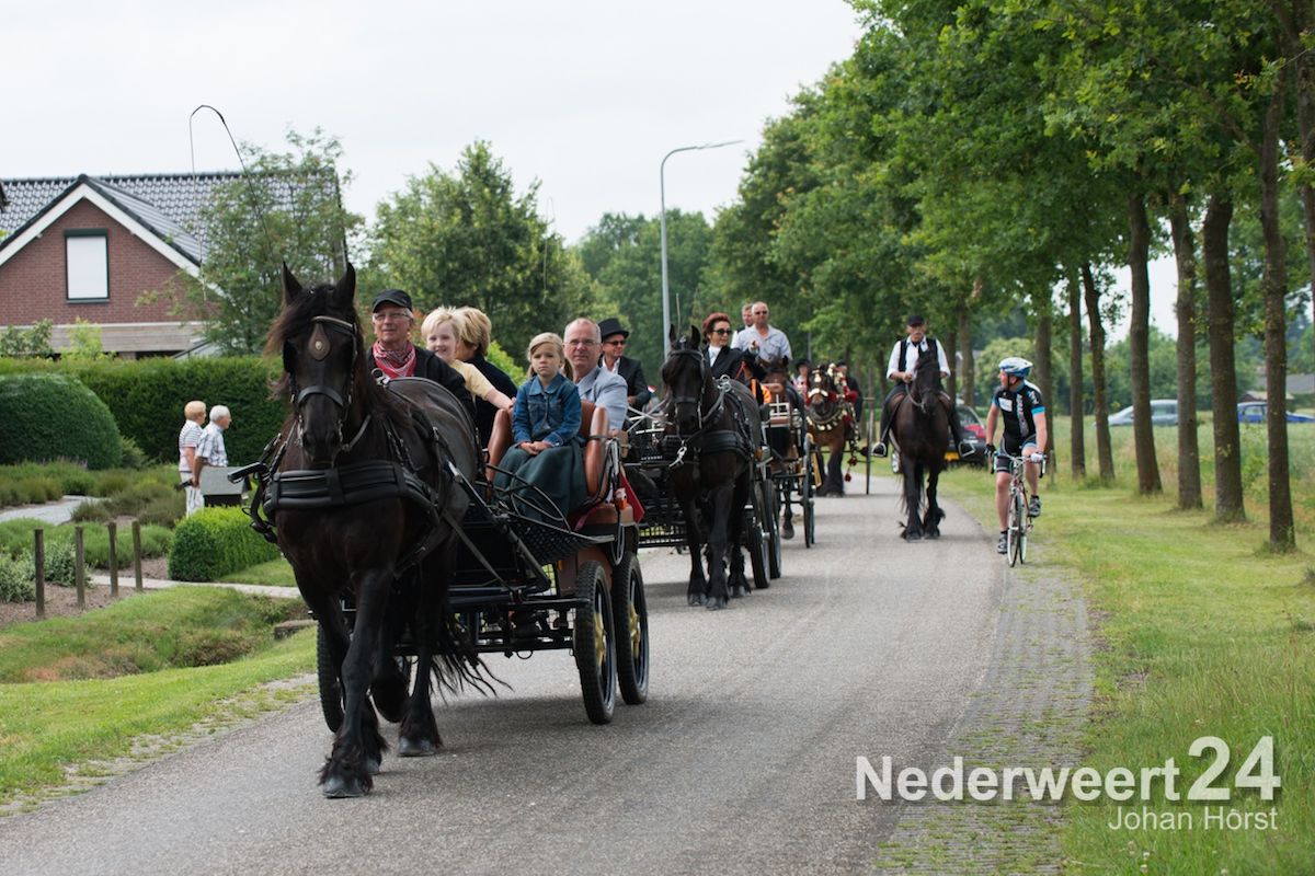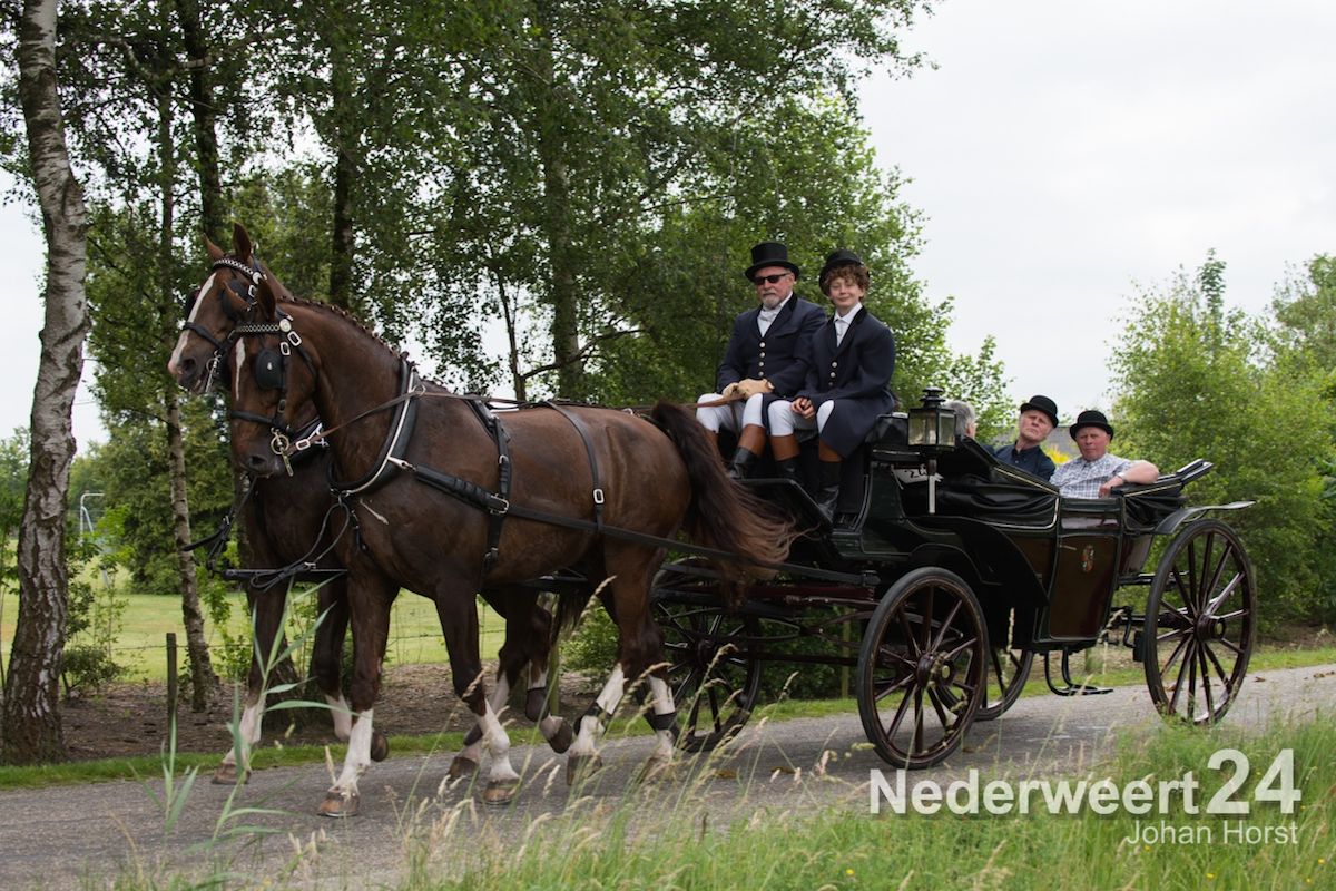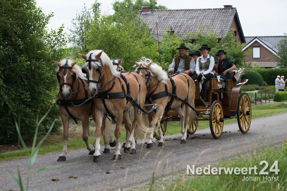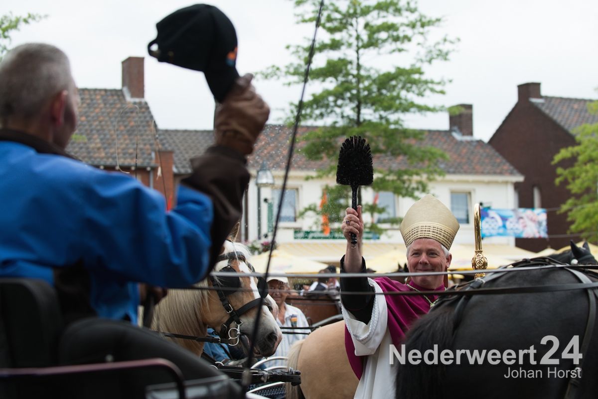 Na de zegen van hulpbisschop de Jong trok de grote Koetsentocht vanuit Stramproy richting Weert. Ruim dertig koetsen maakten een lint van antieke en hedendaagse koetsen.