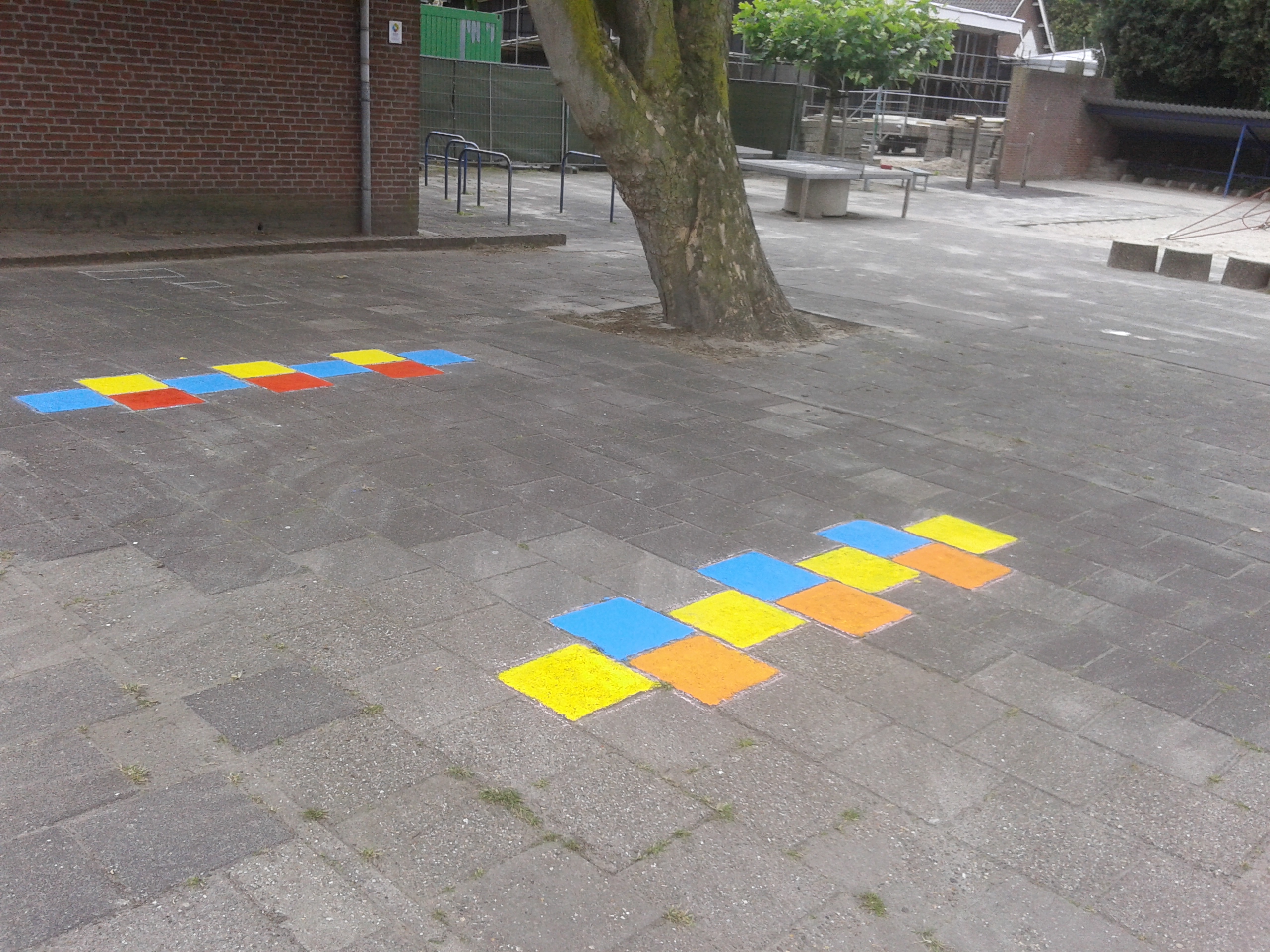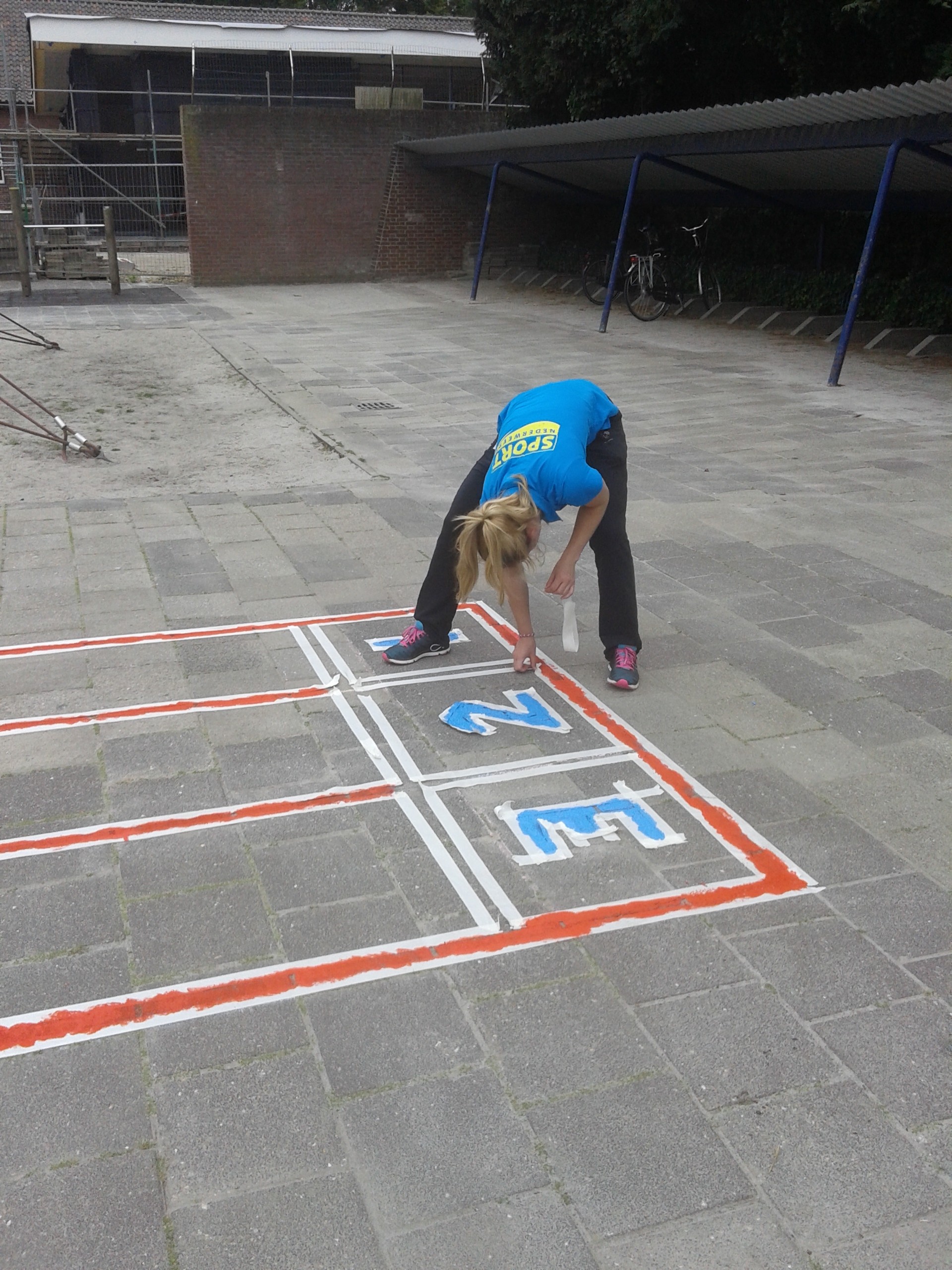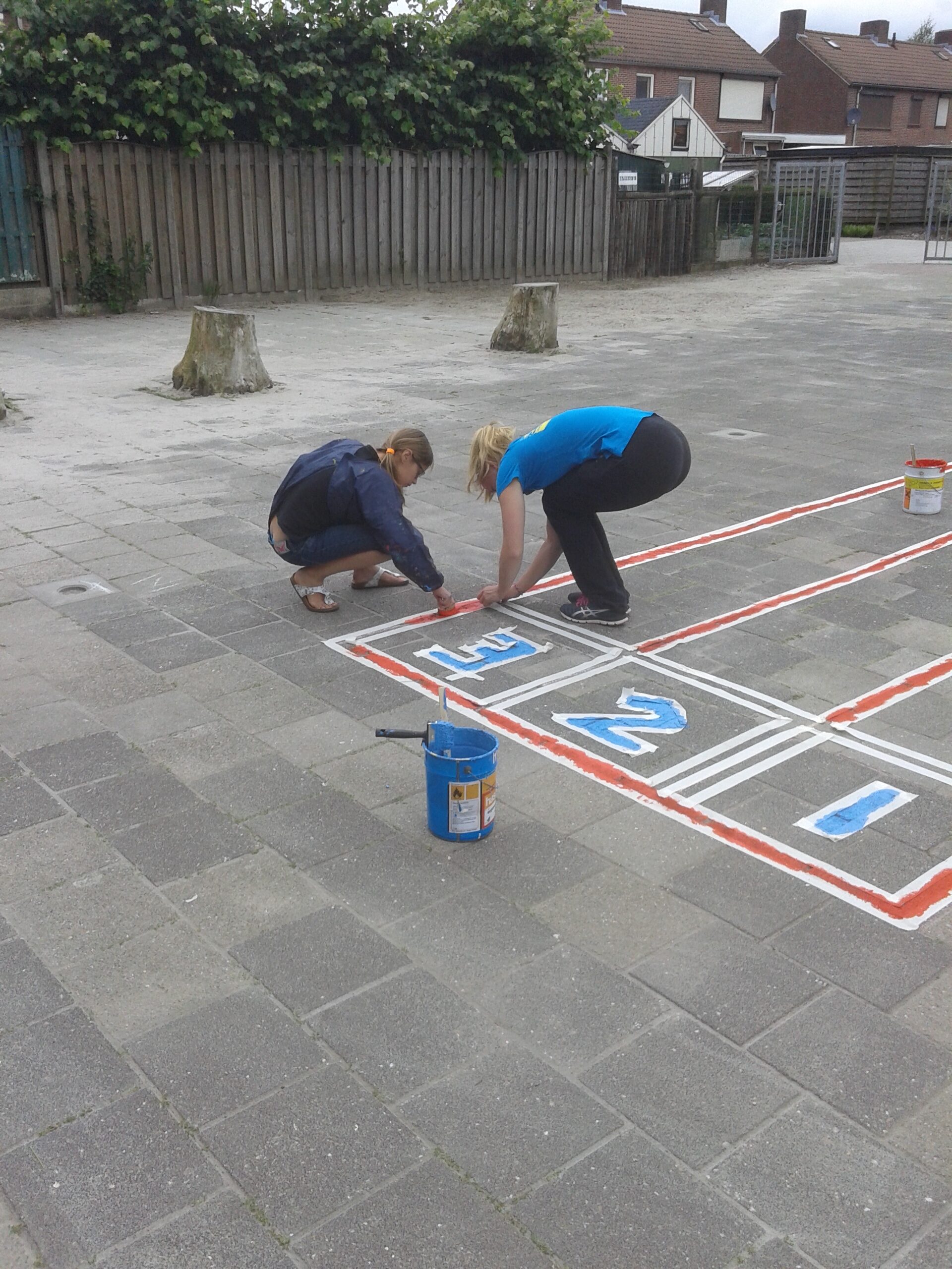 Ze hebben twee hinkelbanen, een estafette renbaan en het spel “bal in de put” op het schoolplein geverfd. Het schoolplein ziet er nu weer een stuk kleurrijker uit. De kinderen kunnen dus lekker gaan bewegen op het schoolplein. Na de verbouwing zal het schoolplein een grote metamorfose ondergaan.