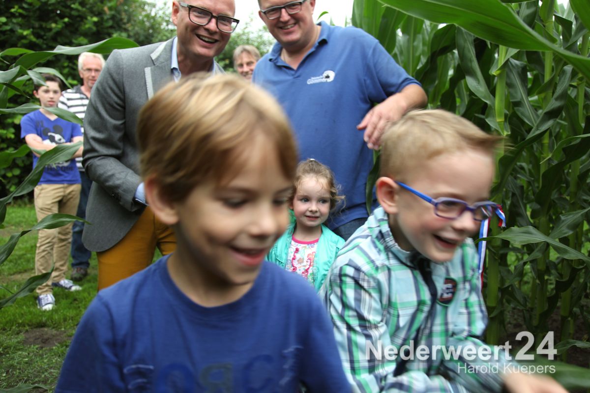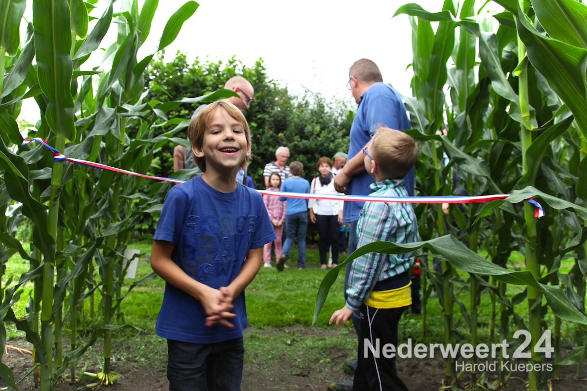 Waren het vorig jaar nog gewoon rechte banen, dit jaar heeft een speciale techniek ervoor gezorgd dat de naam en het logo vanuit de lucht gezien ook waarheidsgetrouw weergegeven worden. Hierdoor is de doolhof nog moeilijker en uitdagender is. Wethouder Mackus verrichtte samen met zijn neefje Koen de ceremoniële handeling waarna ze tezamen met vrienden en bekenden op verkenningstocht gingen in de spiksplinternieuwe doolhof.