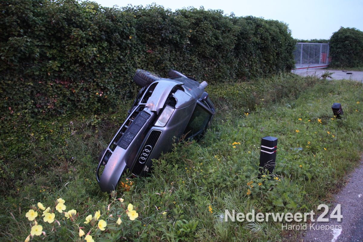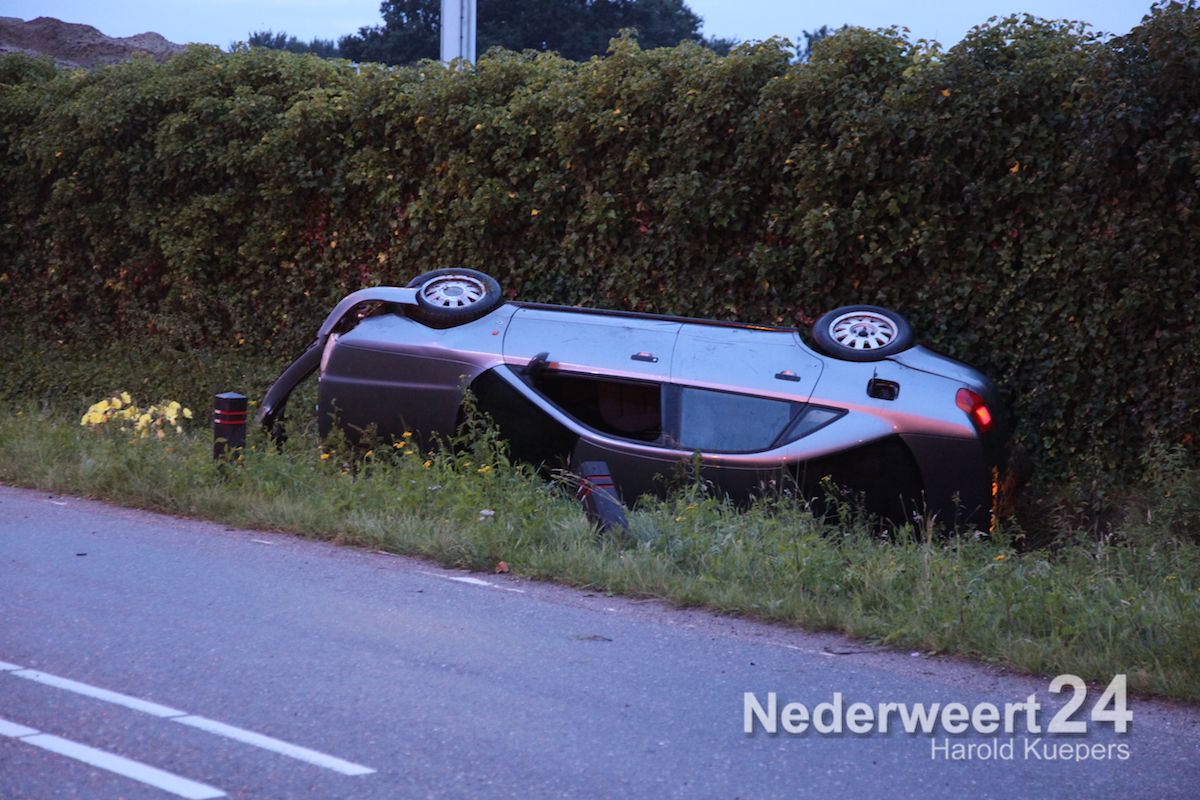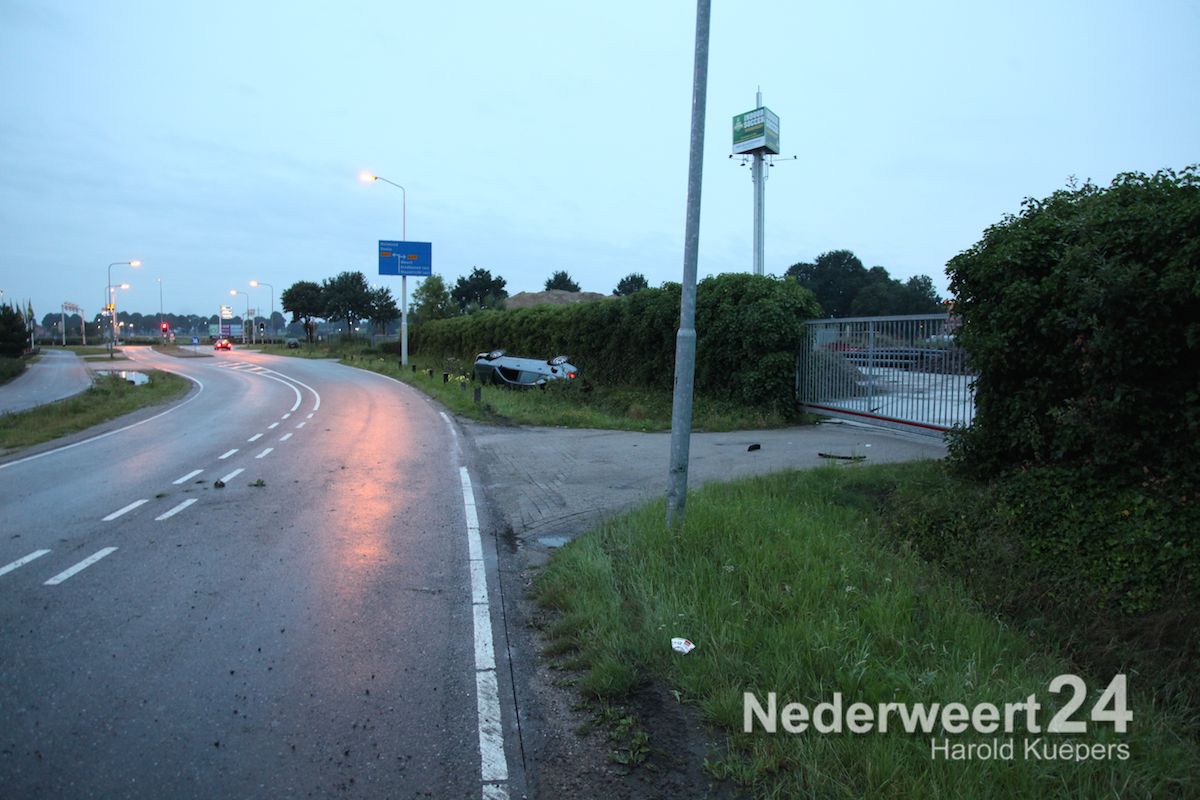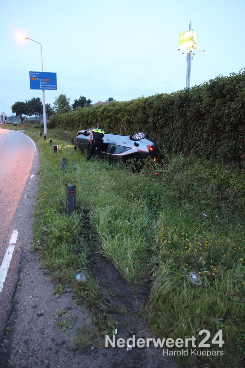 Woensdagavond is een auto over de kop in de sloot gevlogen op de Randweg West ter hoogte van Win Casino in Nederweert.