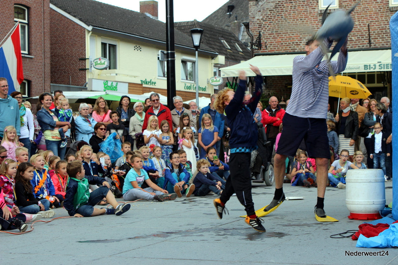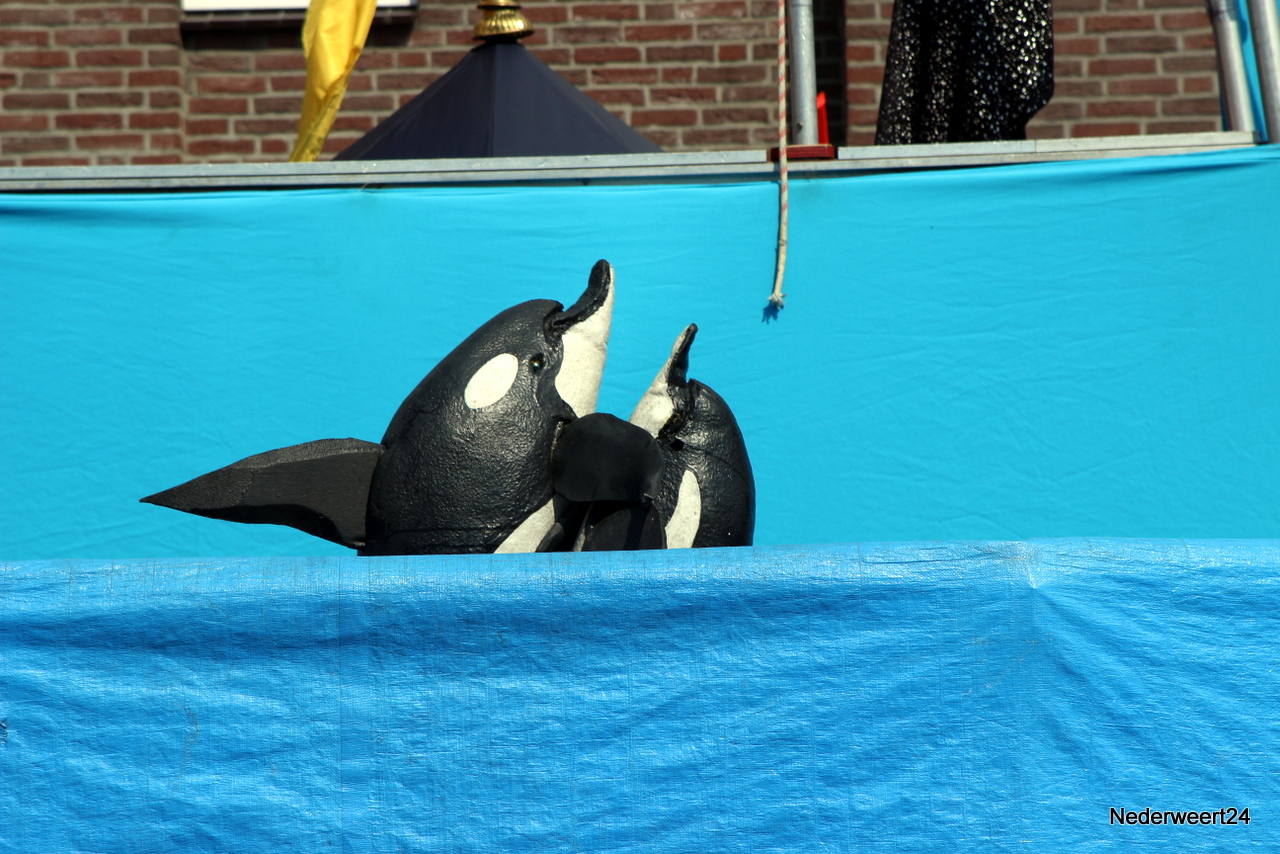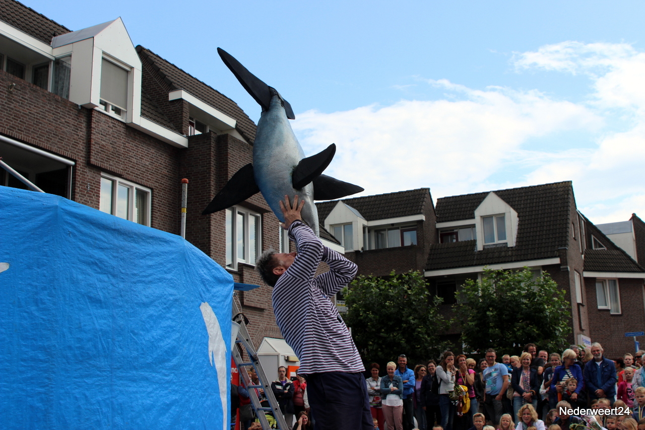 Zaterdagmiddag aansluitend aan de intocht van de wandel 4 daagse ging op het Lambertushof in Nederweert het Limburg Festival van start. Op het programma stonden vandaag 2 voorstellingen. Theatergroep Hilaria mocht met hun act Dolfinarium de spits afbijten. Zij presenteerden een circusvoorstelling met muziek, humor, vrijwilligers en schuimrubberen dolfijnen. Veel wandelaars van de 4 daagse bleven nog even op het Lambertushof waardoor het tijdens de voorstelling lekker druk was.