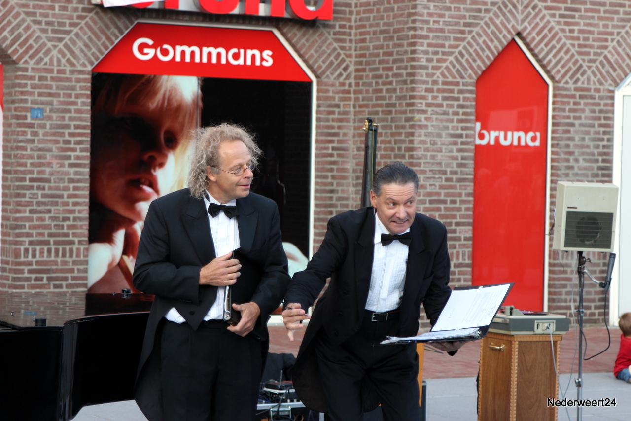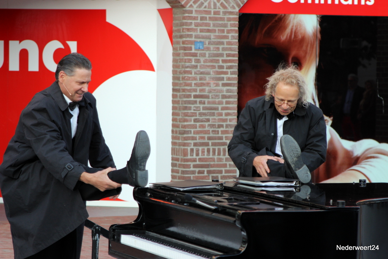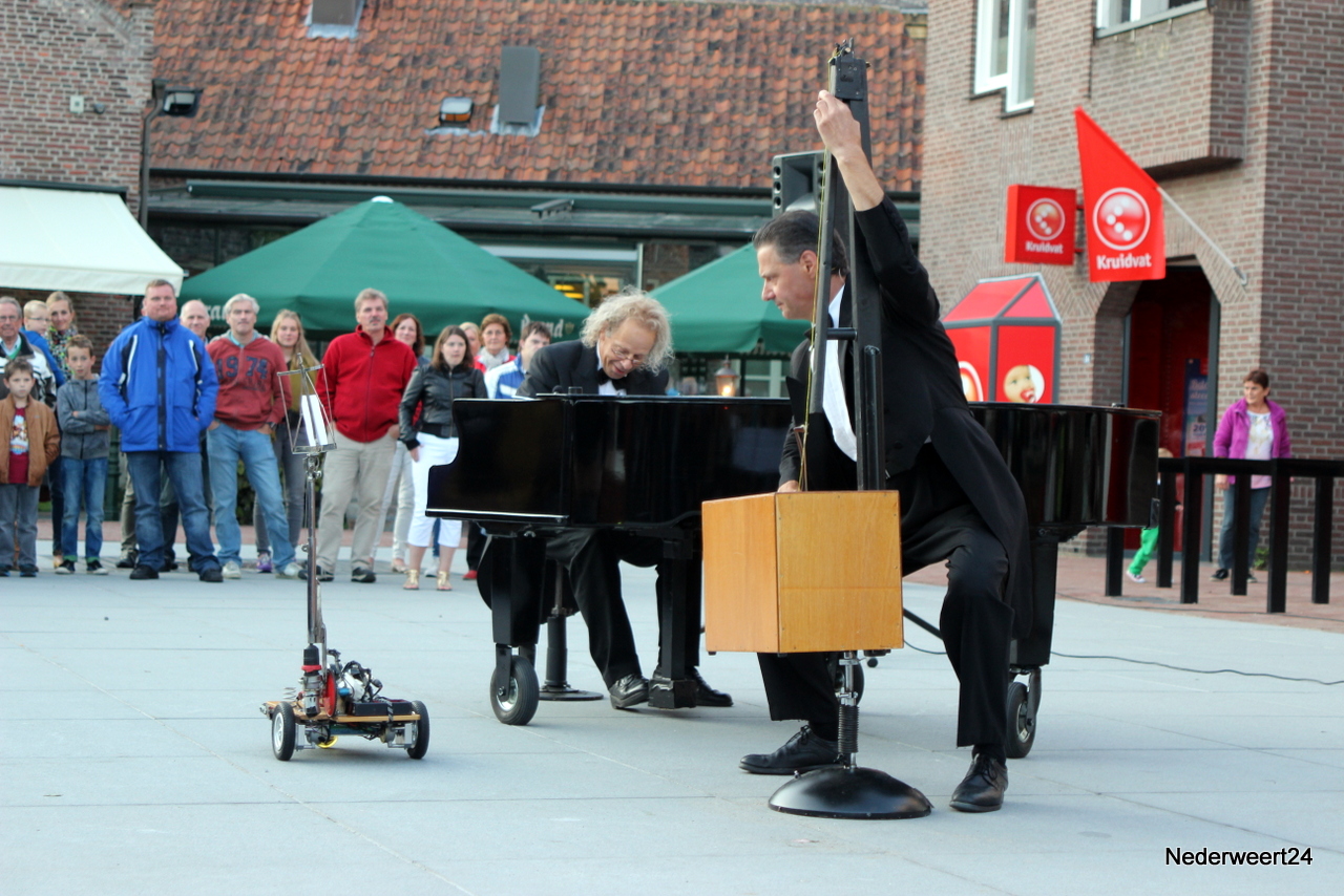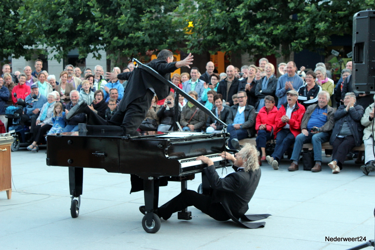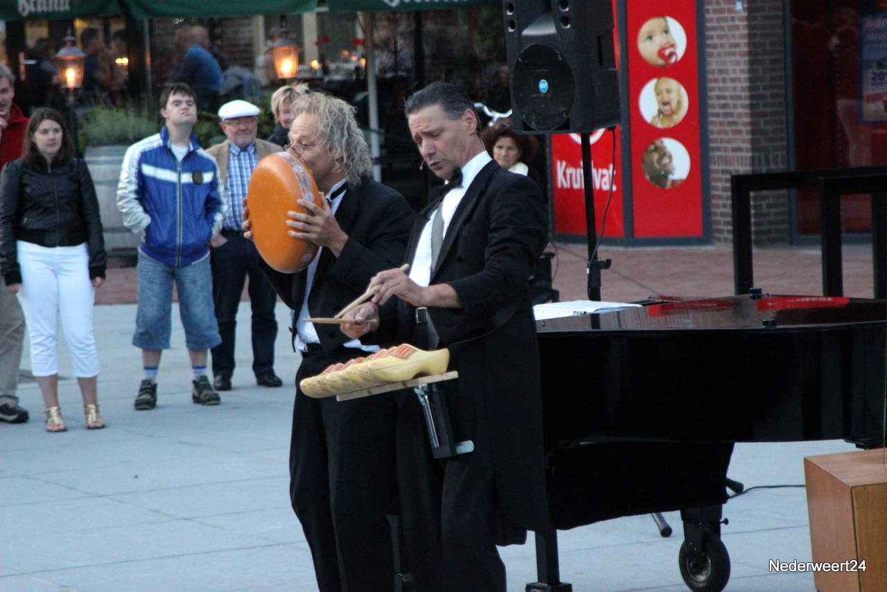 Zaterdagavond om 20.00 uur betraden het duo Stenzel en Kivits het plein om hun voorstelling The impossible concert voor te dragen. Zij maakten er inderdaad een onmogelijk concert van. Het publiek kon dit oerkomisch muzikaal cabaret wel waarderen en na afloop klonk er een unaniem we want more. Om de tijd tussen de twee voorstelling op te vullen bleven een aantal winkels langer open en was er zelfs live muziek. Zondag zijn er nog 2 voorstellingen van het Limburg Festival. Om 15.00 uur kun je kijken naar Fratelli Fiasco met De Dwerg en om 17.00 uur is er een optreden van Sid Bowfin. Beide voorstellingen zijn gratis toegankelijk. Tevens is er morgen koopzondag van 13.00 uur tot 18.00 uur.