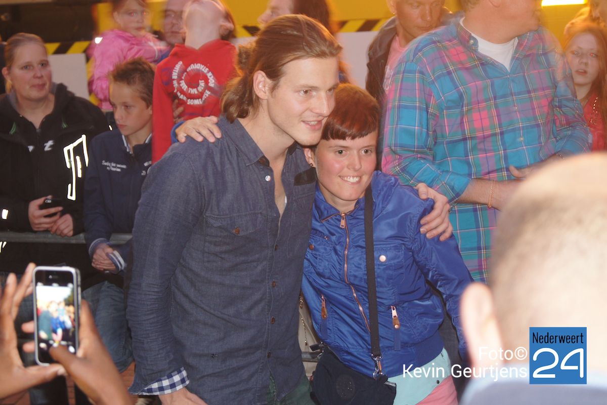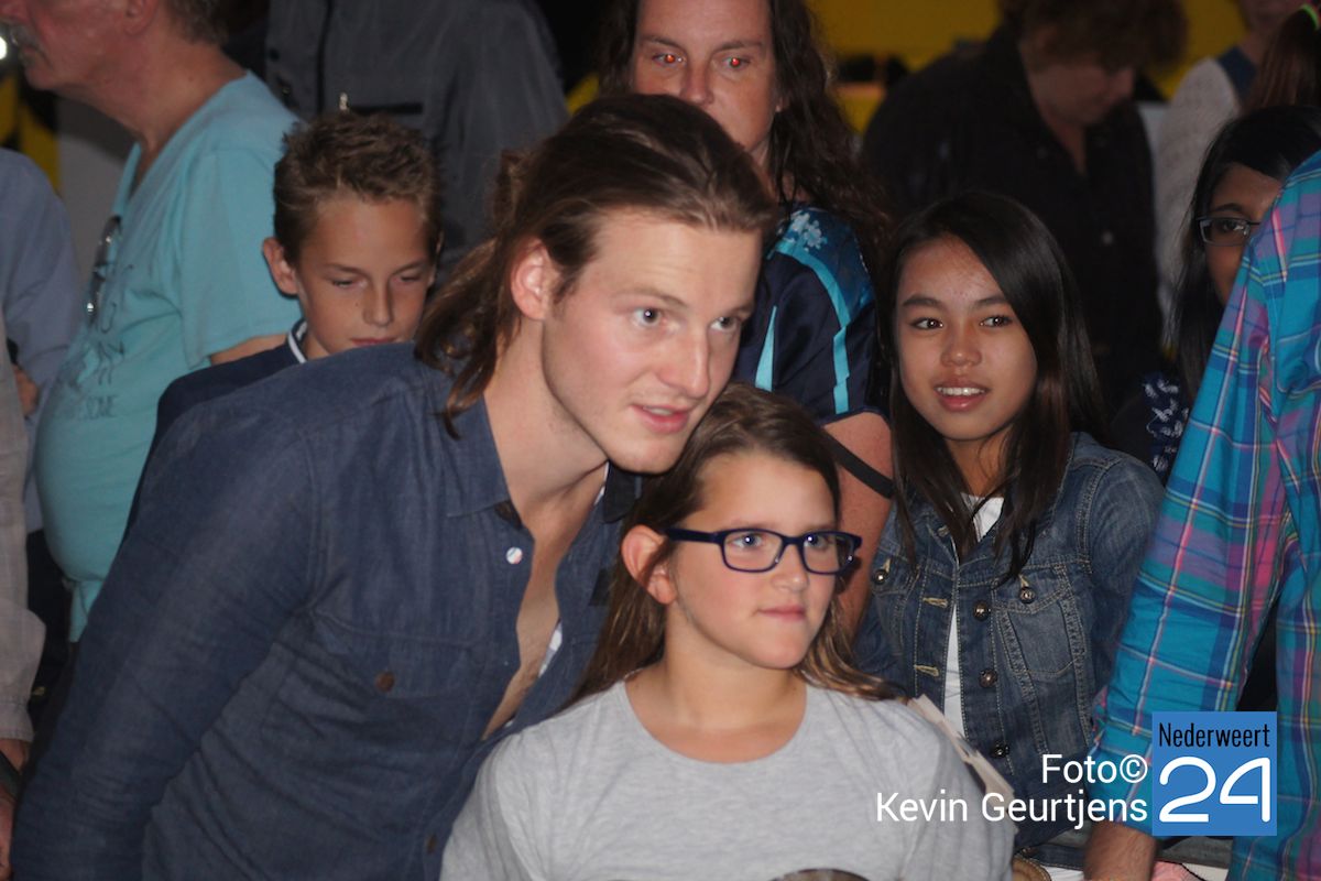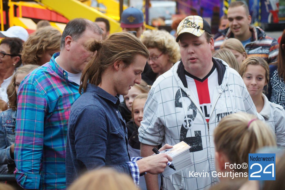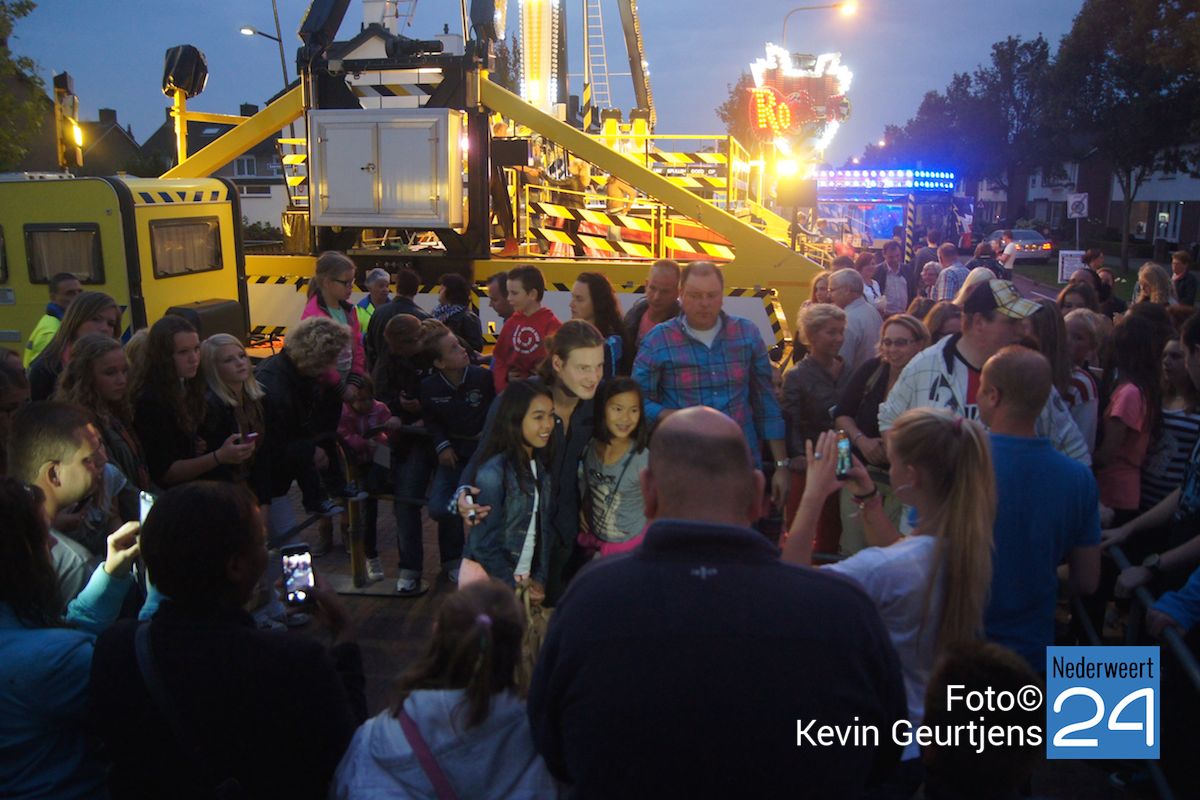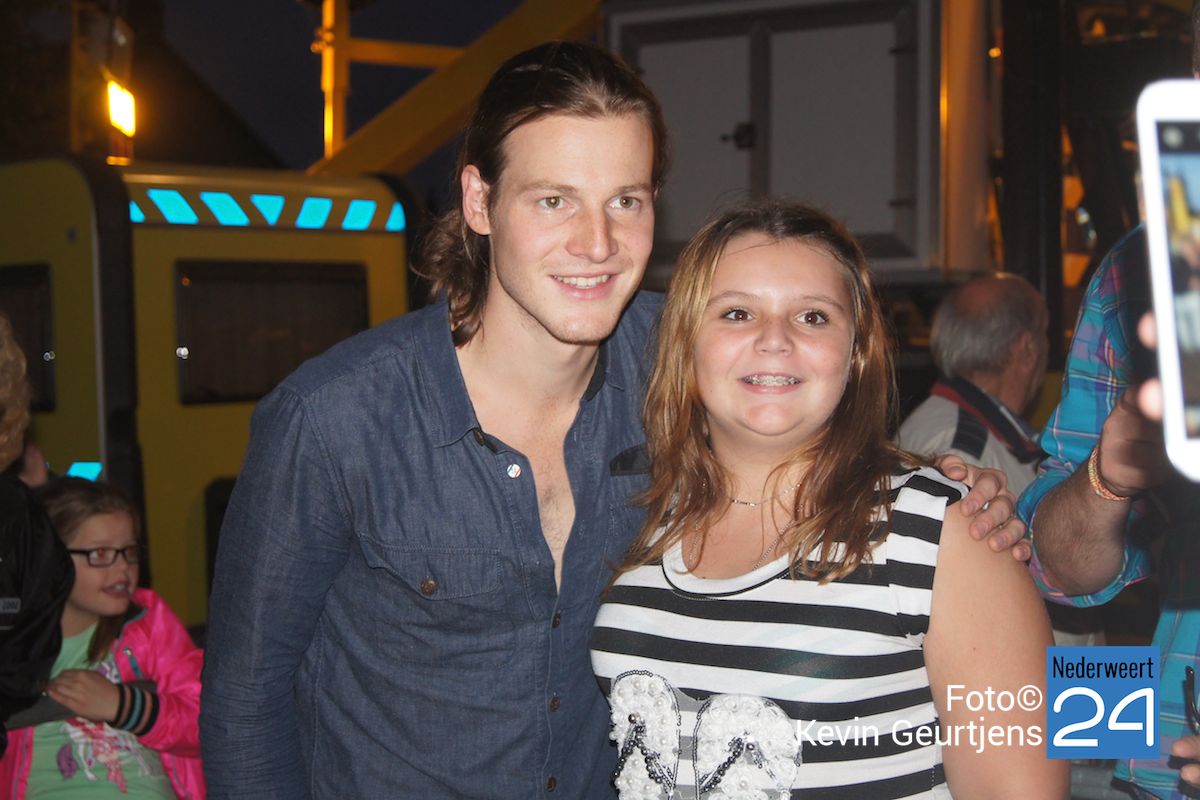 De aankondiging zorgt altijd voor een toestroom van mensen en vooral jeugdige dames die dolgraag een handtekening en op de foto willen met deze “hunk”. Gezellige drukte op de laatste dag van de succesvolle kermis in Nederweert.