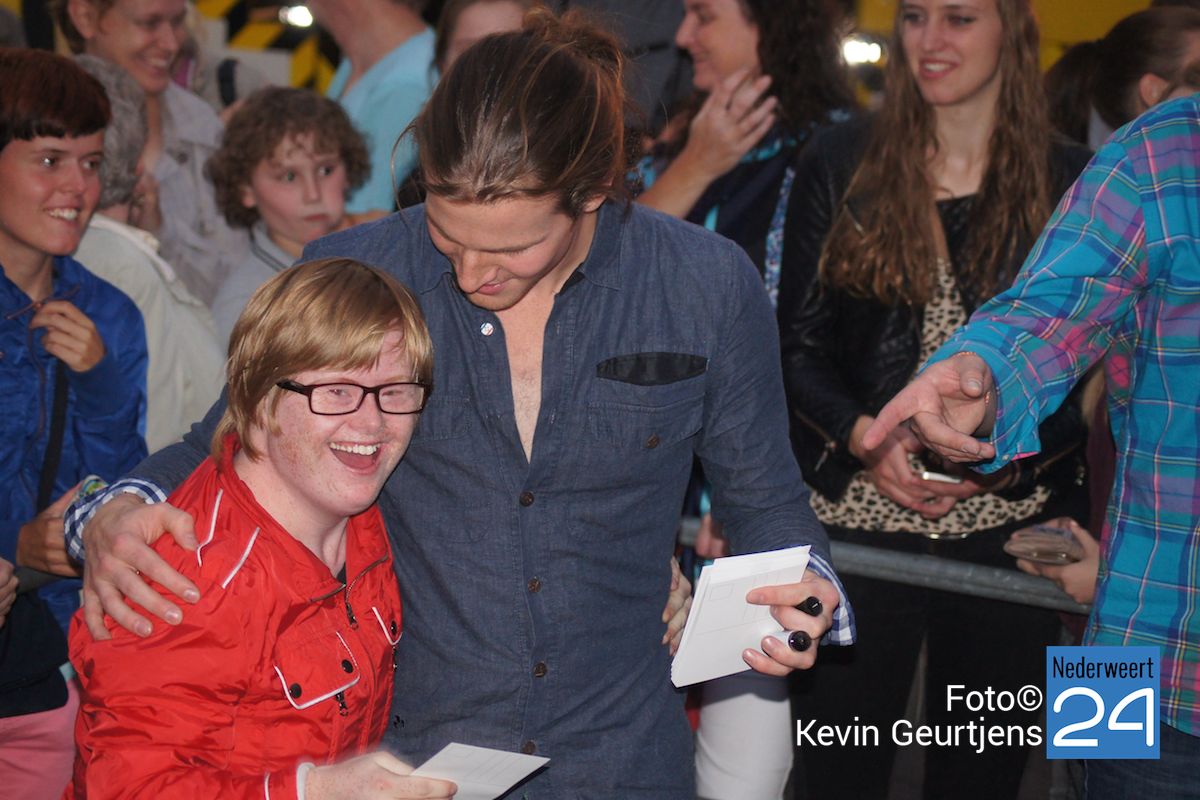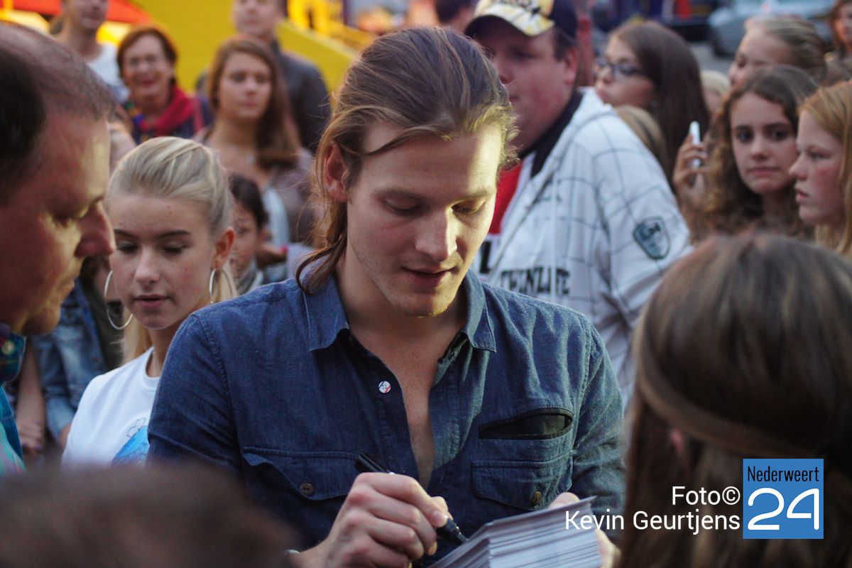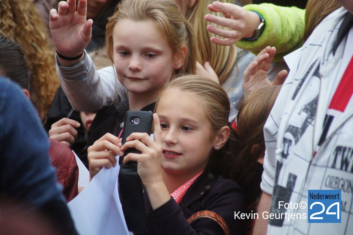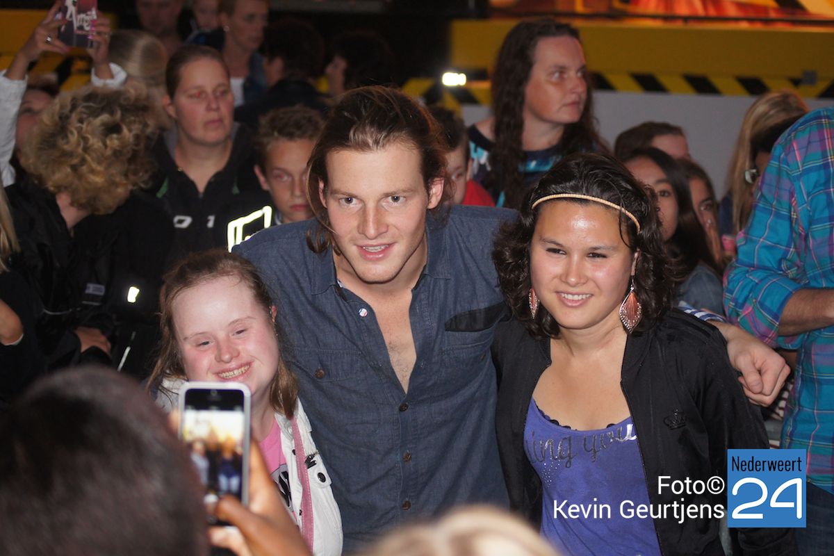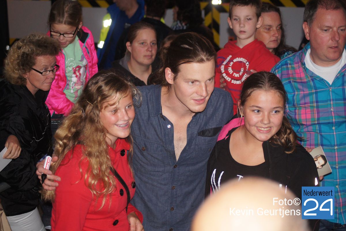 De aankondiging zorgt altijd voor een toestroom van mensen en vooral jeugdige dames die dolgraag een handtekening en op de foto willen met deze “hunk”. Gezellige drukte op de laatste dag van de succesvolle kermis in Nederweert.