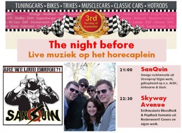 Aansluitend speelt op het Horecaplein vanaf 21:00 uur de band SanQuin, een stevige rockformatie uit Stramproy met eigen werk geïnspireerd door o.a. ACDC en Airbourne & Slash. Om 22:30 uur zal Skyway Avenue uit Nederweert een spetterend optreden verzorgen met enthousiaste BluesRock & PopRock, covers en eigen werk. Bij Wups Pub en Café de Schans zullen DJ’s zorgen voor de muziek.