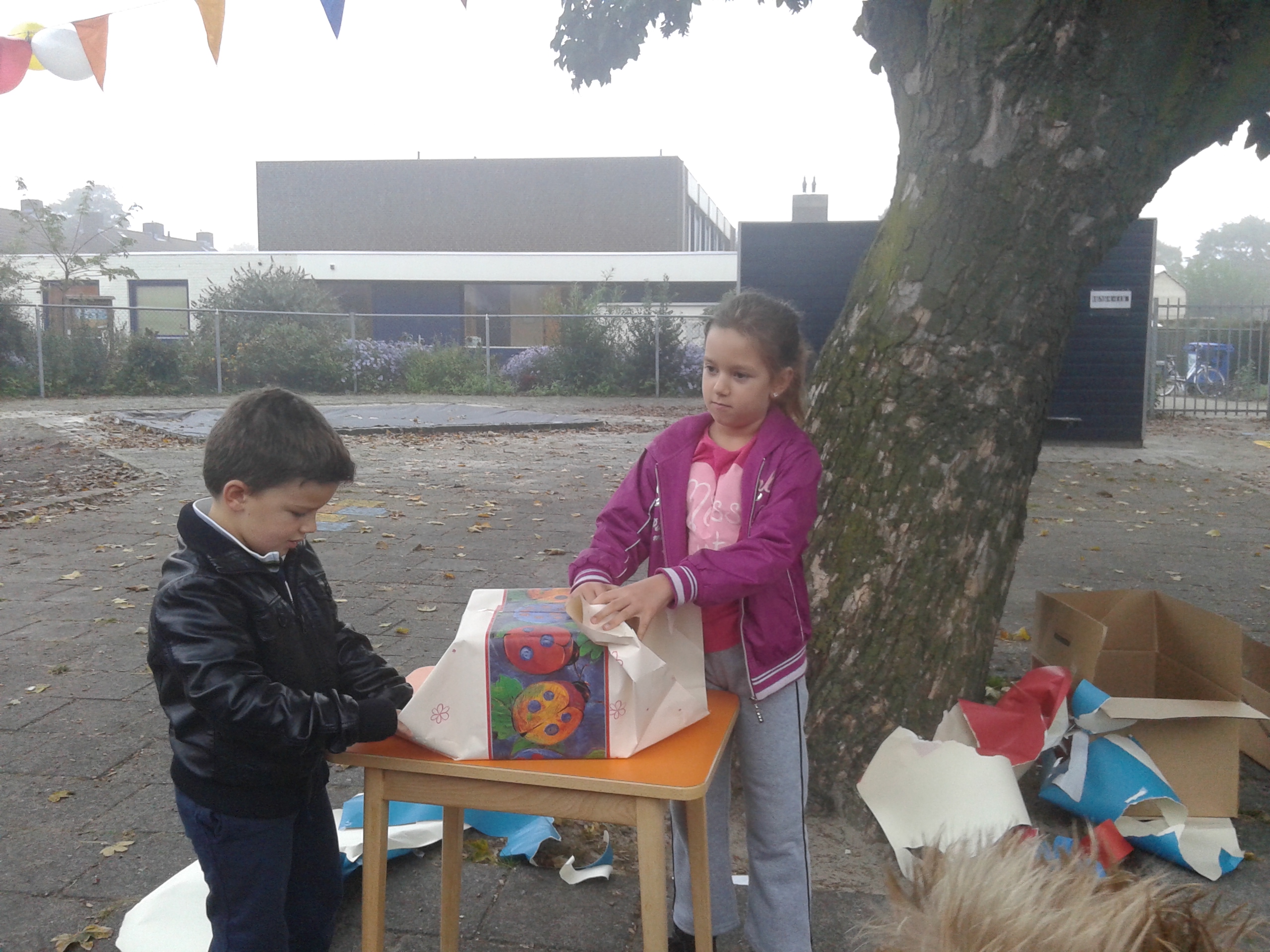 Toen het cadeau werd uitgepakt, verscheen er weer een nieuw cadeau en een nieuwe vraag. Zo ging het door totdat er nog maar een klein pakje over was. Hierin zat een briefje met een verwijzing naar het echte cadeau, nieuwe boeken over het thema “Feest”.