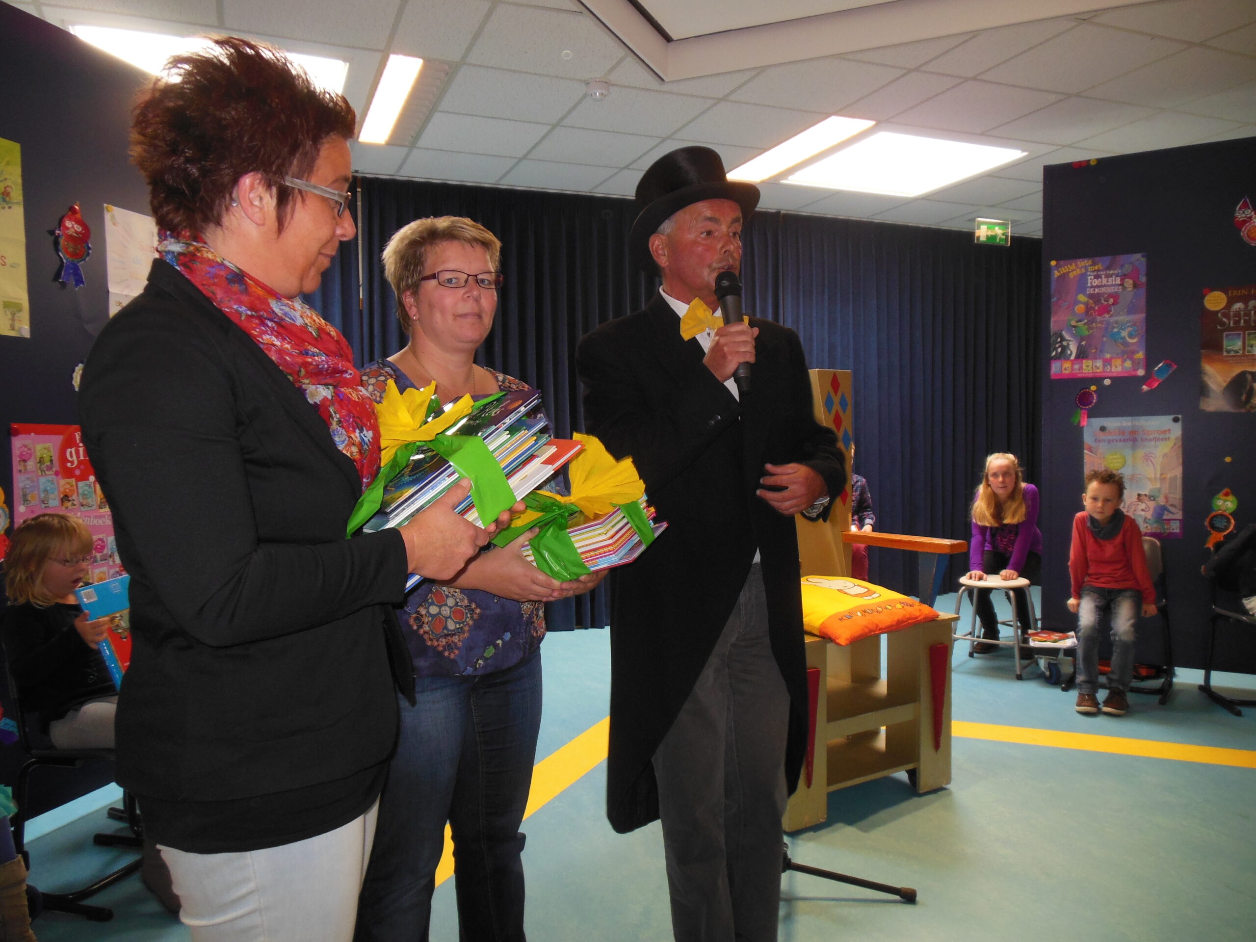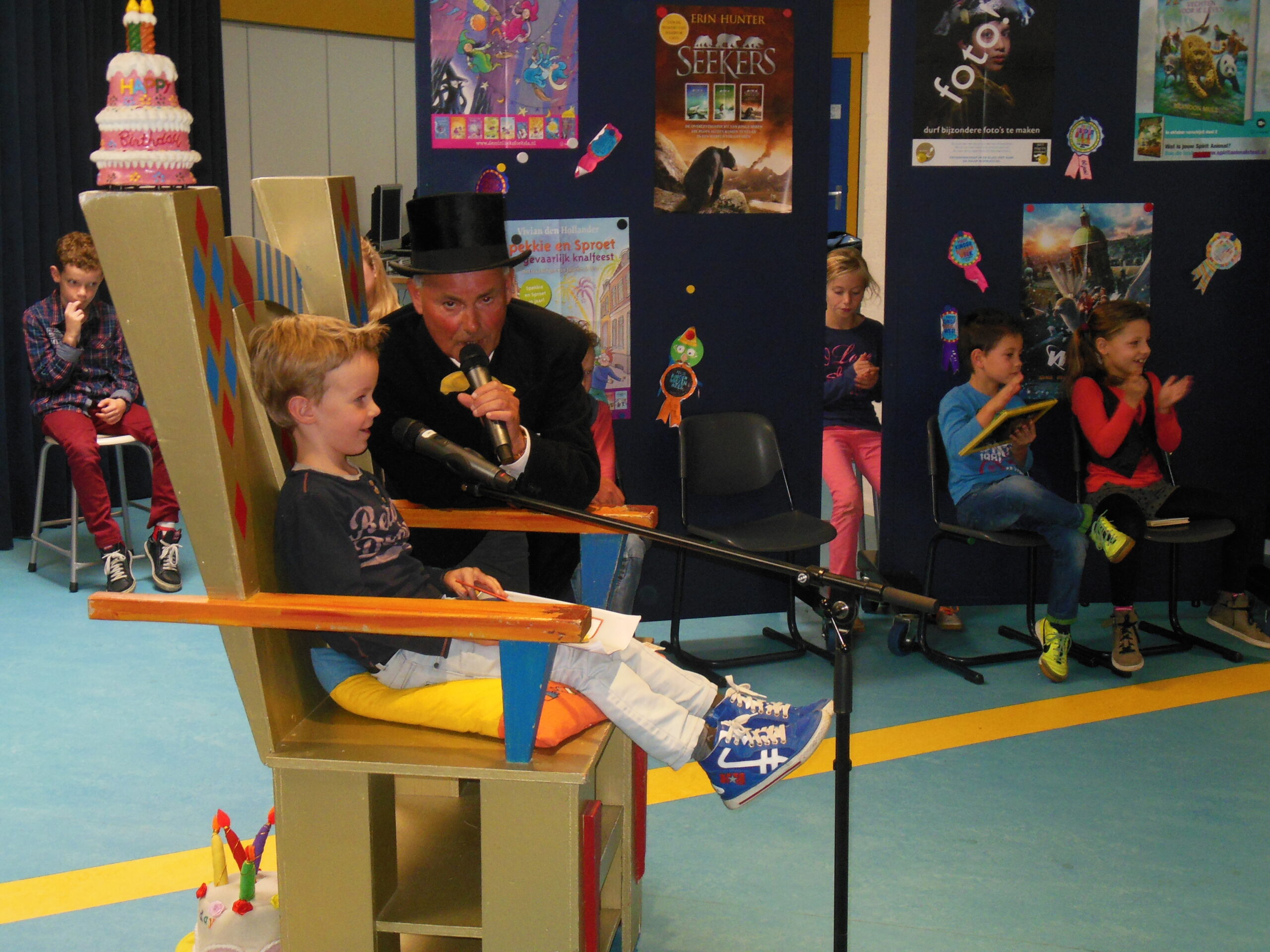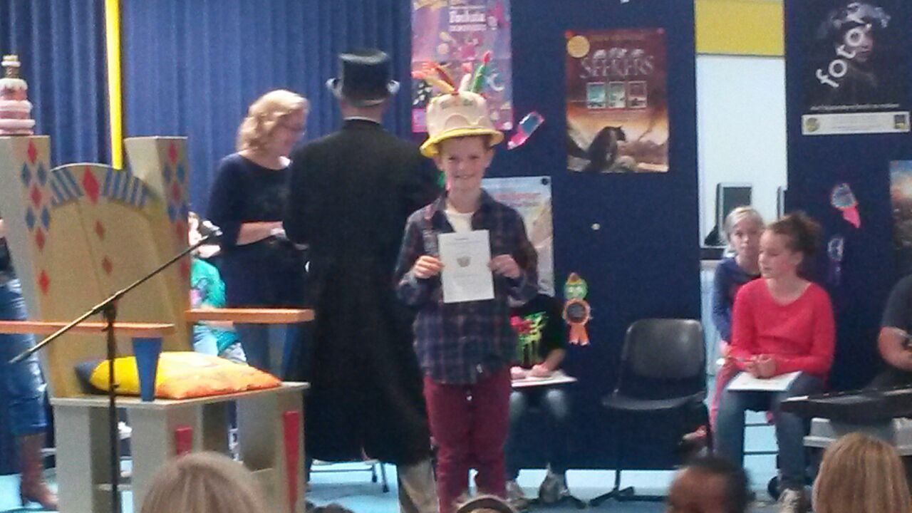 In de voorafgaande weken hebben alle kinderen volop genoten van allerlei aanbod van kinderboeken en hebben ze heerlijk kunnen “snoepen” van allerlei “leesvoer.” Ook de kleuters streden mee voor de titel: Voorleeskampioen. Met de nodige muziek door de DJ, de spreekstalmeester Wim en de muzikale inbreng van verschillende leerlingen werd het een erg gezellig geheel. Uiteindelijk heeft een deskundige jury de winnaars bekend gemaakt en konden ze dit project afsluiten met een fantastisch boekenaanbod, aangeboden door de ouders die de kledingbeurs organiseren. Na de herfstvakantie kan er weer volop gelezen worden!
