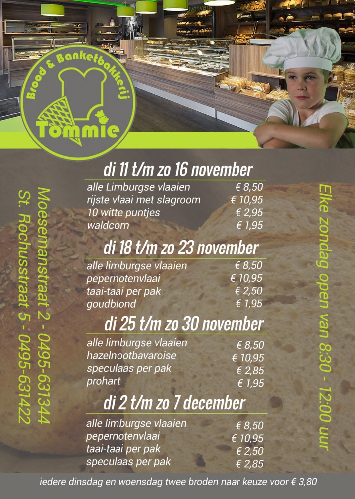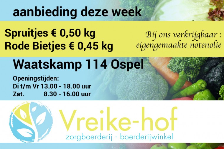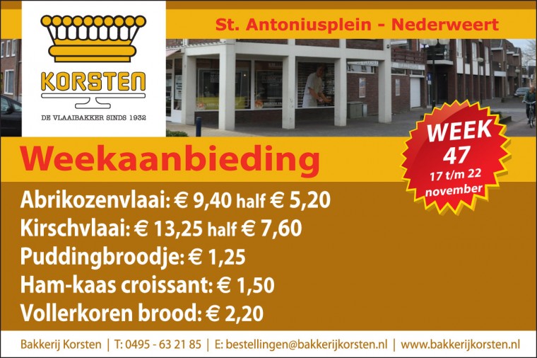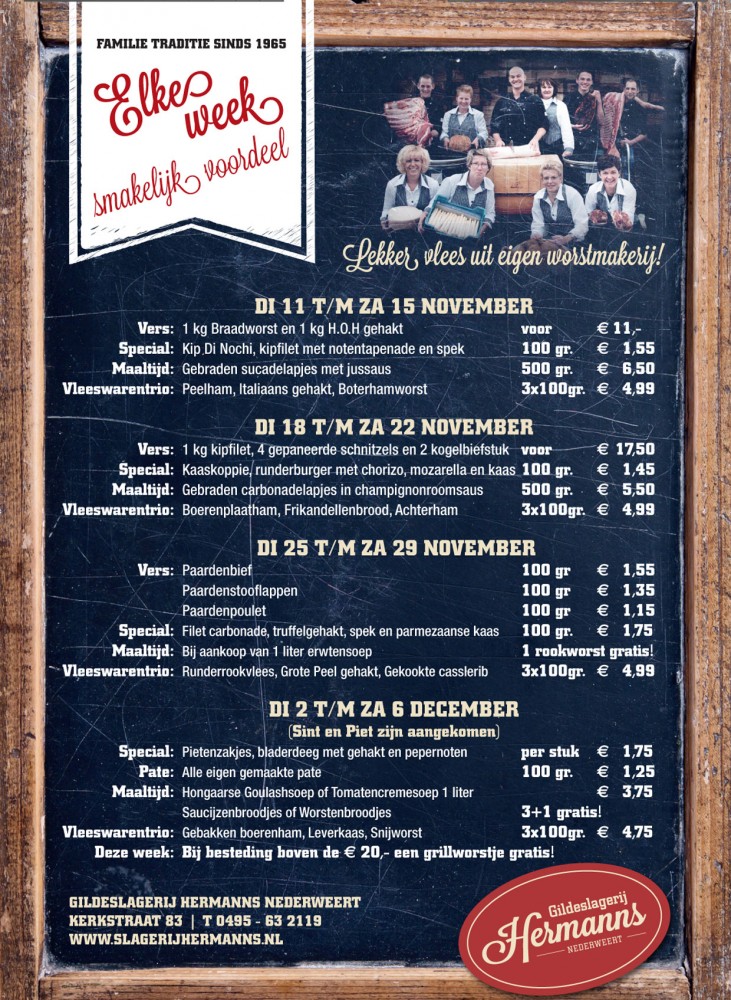 Aanbiedingen van slagerij Thijs Kuepers, bakker Bongers, bakker Korsten, bakker Tommie, Slagerij Hermanns en boerderijwinkel Vreike-hof.