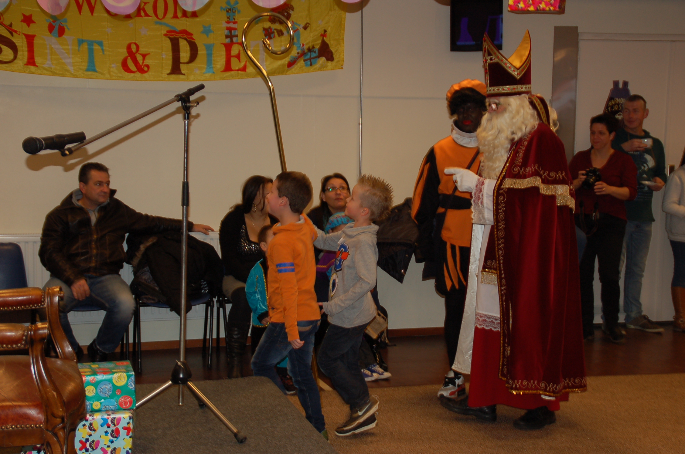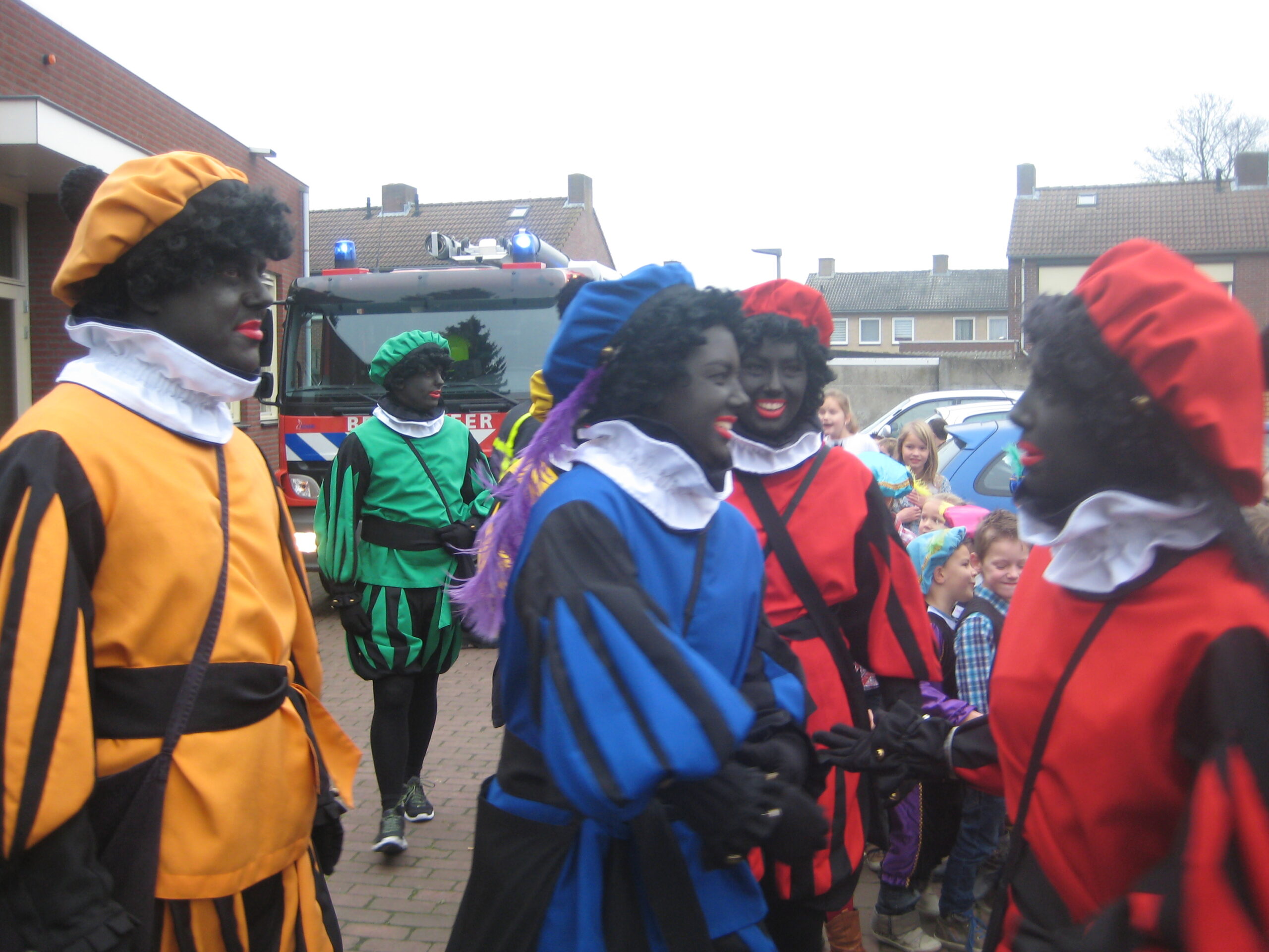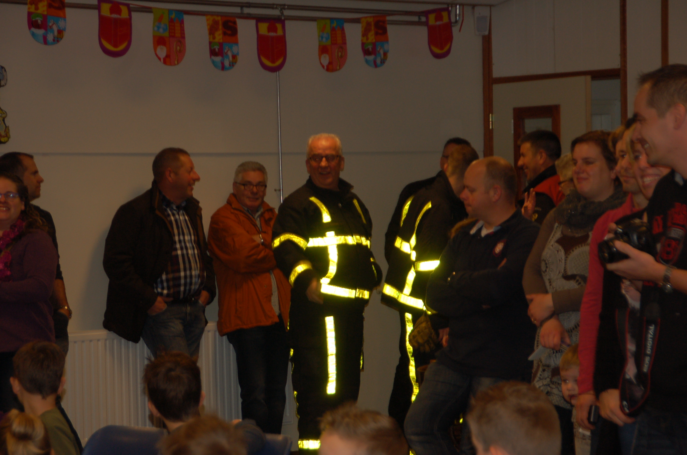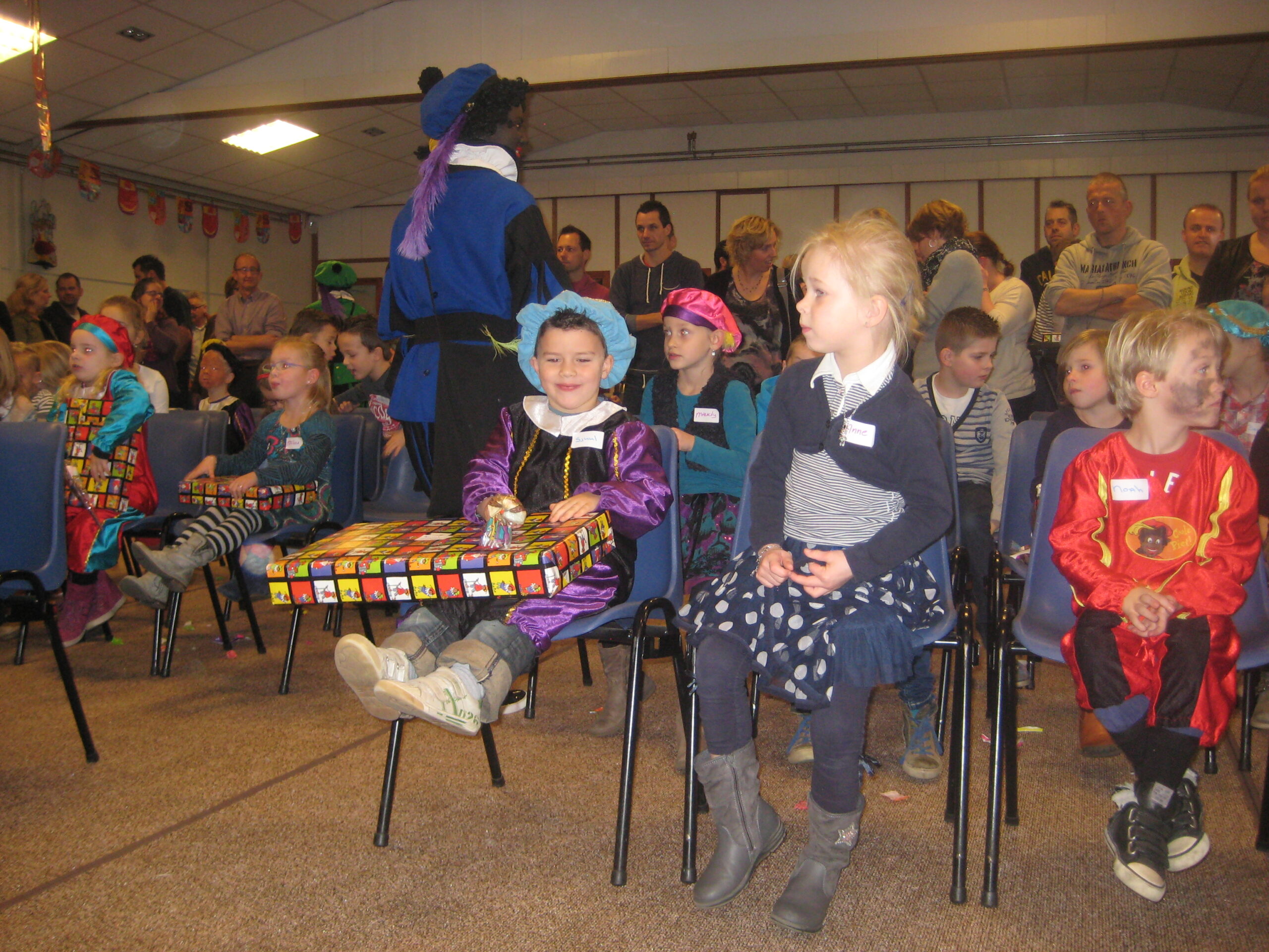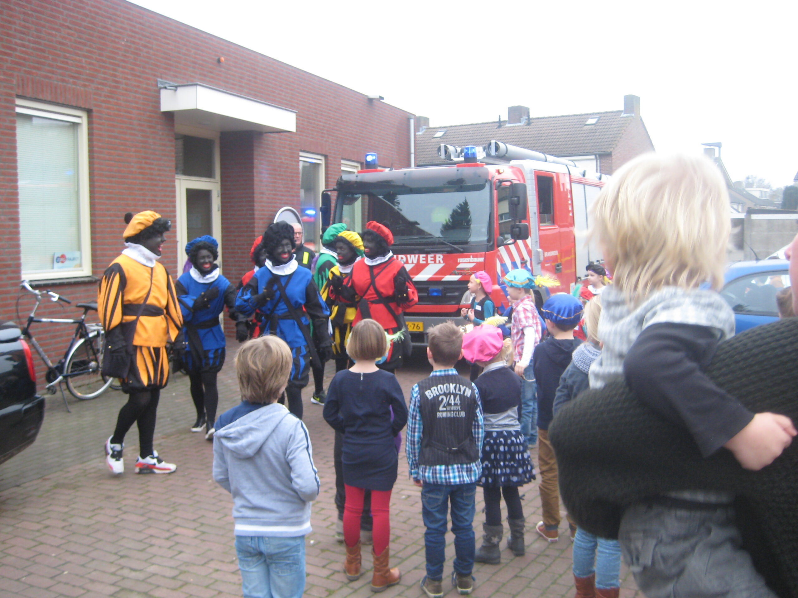 De kids zaten vol verwachting netjes op hun stoeltjes te wachten toen Sinterklaas met maar 1 Piet binnenkwam. Hier klopte natuurlijk iets niet. Sint wilde net gaan vertellen toen buiten de brandweersirene klonk….alle kindjes gingen kijken buiten maar er was geen brand; er kwamen allemaal Pieten uit de brandweerwagen. Snel naar binnen om het kinderfeest voort te zetten. De Pieten deden dansjes en deelden pepernoten uit maar kwamen tot de ontdekking dat ze de cadeaus kwijt waren…hadden ze ze in de brandweerwagen achtergelaten? Samen met een paar kinderen gingen de Pieten kijken en ze kwamen terug met zakken vol cadeaus.