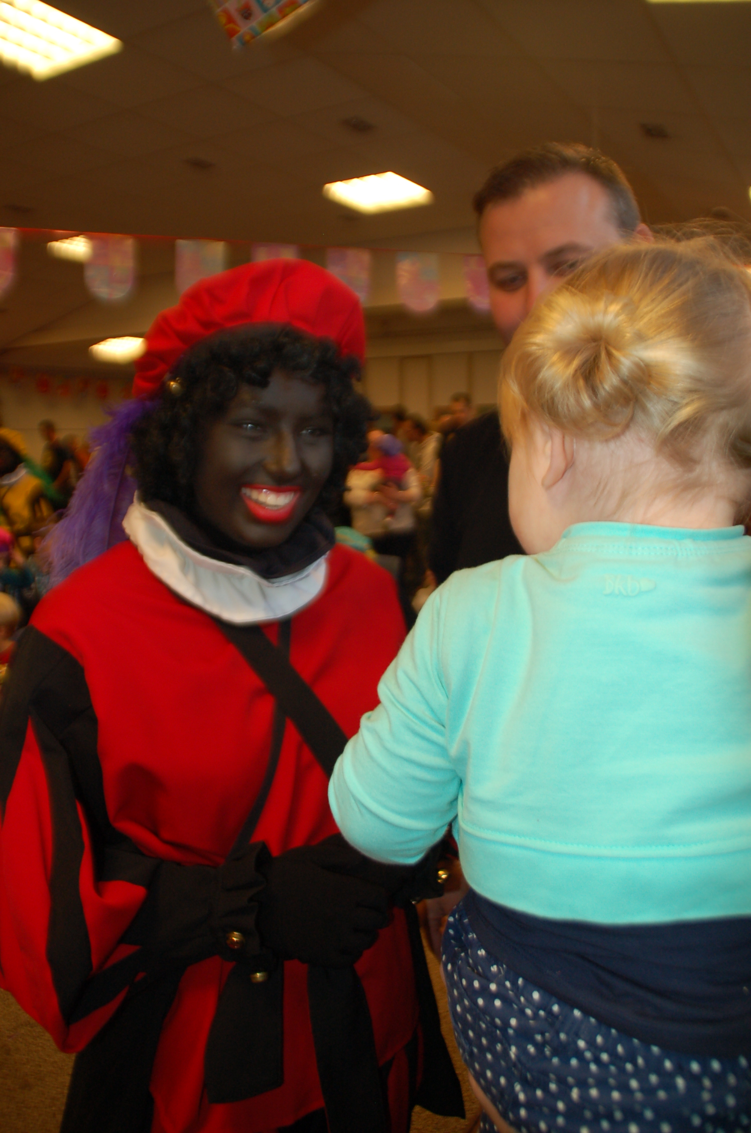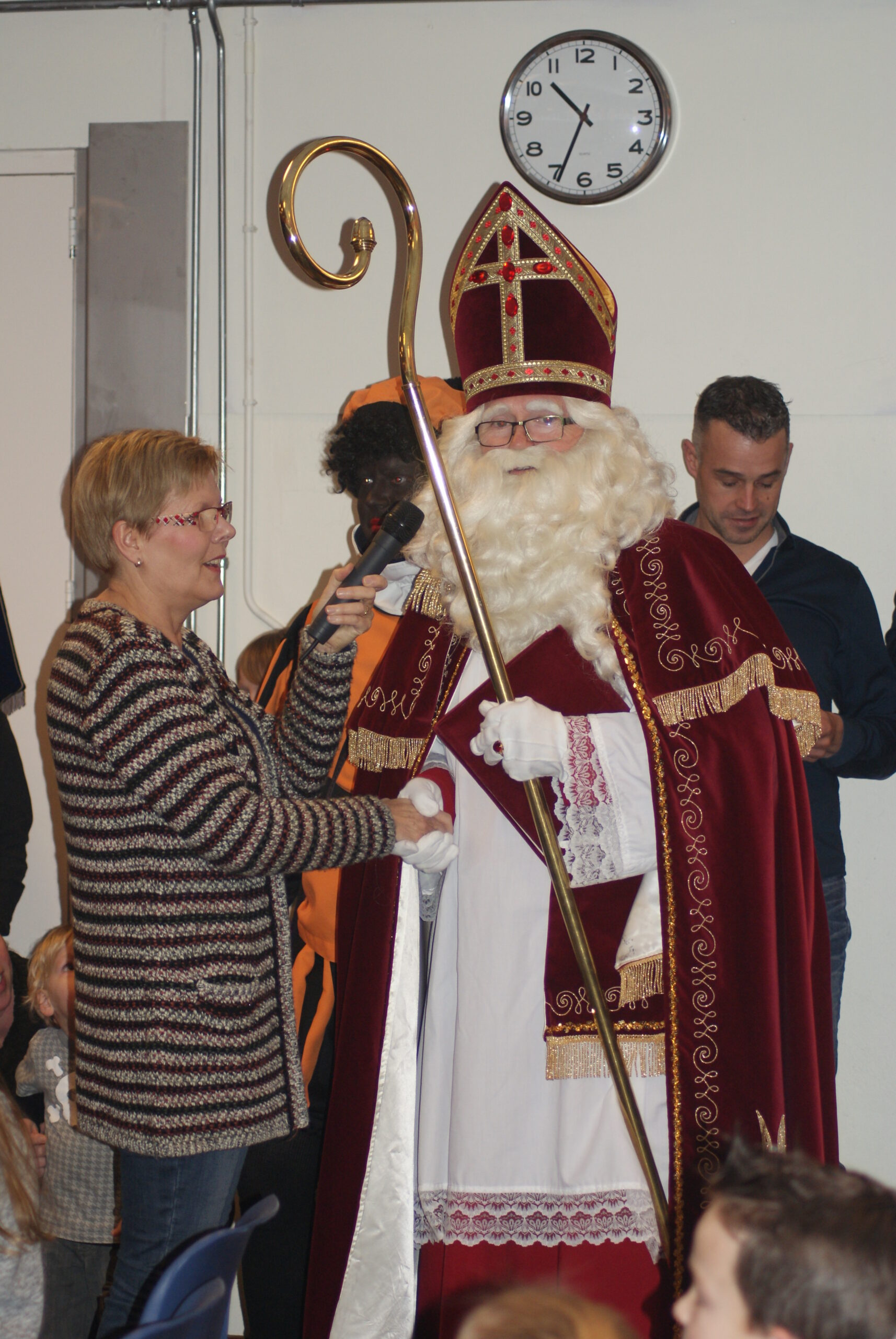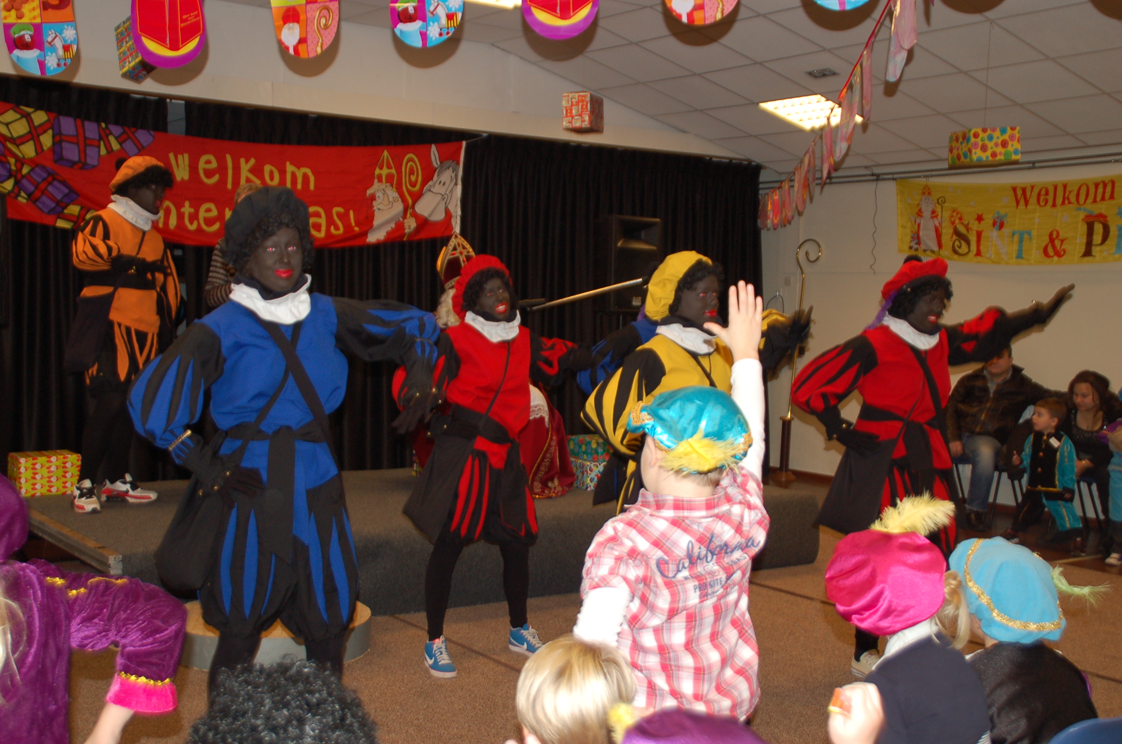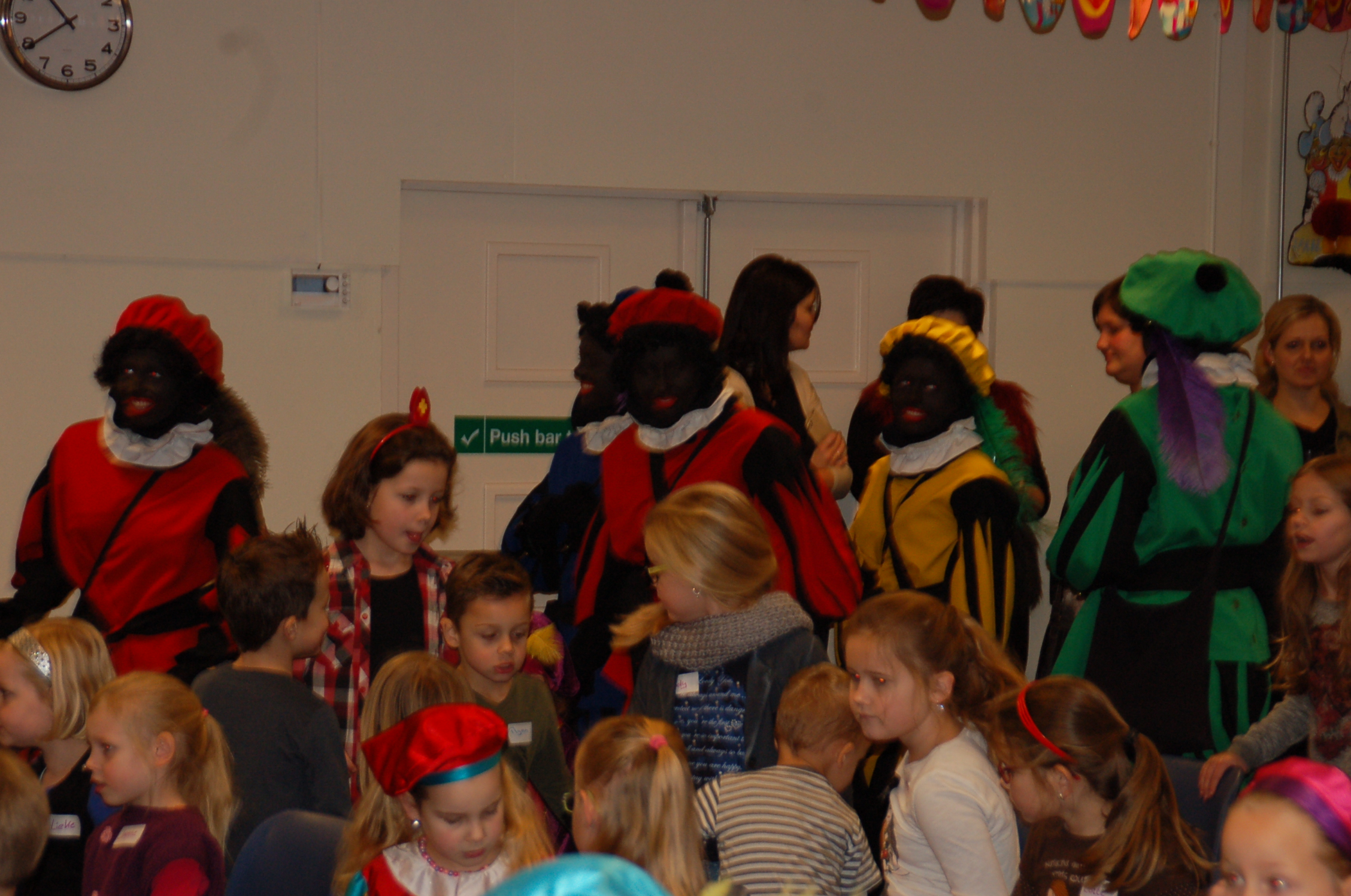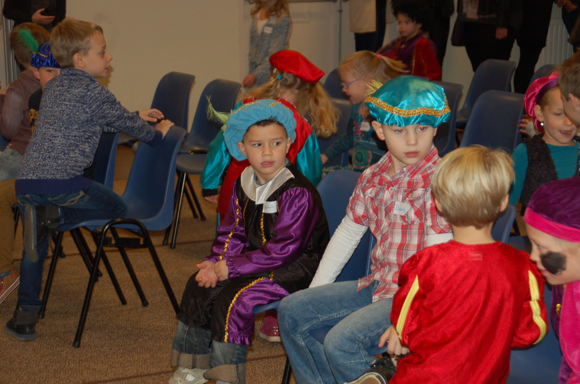 De kids zaten vol verwachting netjes op hun stoeltjes te wachten toen Sinterklaas met maar 1 Piet binnenkwam. Hier klopte natuurlijk iets niet. Sint wilde net gaan vertellen toen buiten de brandweersirene klonk….alle kindjes gingen kijken buiten maar er was geen brand; er kwamen allemaal Pieten uit de brandweerwagen. Snel naar binnen om het kinderfeest voort te zetten. De Pieten deden dansjes en deelden pepernoten uit maar kwamen tot de ontdekking dat ze de cadeaus kwijt waren…hadden ze ze in de brandweerwagen achtergelaten? Samen met een paar kinderen gingen de Pieten kijken en ze kwamen terug met zakken vol cadeaus.