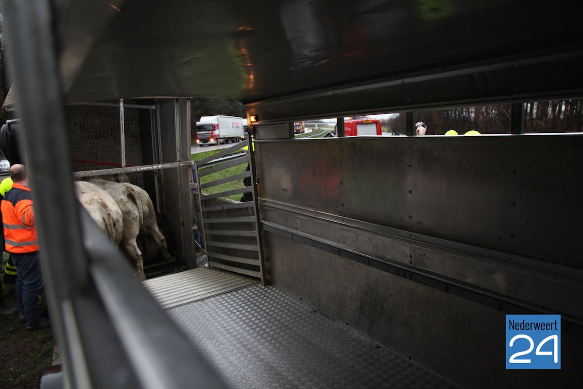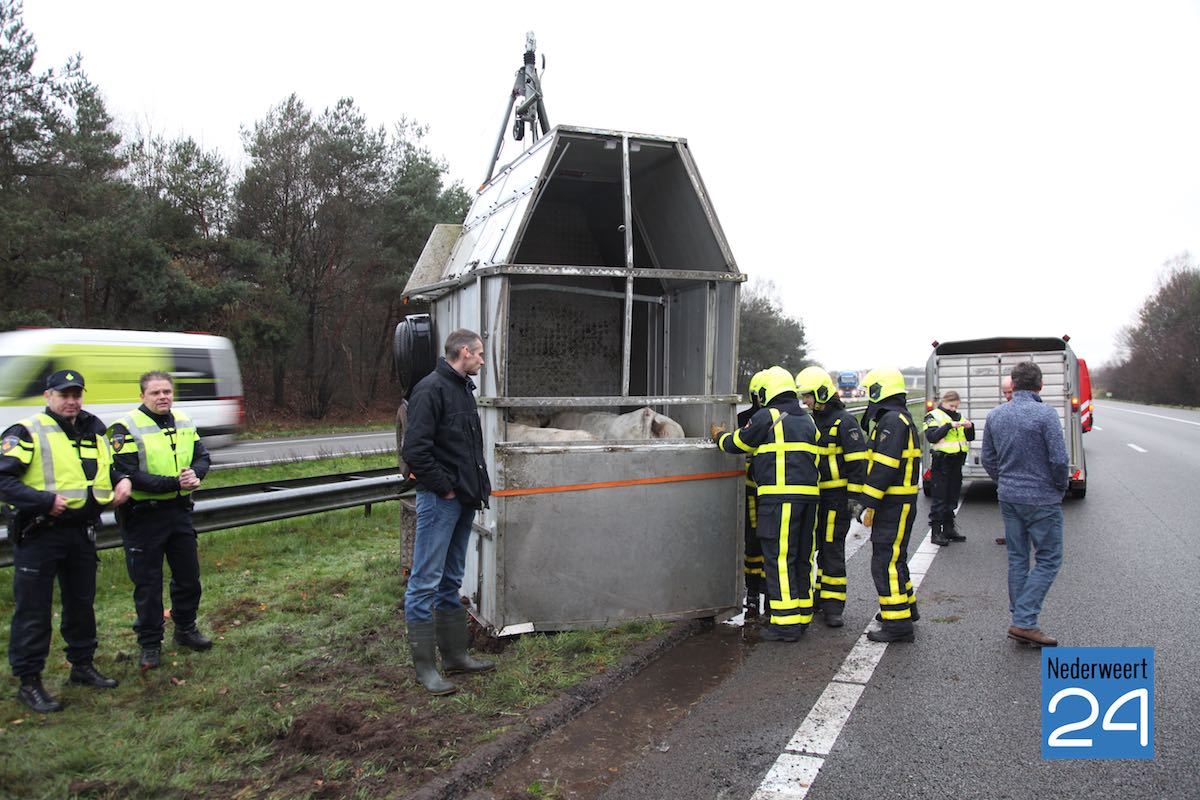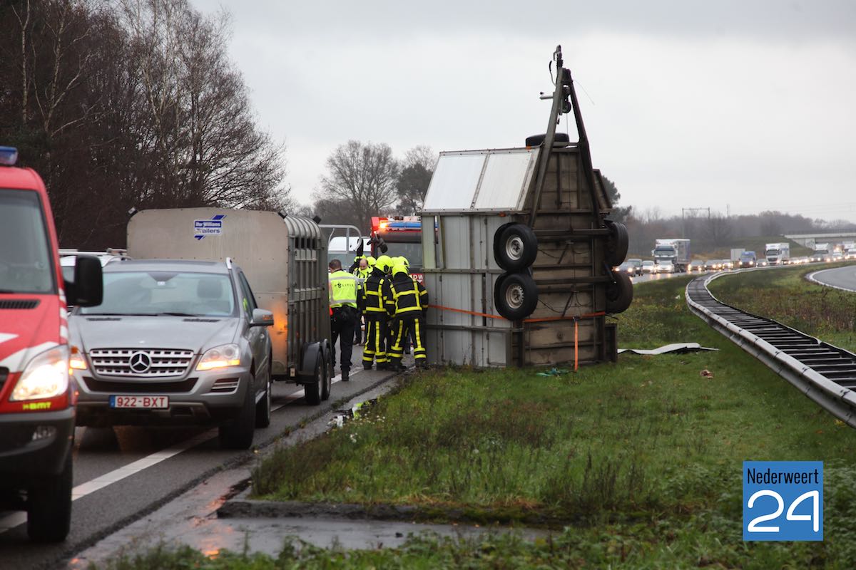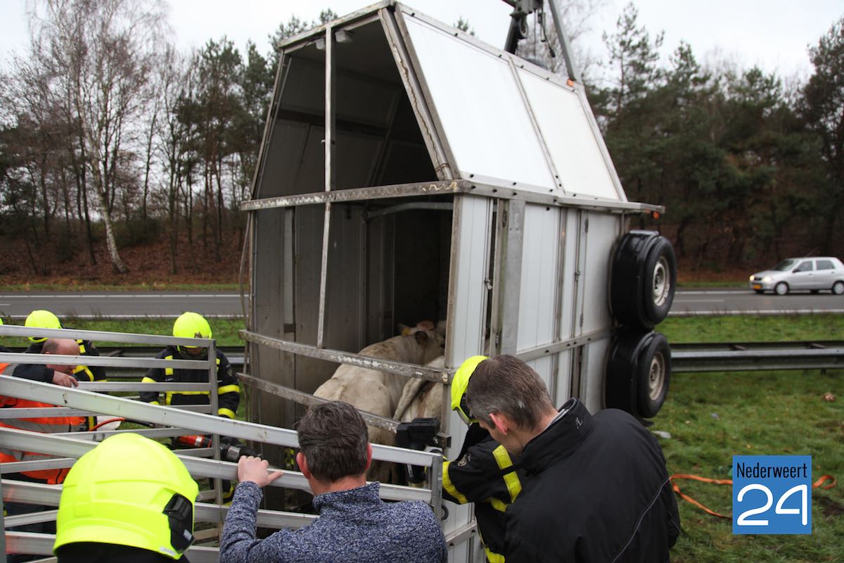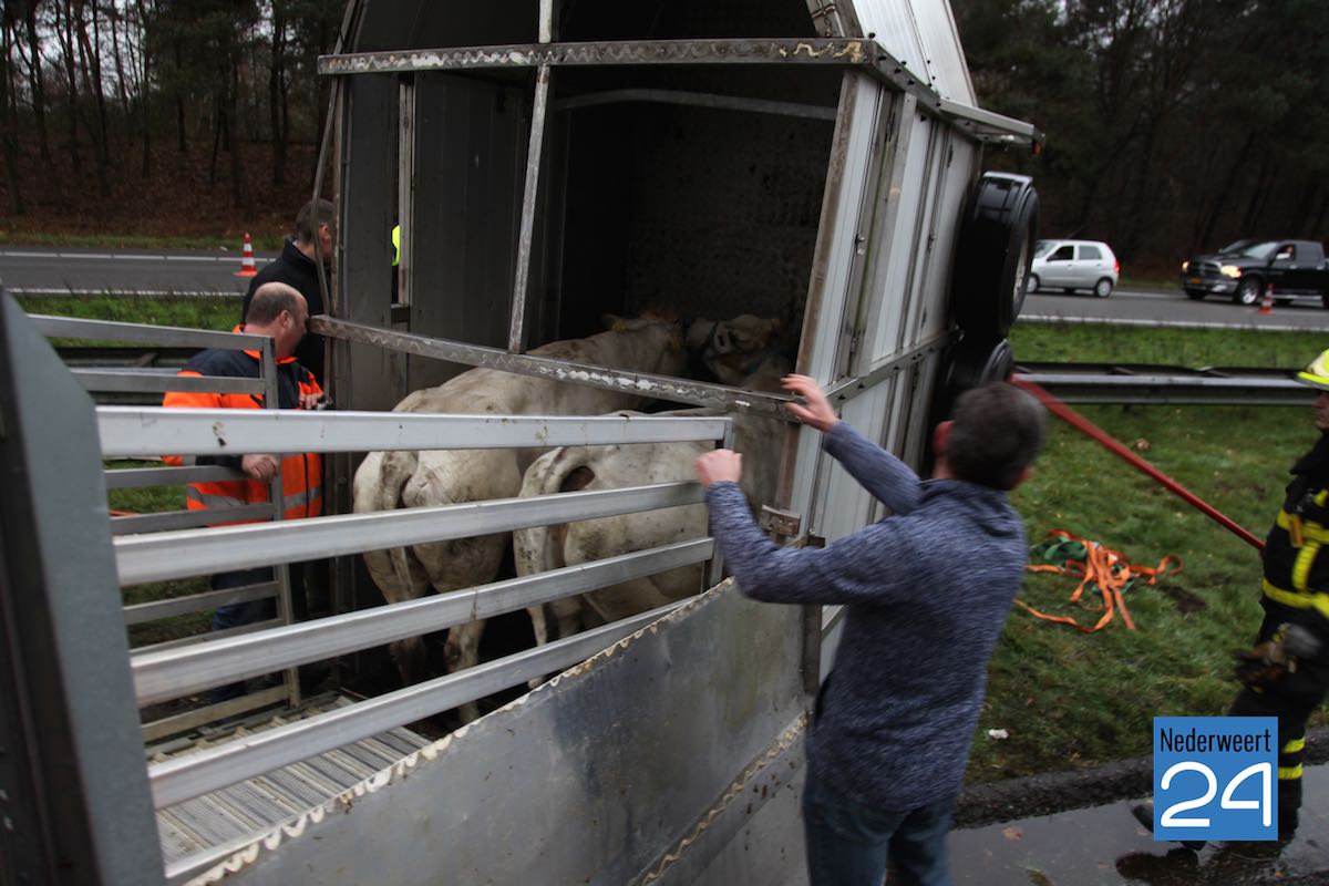 Woensdagmorgen is een trailer met drie koeien gekanteld op de snelweg A2 tussen Kelpen-Oler en Nederweert.