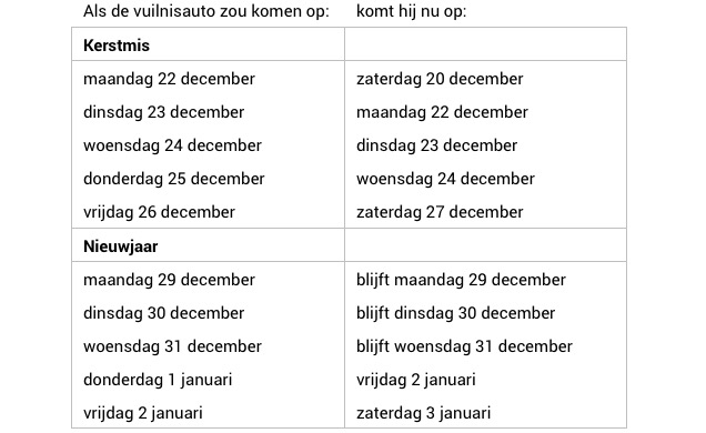 Vanwege Kerstmis en Nieuwjaar wordt een aantal huisvuilroutes gewijzigd. Houd er rekening mee dat de vuilniswagen om 7.00 uur begint te rijden (op zaterdag is dit om 6.30 uur). Verzocht wordt de duobak op tijd klaarzetten, eventueel de avond vóór de ophaaldag. De vuilniswagen kan namelijk op een ander tijdstip langskomen dan je gewend bent.