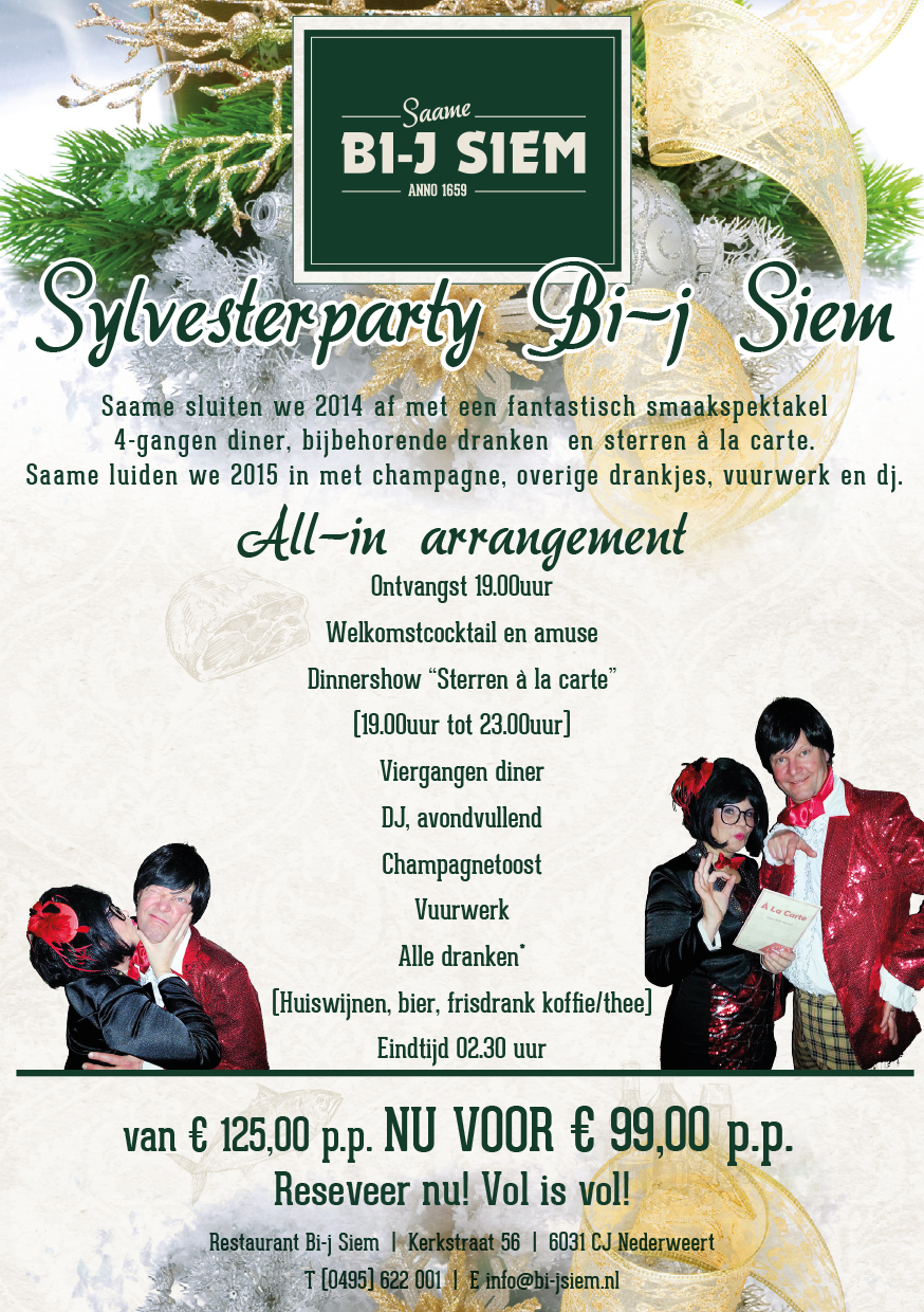 Wil je de Sylvesterparty met je familie, vrienden en/of kennissen saame meebeleven, meld je dan snel aan via 0495 – 622 001 of info@bi-jsiem.nl! Het Sylvester all-in arrangement wordt aangeboden voor de speciale prijs van 99,00 euro per persoon.