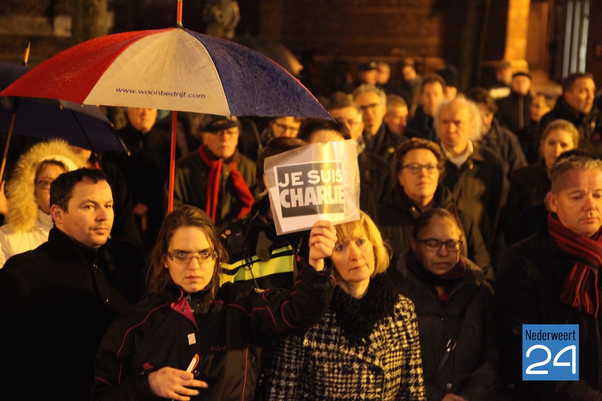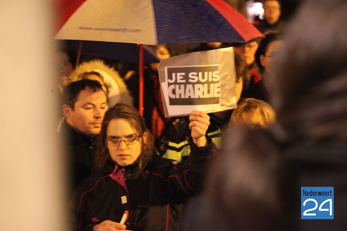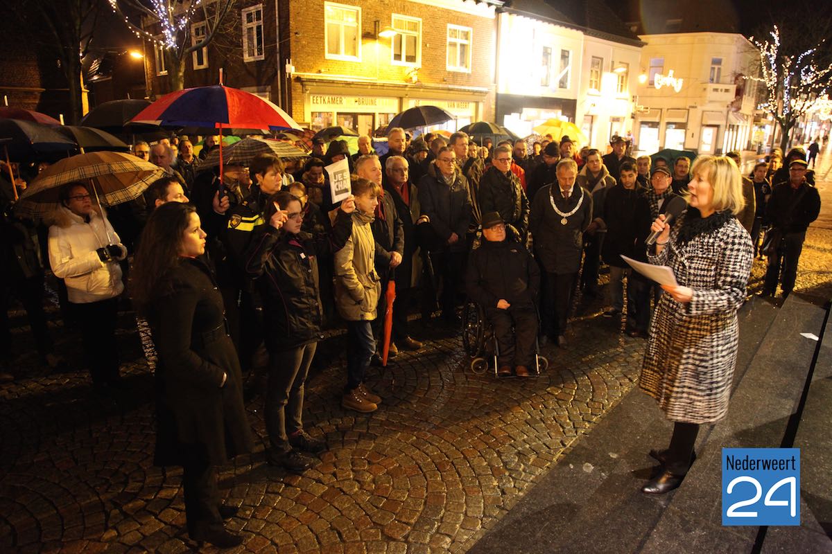 Ondanks het slechte weer waren ruim honderd mensen naar de markt gekomen om de slachtoffers van de aanslag op de makers van het satirische weekblad Charlie Hebdo te herdenken. De eerste spreker was journalist en columnist Gerard Kessels uit Nederweert. Burgemeester Jos Heijmans en gast van de burgemeester Eefje Stribos spraken het publiek toe. De burgemeester noemt tijdens zijn speech de 12 namen van de slachtoffers van de schietpartij in Parijs.