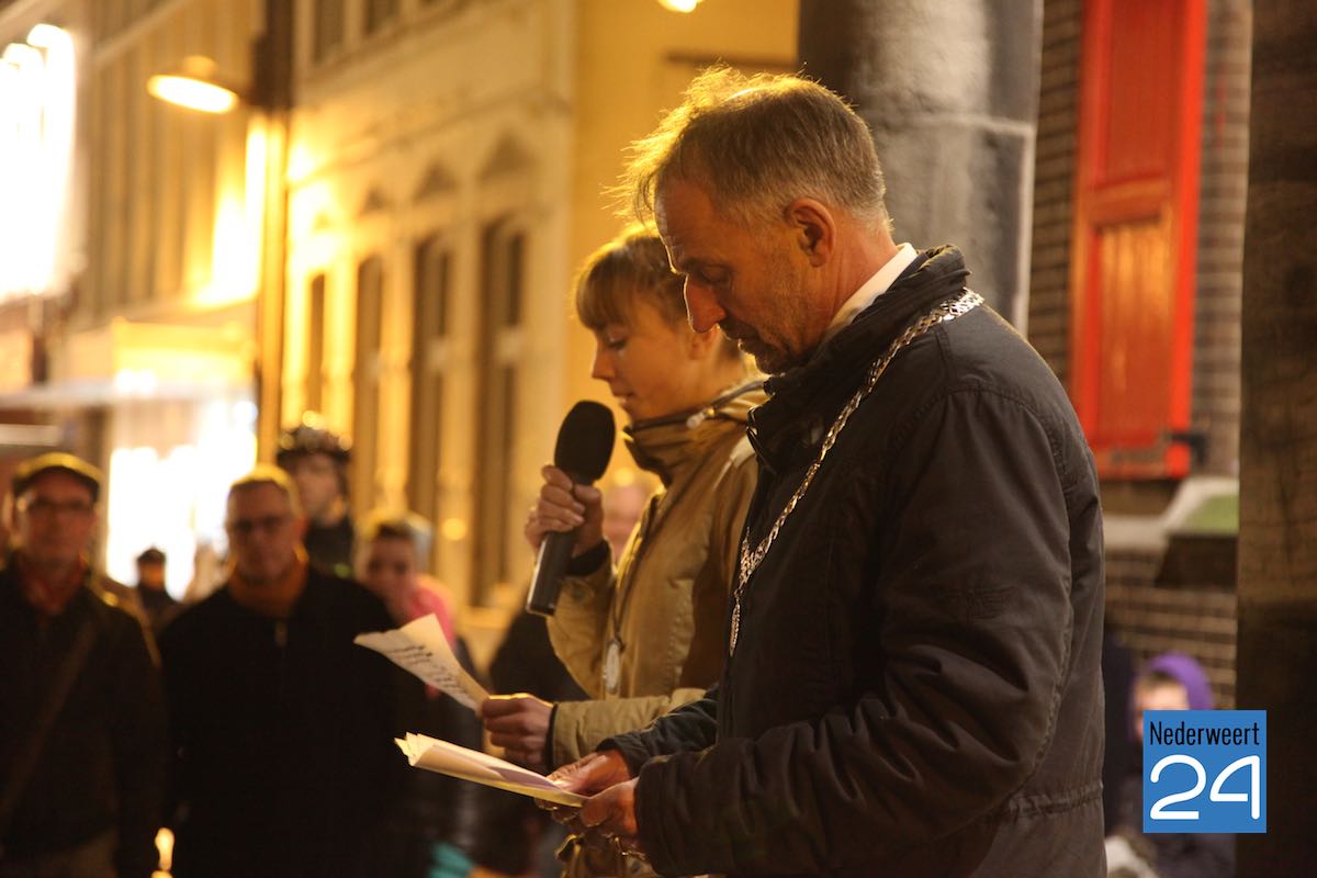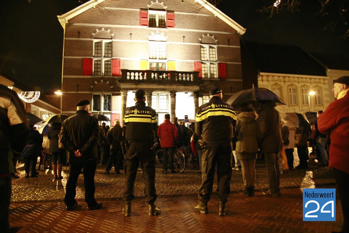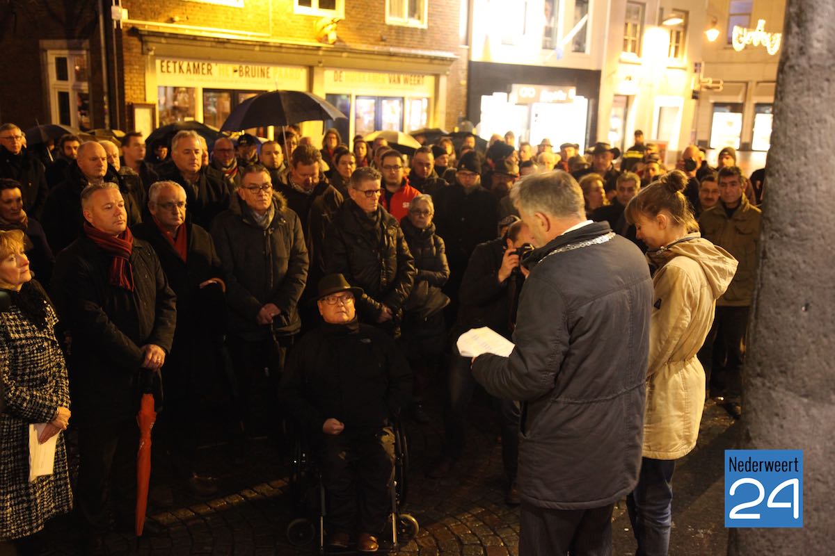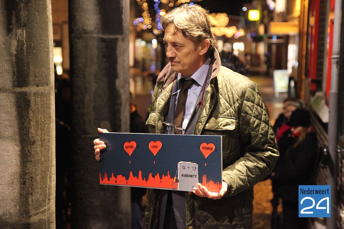 Ondanks het slechte weer waren ruim honderd mensen naar de markt gekomen om de slachtoffers van de aanslag op de makers van het satirische weekblad Charlie Hebdo te herdenken. De eerste spreker was journalist en columnist Gerard Kessels uit Nederweert. Burgemeester Jos Heijmans en gast van de burgemeester Eefje Stribos spraken het publiek toe. De burgemeester noemt tijdens zijn speech de 12 namen van de slachtoffers van de schietpartij in Parijs.