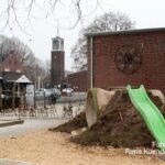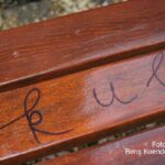 De glijbaan, een lamp en een bankje zijn bekliederd en beschreven met schuttingtaal. Ook was er een plant uit de grond getrokken op het speelplein. Juf Lenie zegt: “Het is toch zonde dat zo een nieuwe school nu al wordt beklad?“.