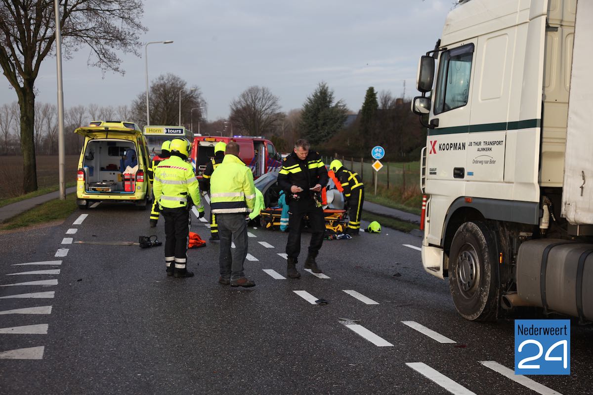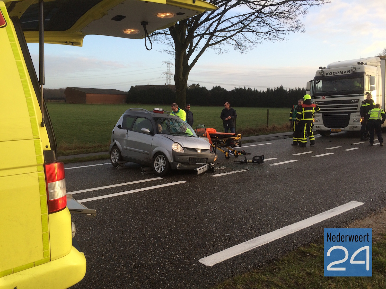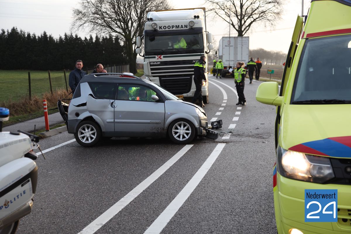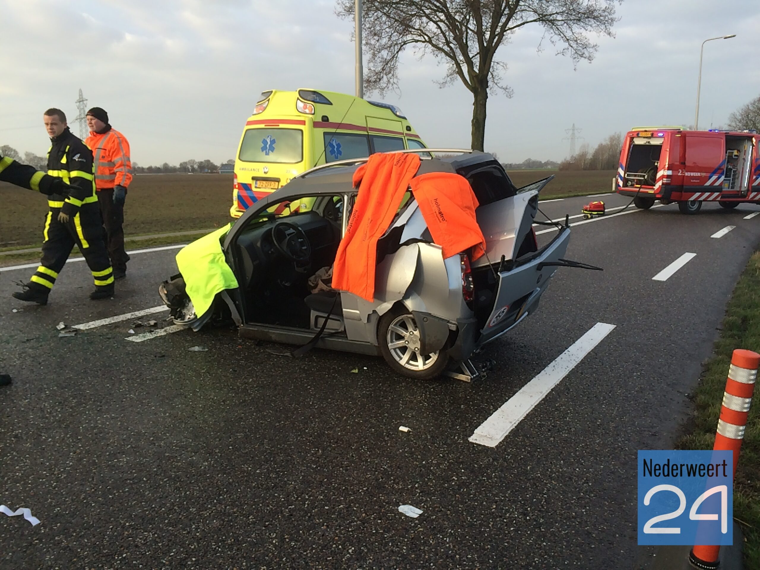 De 45km-auto reed richting Weert en is door een achterop komende vrachtwagen aangetikt. De auto is hierdoor op de linker weghelft terecht gekomen en tegen een vrachtwagen gebotst. De tank van de vrachtwagen is hierdoor beschadigd geraakt waarbij diesel op het wegdek terecht is gekomen. De weg blijft voorlopig afgesloten totdat de diesel is opgeruimd.