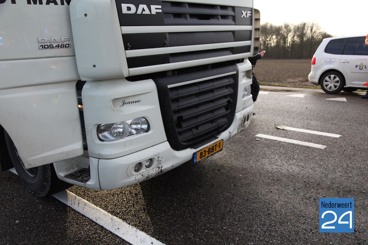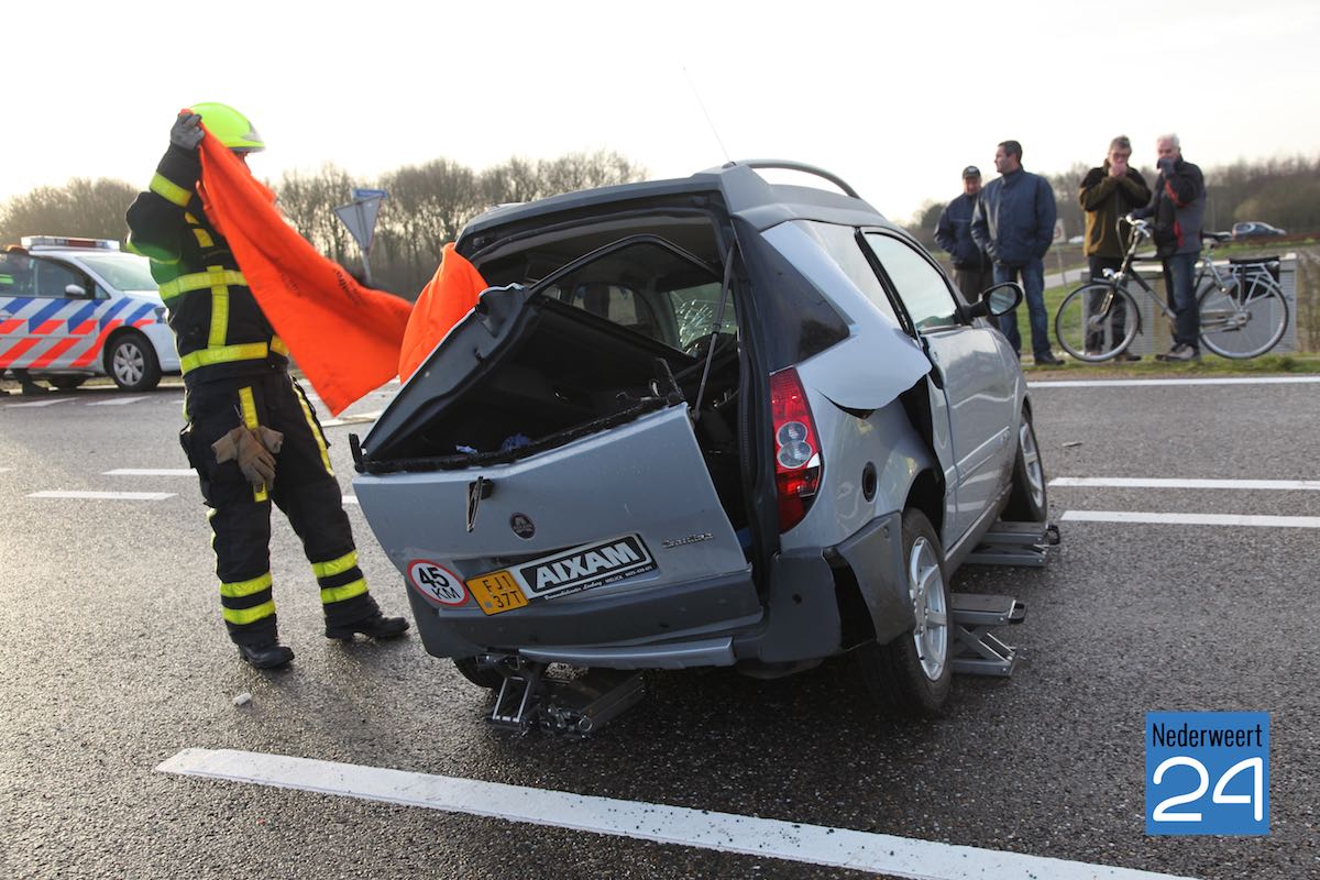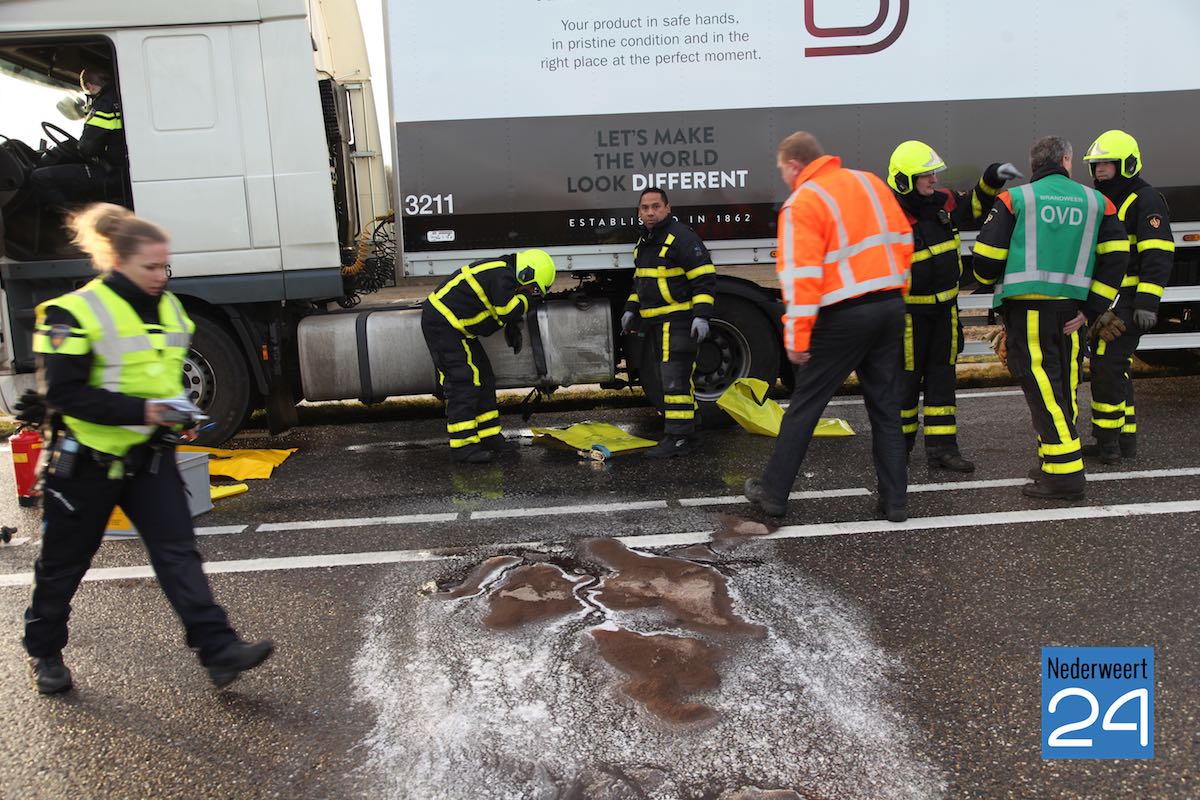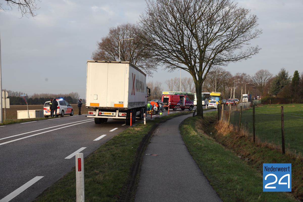 De 45km-auto reed richting Weert en is door een achterop komende vrachtwagen aangetikt. De auto is hierdoor op de linker weghelft terecht gekomen en tegen een vrachtwagen gebotst. De tank van de vrachtwagen is hierdoor beschadigd geraakt waarbij diesel op het wegdek terecht is gekomen. De weg blijft voorlopig afgesloten totdat de diesel is opgeruimd.