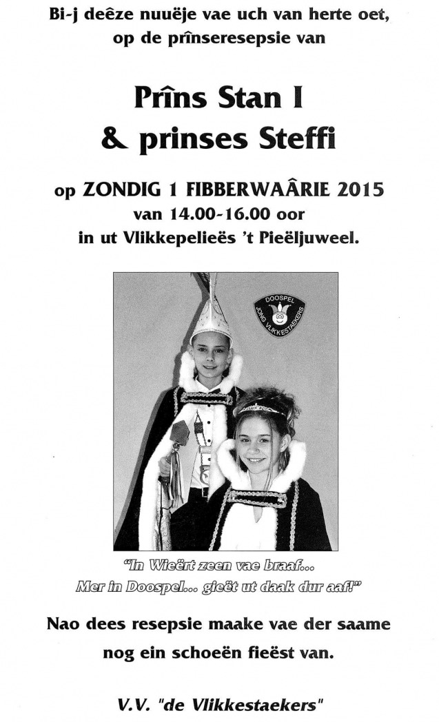 Aanstaande zondag 1 februari wordt in het ‘Vlikkepelieës’ Het Peeljuweel de jeugdprinsenreceptie van Prins Stan I en Prinses Steffi van de Jong Vlikkestaekers gehouden.Voor de Jong Vlikkestaekers is het de eerste keer dat ze een eigen jeugdreceptie organiseren.