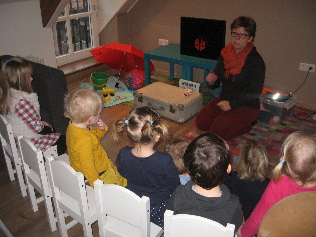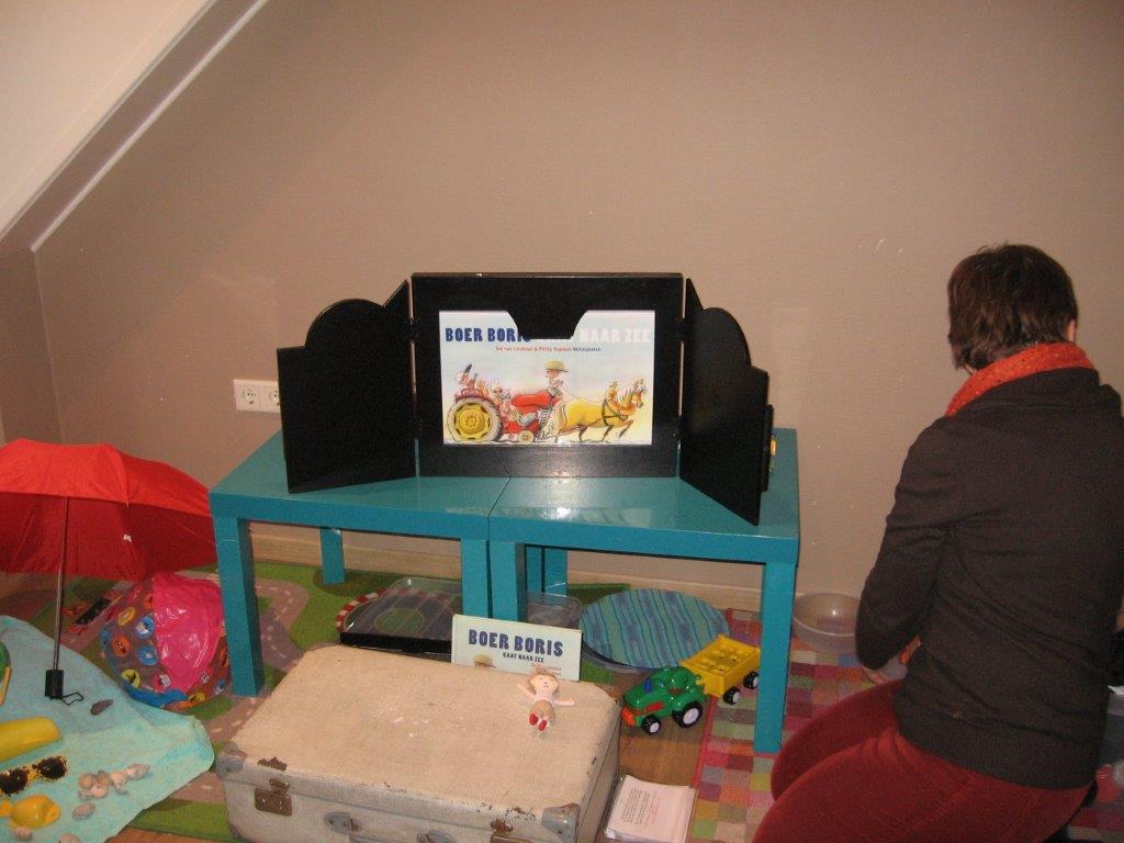 Een medewerkster van de bibliotheek las op een interactieve manier voor. Ze had hiervoor een vertelkastje meegenomen.Daarna werd het verhaal, samen met de kinderen nagespeeld, en mochten ze in de tractor van Boer Boris stappen met hun eigen knuffel. De kinderen waren reuze enthousiast en zongen uit volle borst het liedje ‘Boris gaat naar zee’.