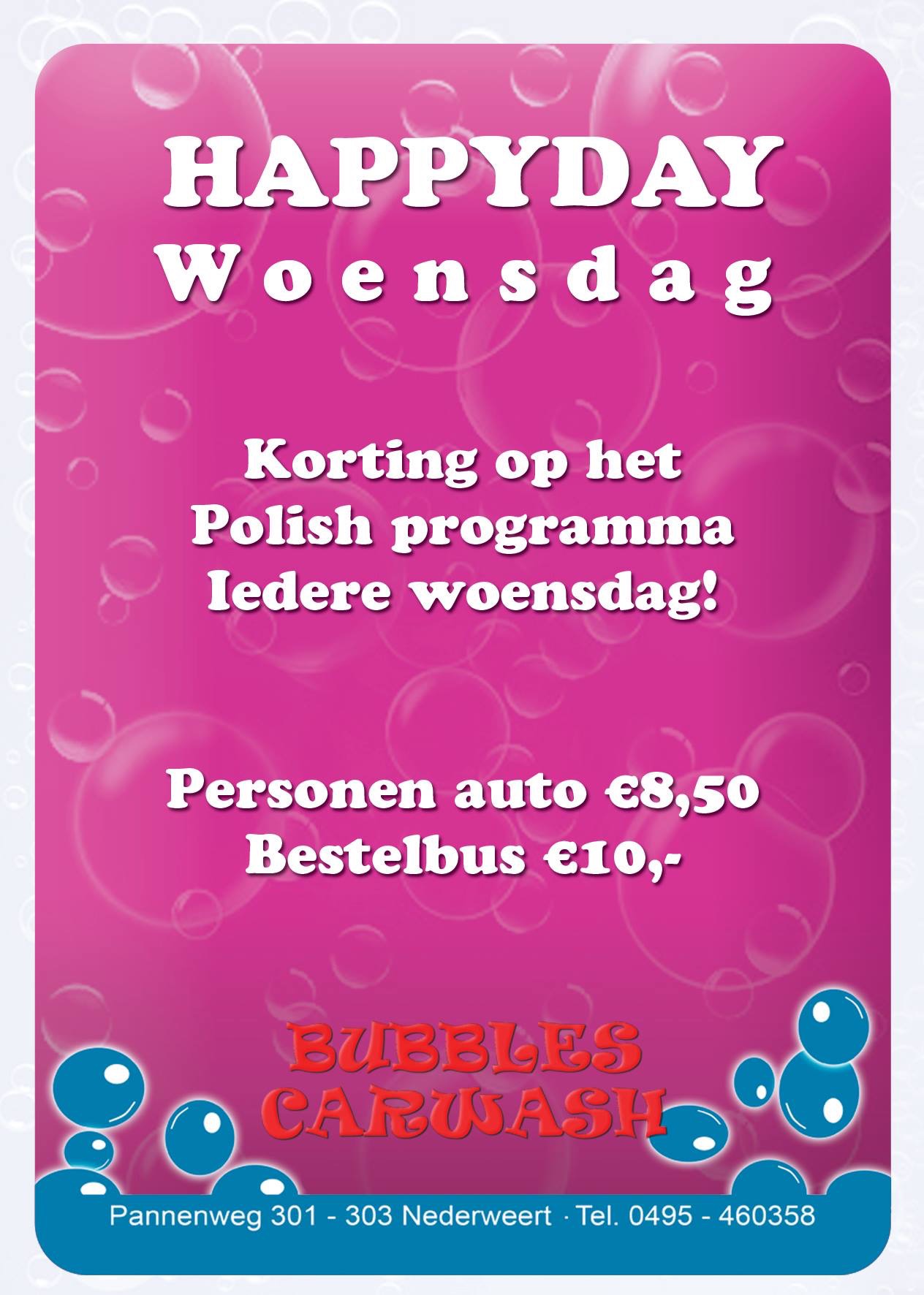 Iedere woensdag is het Happyday bij Bubbles Carwash en ontvang je extra voordeel op het uitgebreidste polish programma. Dit programma wordt alleen op woensdag aangeboden van 11,50 euro voor 8,50 euro. Een ideale gelegenheid dus om voordelig je pekel van je auto te wassen. Profiteer mee!