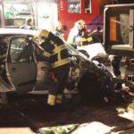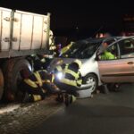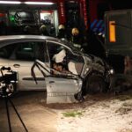 Auto ramt twee vrachtwagens