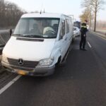 Een auto was op de verkeerde weghelft terecht gekomen en heeft daarbij een tegenmoetkomende bus met aanhanger geschampt. De bus verloor door de botsing het linker voorwiel. Beide auto’s raakten flink beschadigd. De bestuurder van de bus is door het ambulancepersoneel onderzocht. Hij was flink geschrokken. De bestuurder van de andere auto kwam met de schrik vrij.