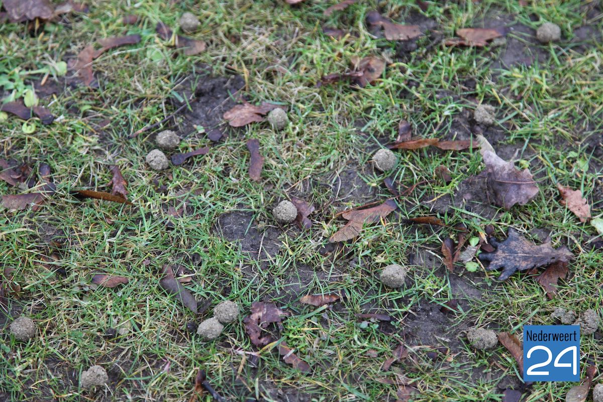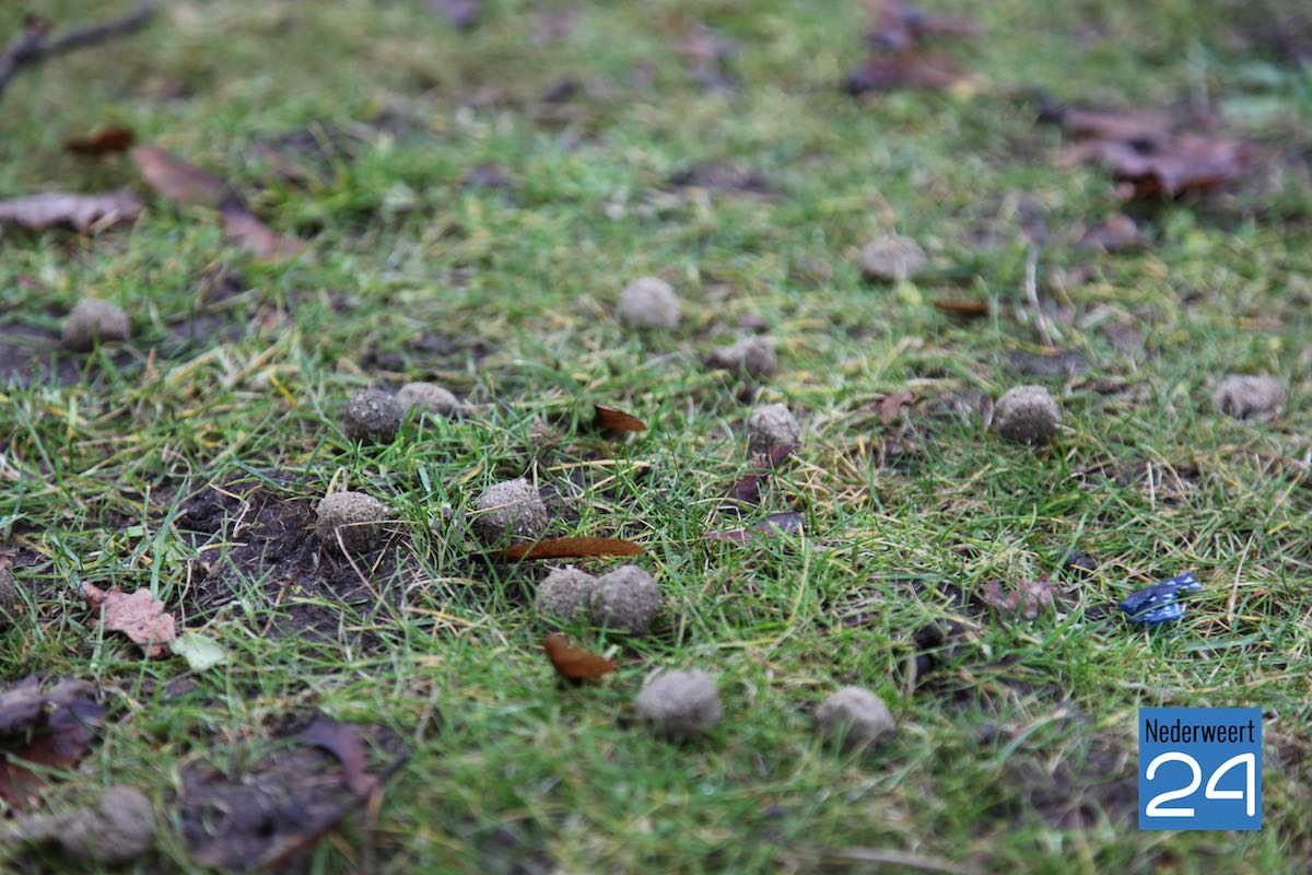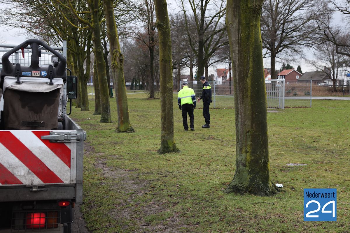 De politie heeft maandagmorgen verdachte hondenbrokken laten opruimen in het Rochuspark van Budschop, Nederweert.