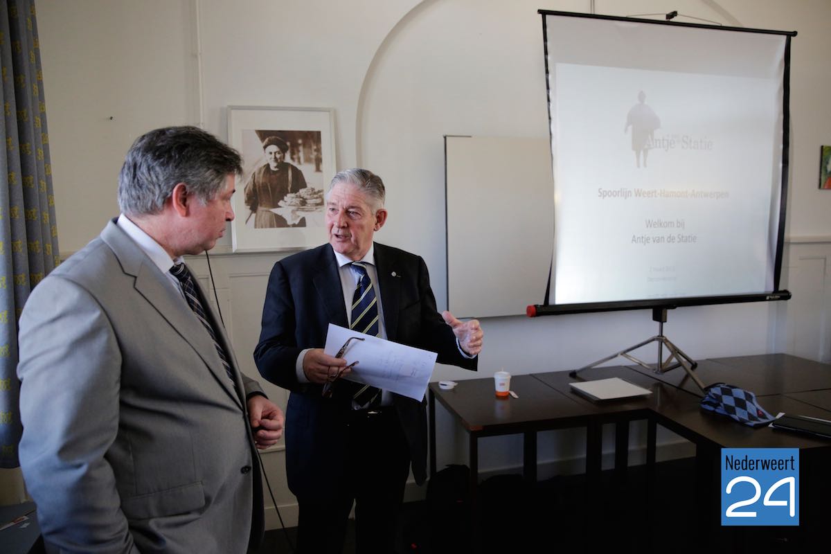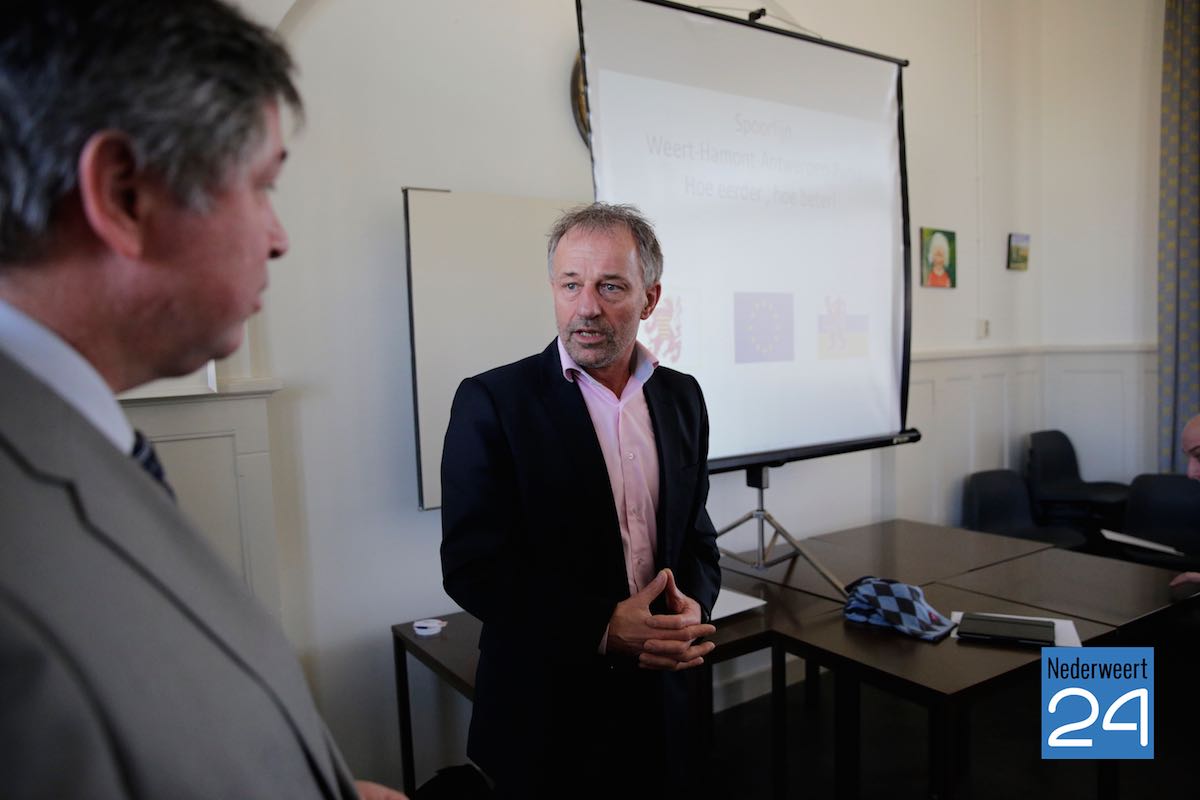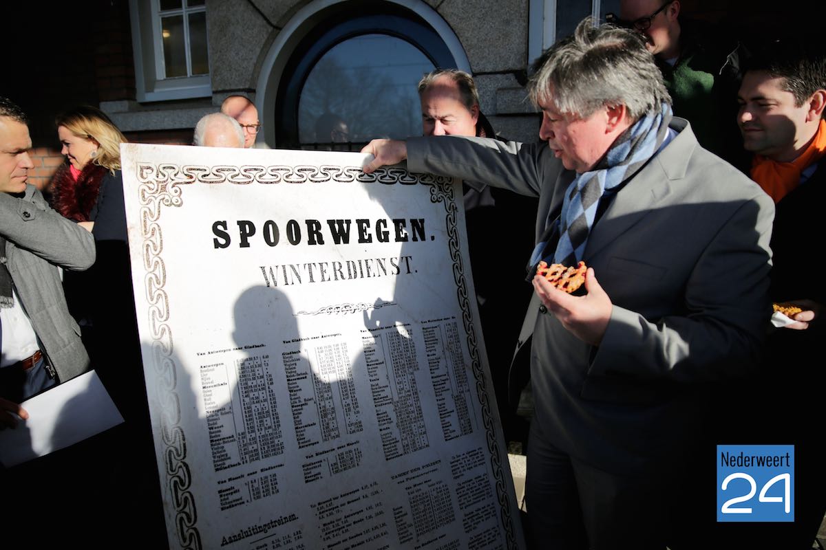 grensoverschrijdende spoorverbindingen Weert Hamont 2662Op het perron van het Station in Weert heeft CDA-gedeputeerde Van der Broeck op maandagochtend 2 maart samen met de burgemeesters van Neerpelt, Hamont, Kinrooi, Weert en Cranendonck symbolisch de oude dienstregeling uit 1884 Weert-Hamont-Antwerpen onthuld. Hiermee maakte de gedeputeerde zijn plan bekend om grensoverschrijdende spoorverbindingen mogelijk te maken en te verbeteren.