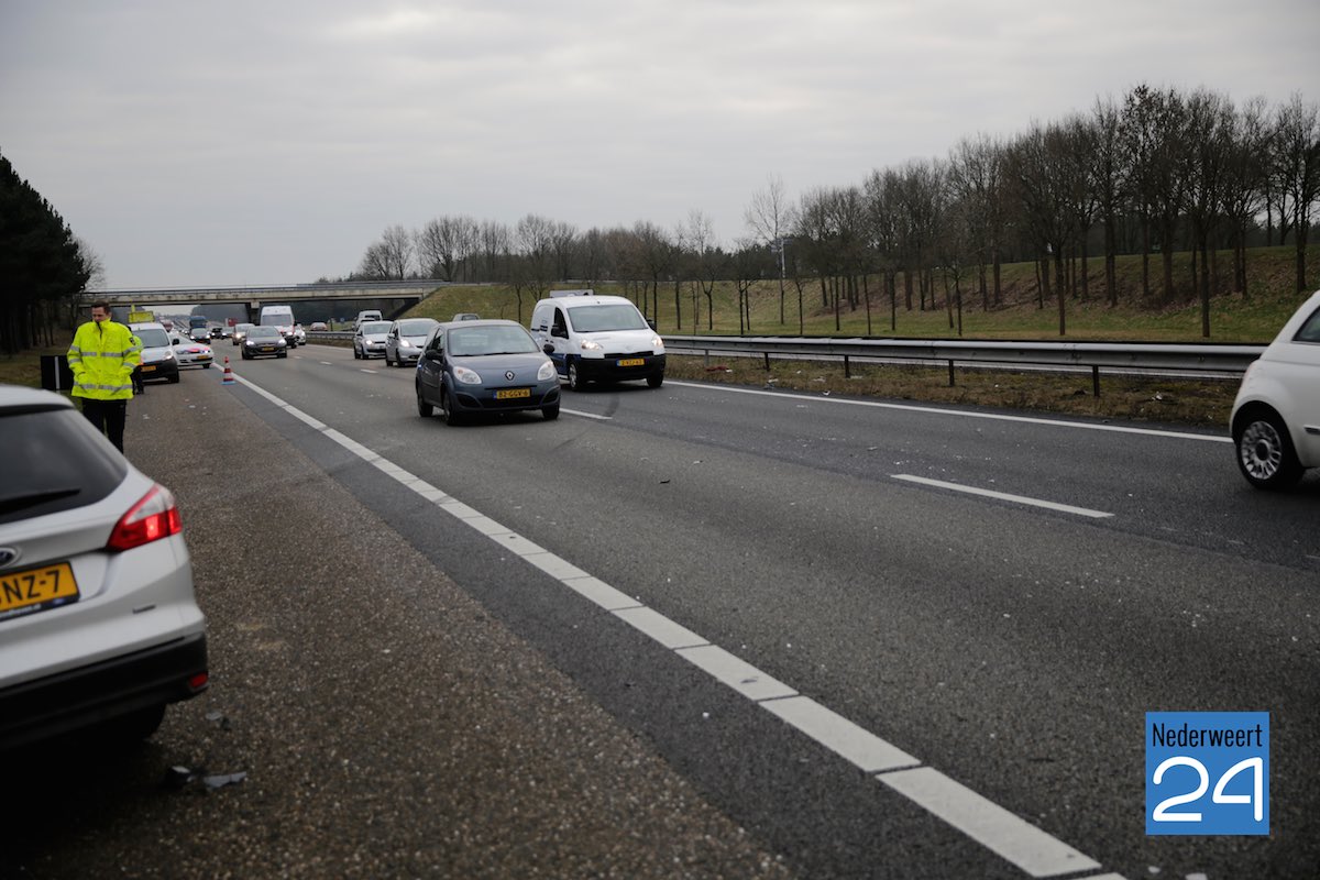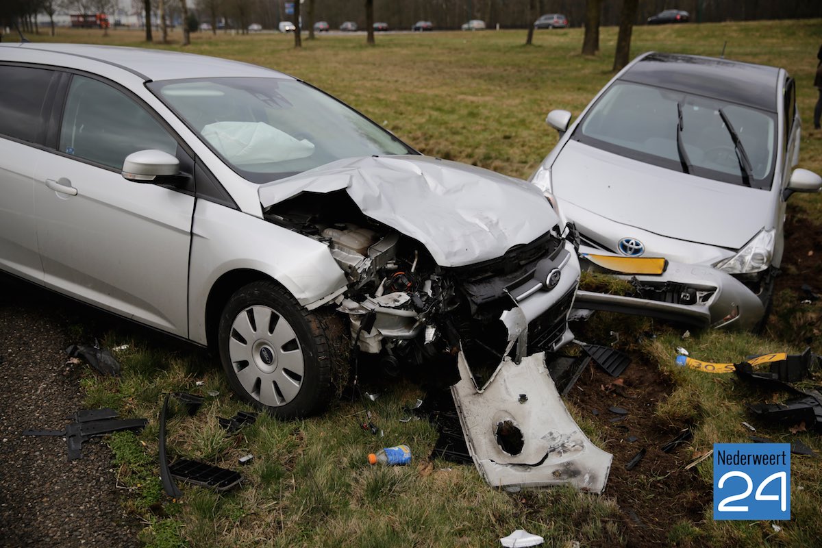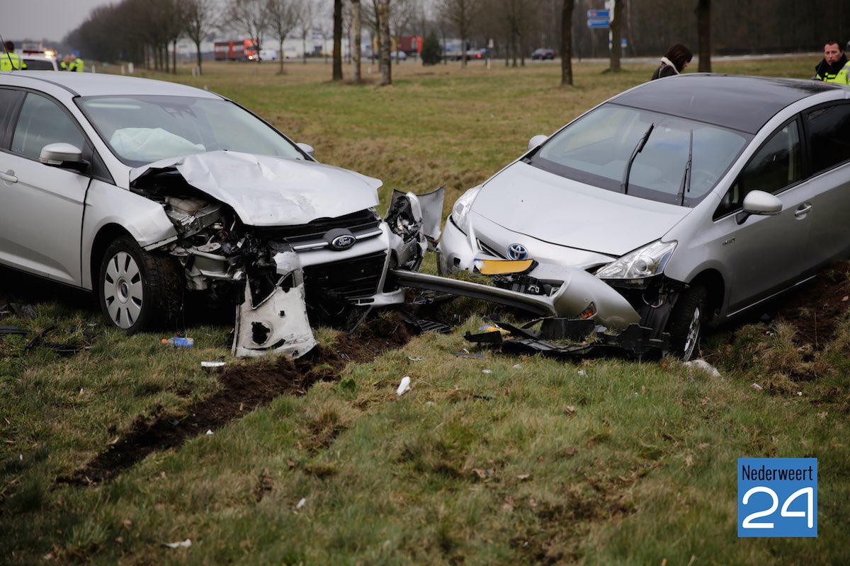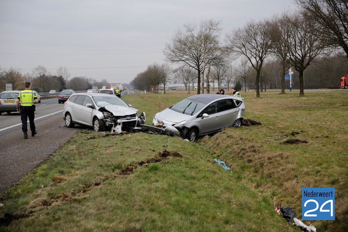 Vrijdagmorgen zijn twee auto’s hard met elkaar in botsing gekomen op de A2 iets voor de afslag Budel.