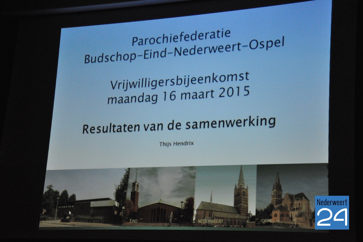 Maandagavond werden de vrijwilligers van de Parochie-federatie Nederweert geïnformeerd over de stand van zaken en de resultaten van de nieuwe samenwerking tussen de vier parochies. De kerkbesturen van de parochies in Budschop, Eind, Nederweert en Ospel hebben een jaar geleden samen een Parochie-Federatie gevormd om sterker de toekomst in te gaan.