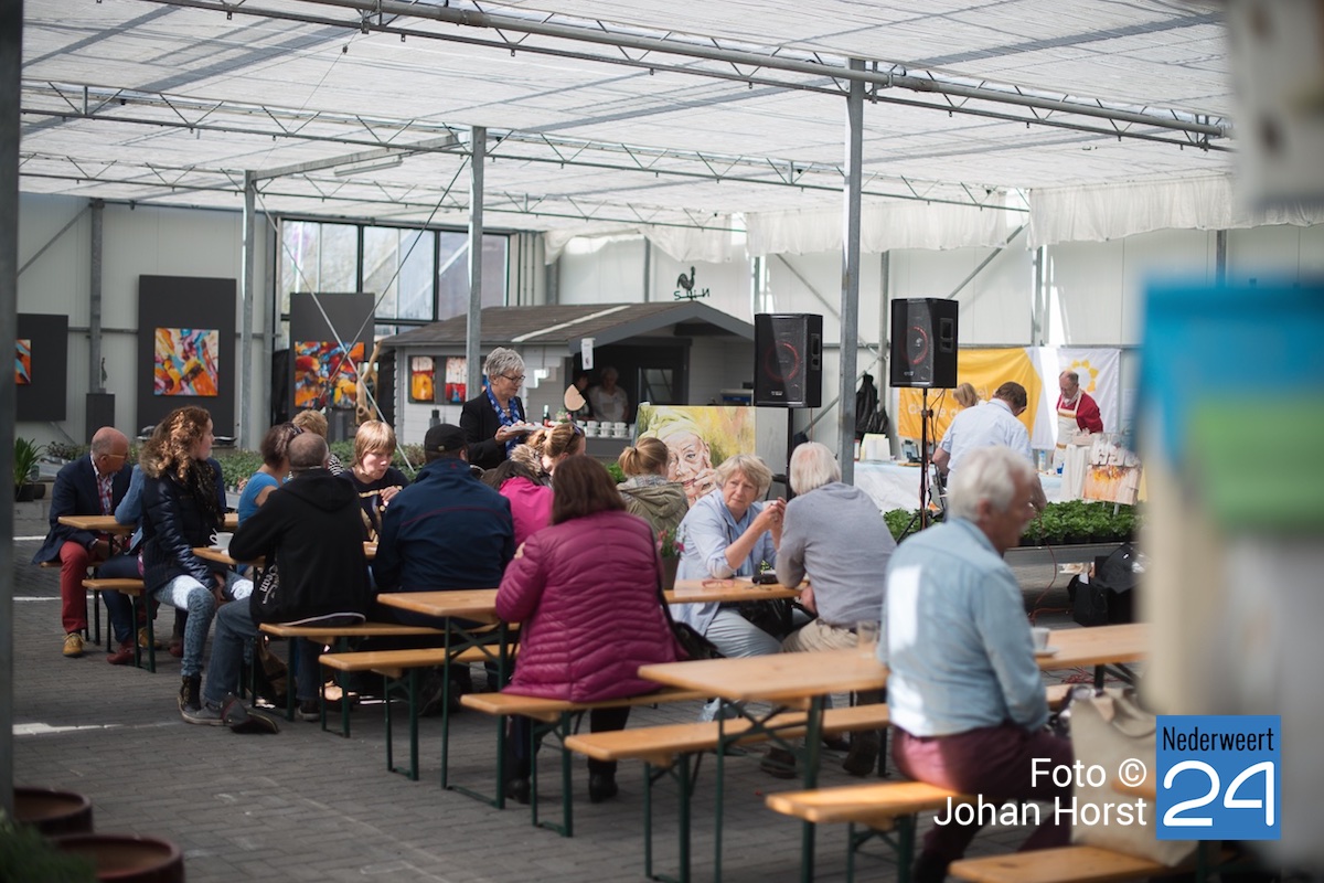 Gister en ook vandaag kun je genieten van de kunst in de kas en is er natuurlijk een koffieterras om te genieten van muziek en wat lekker. Dit lekkers wordt verzorgd door de leden van ‘de Zonnebloem’.