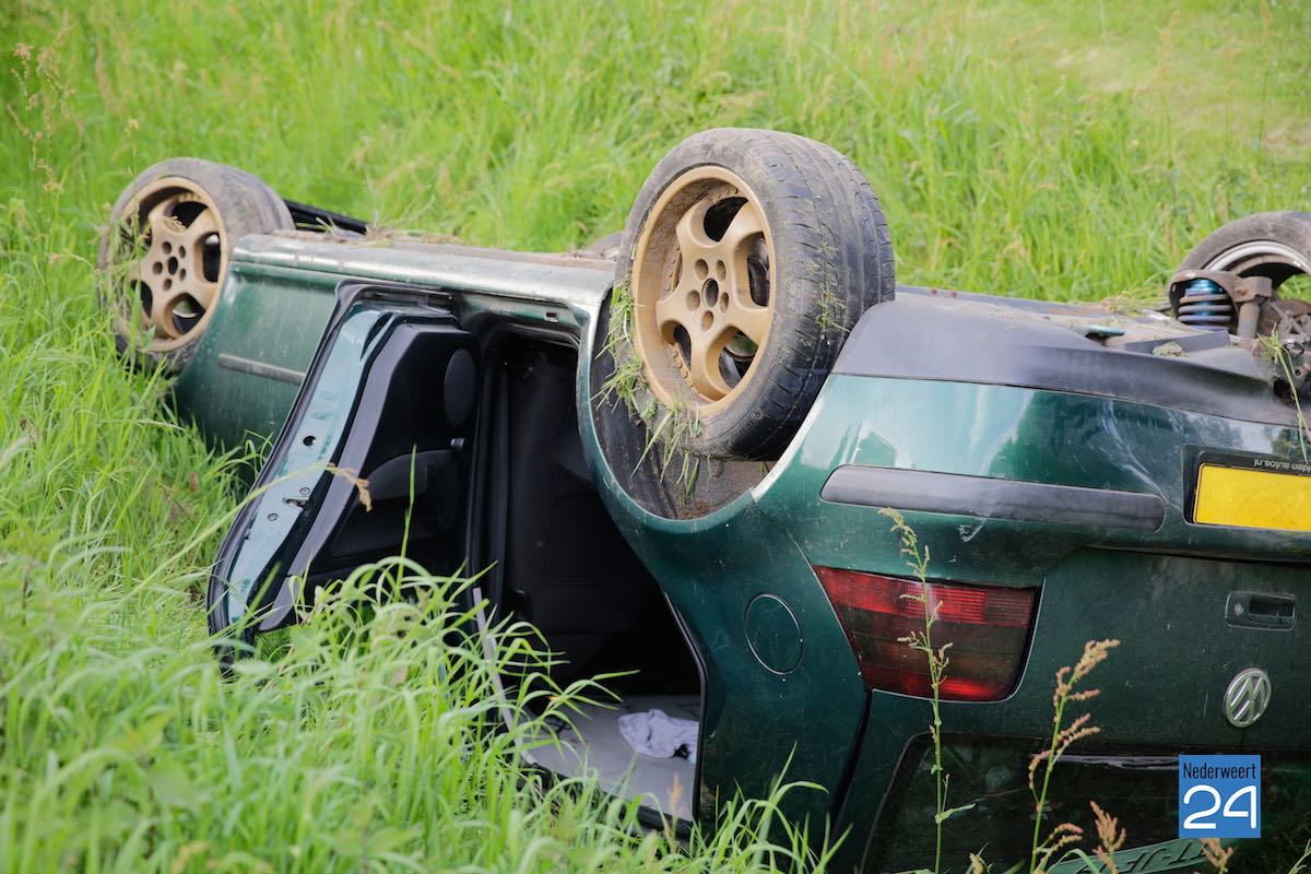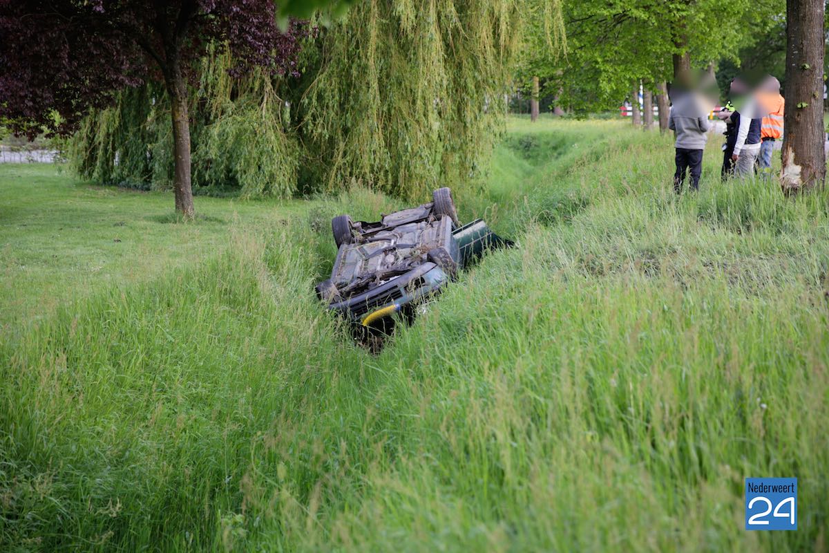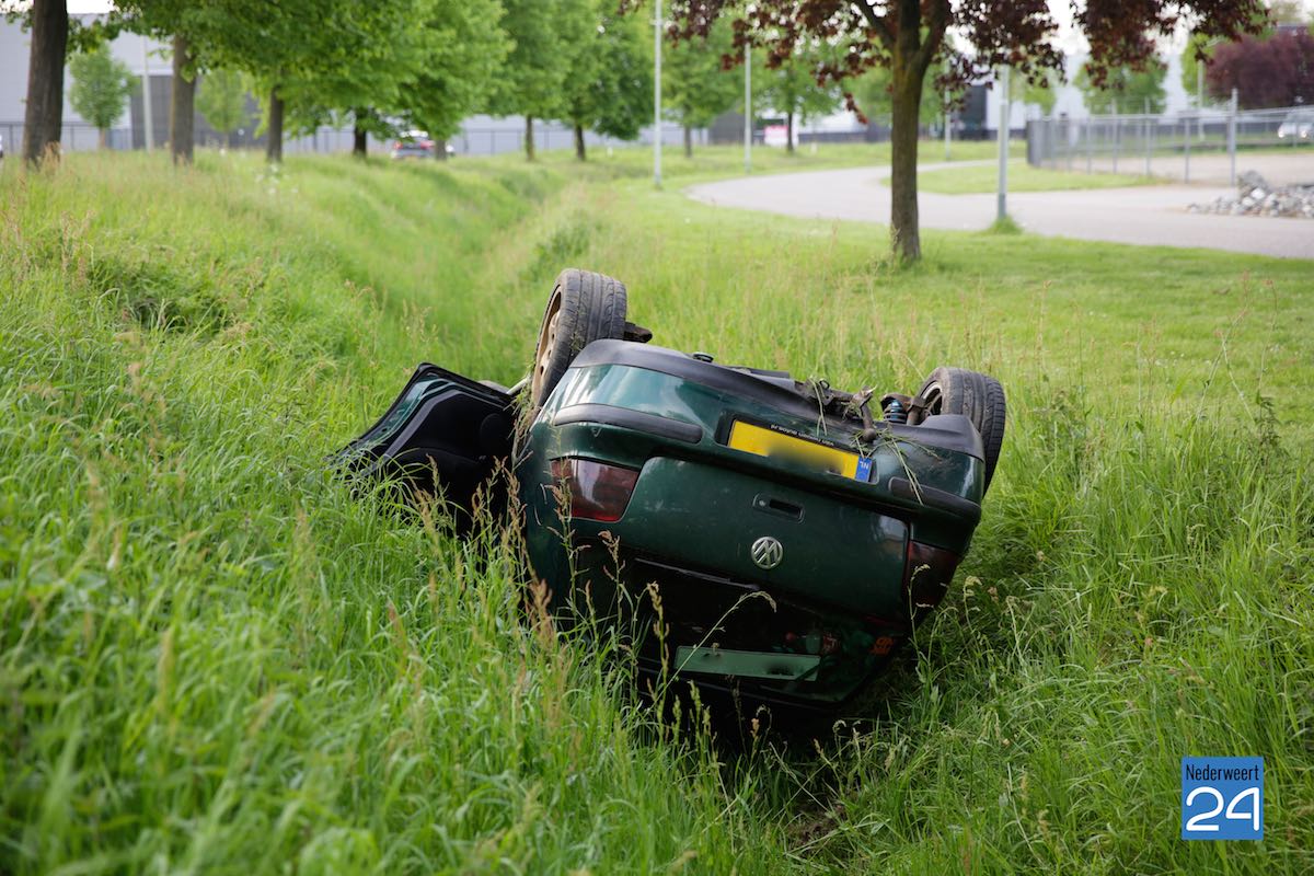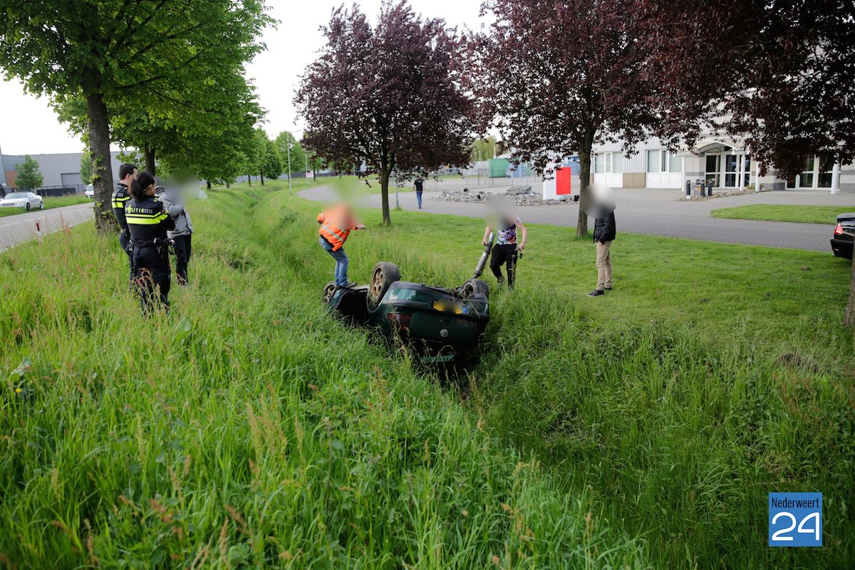 Donderdagavond is op industrieterrein Pannenweg in Nederweert een auto over de kop geslagen en in de sloot terecht geraakt.