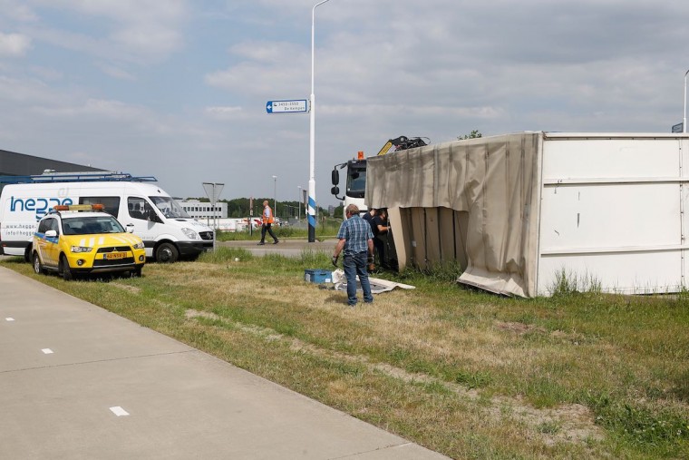 De laadbak was geladen met ijzerwaren en kwam dusdanig op de rotonde te liggen dat de weg versperd werd. De politie heeft tijdelijk het verkeer omgeleid terwijl de bergers de laadbak hebben geborgen. De politie onderzoekt de toedracht van het incident.