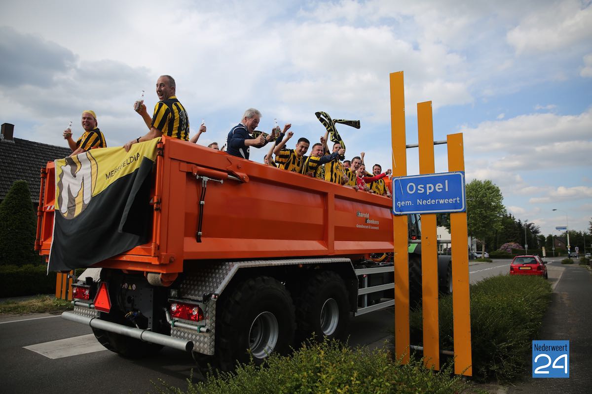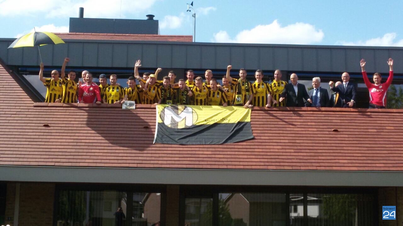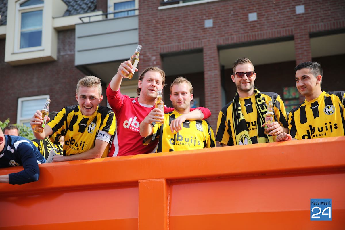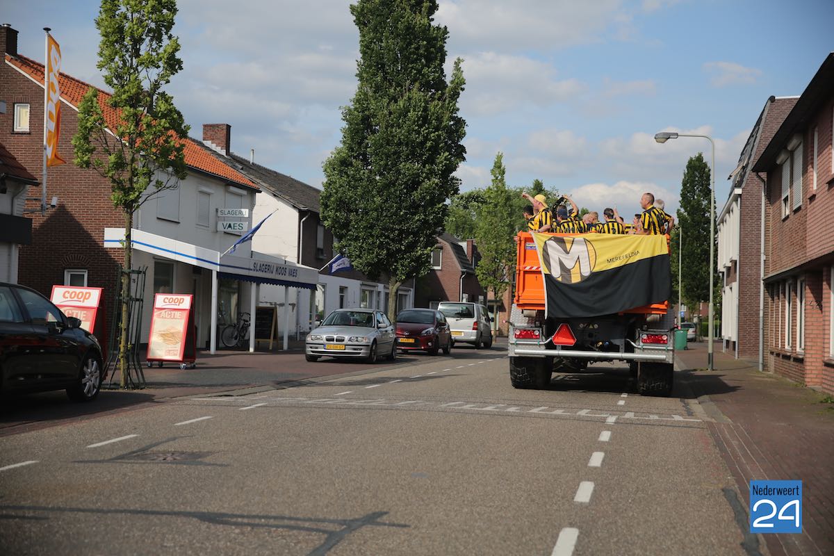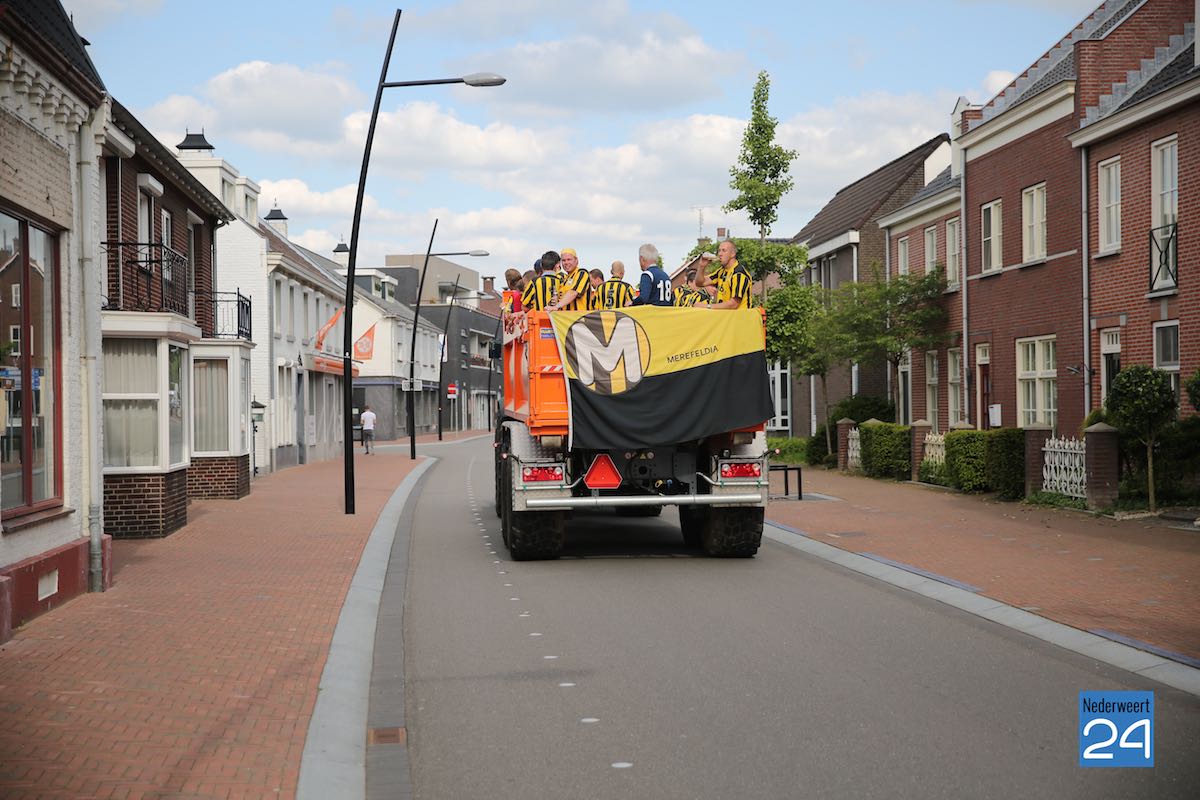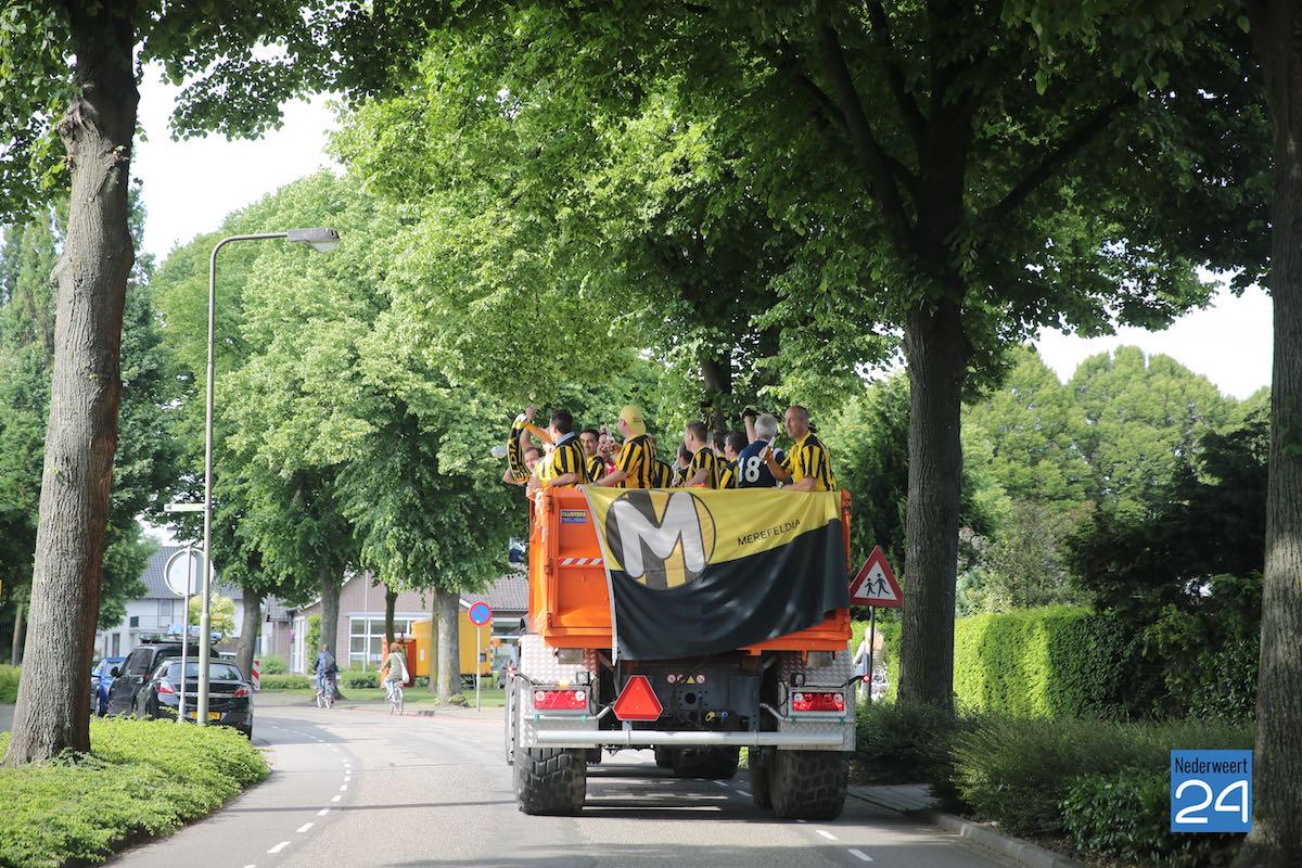 Na een spannende voetbalwedstrijd is Merefeldia zondag gepromoveerd naar de derde klasse. Dit heuglijke feit werd gisteren al flink gevierd maar vandaag trokken de jongens nog een keer door het dorp om van zich te laten horen.