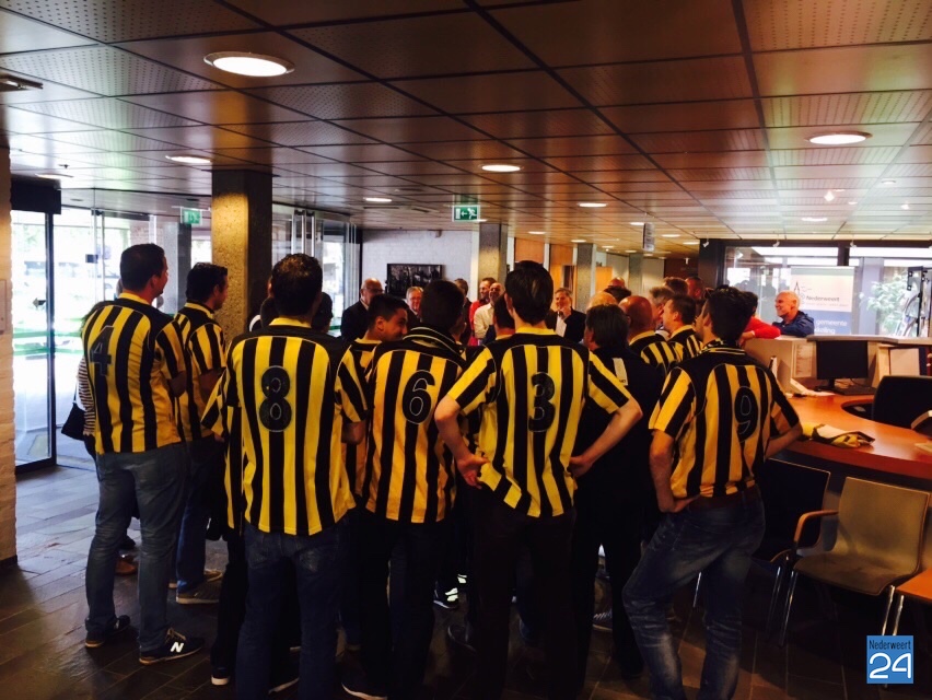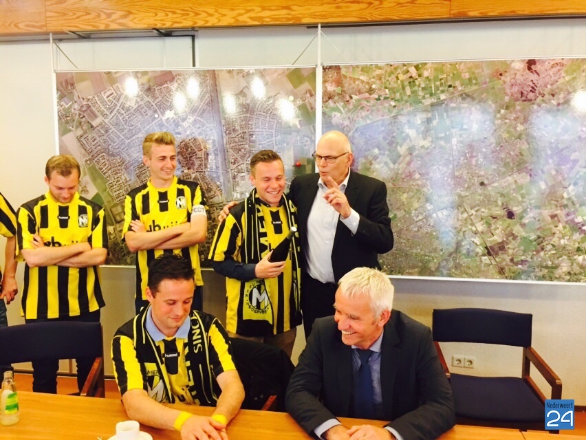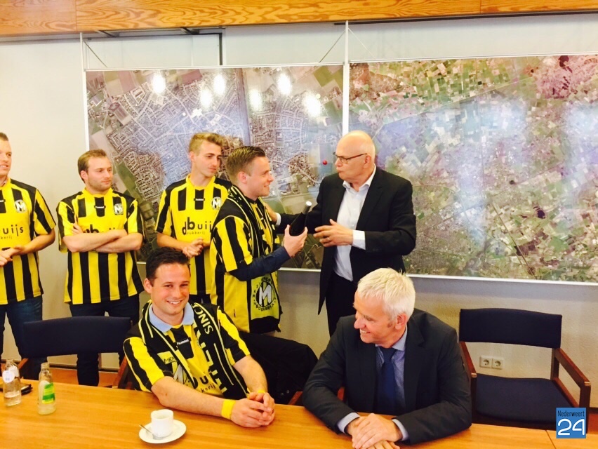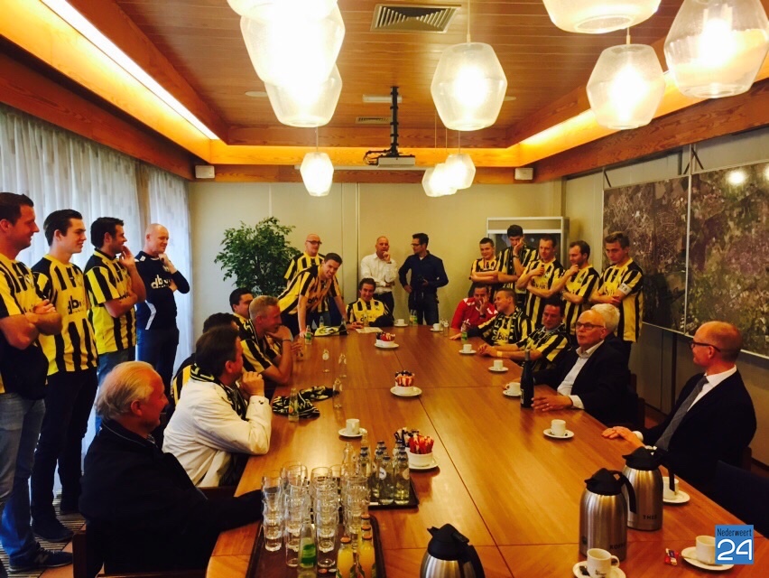 Rond vier uur werd het hele elftal op het gemeentehuis ontvangen door burgemeester Evers en de wethouders Mackus, Houtman en Geraats. Niet met een biertje maar met een frisje van het gemeentebestuur werden ze toegesproken en gefeliciteerd met hun behaalde resultaat.