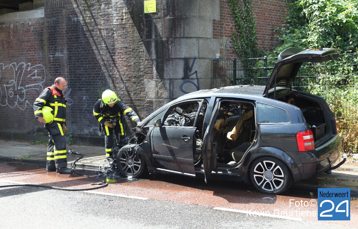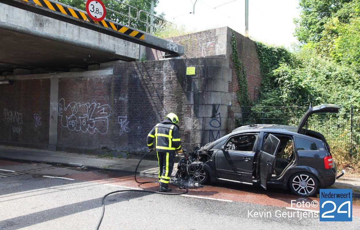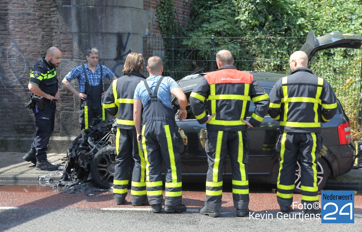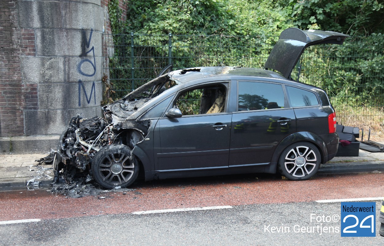 Een personenauto is zondagmiddag volledig uitgebrand op de Maaseikerweg ter hoogte van het spoorviaduct. Niemand raakte hierbij gewond.