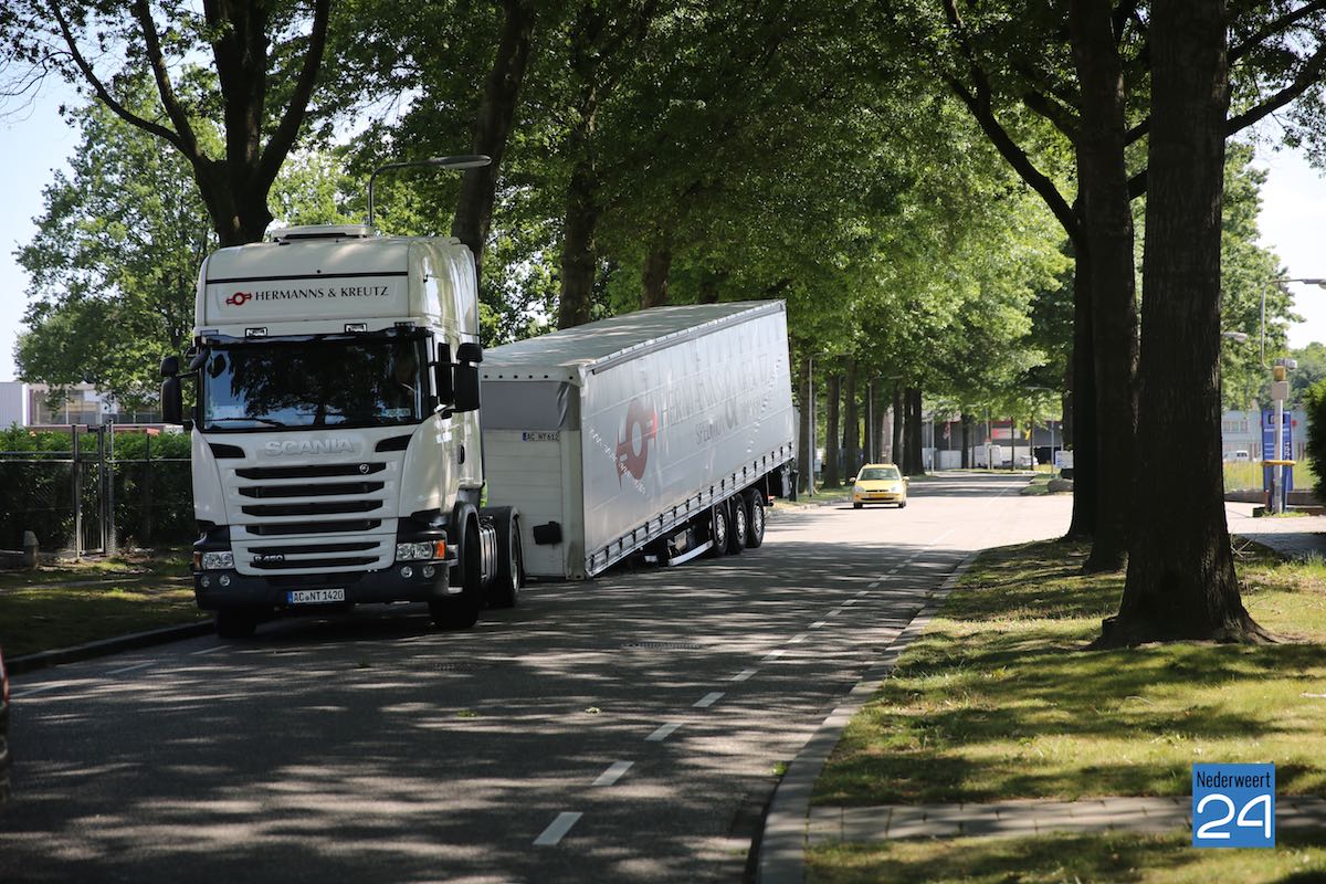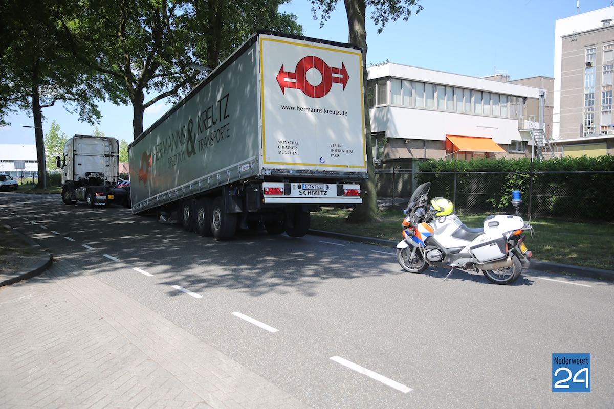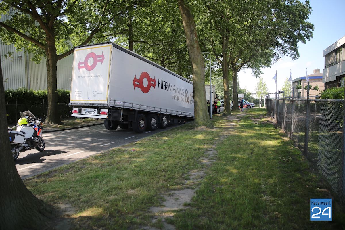 De vrachtwagen zal eerst leeg gemaakt worden alvorens deze verwijderd kan worden. Het verkeer op de Straevenweg van industrieterrein Fatima in Weert ondervindt enige hinder maar kan passeren.