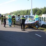 Een oudere man is met ondersteuning van de ambulance uit de auto kunnen komen en meegenomen naar het ziekenhuis. De bestuurder van de andere personenauto kwam met de schrik vrij.