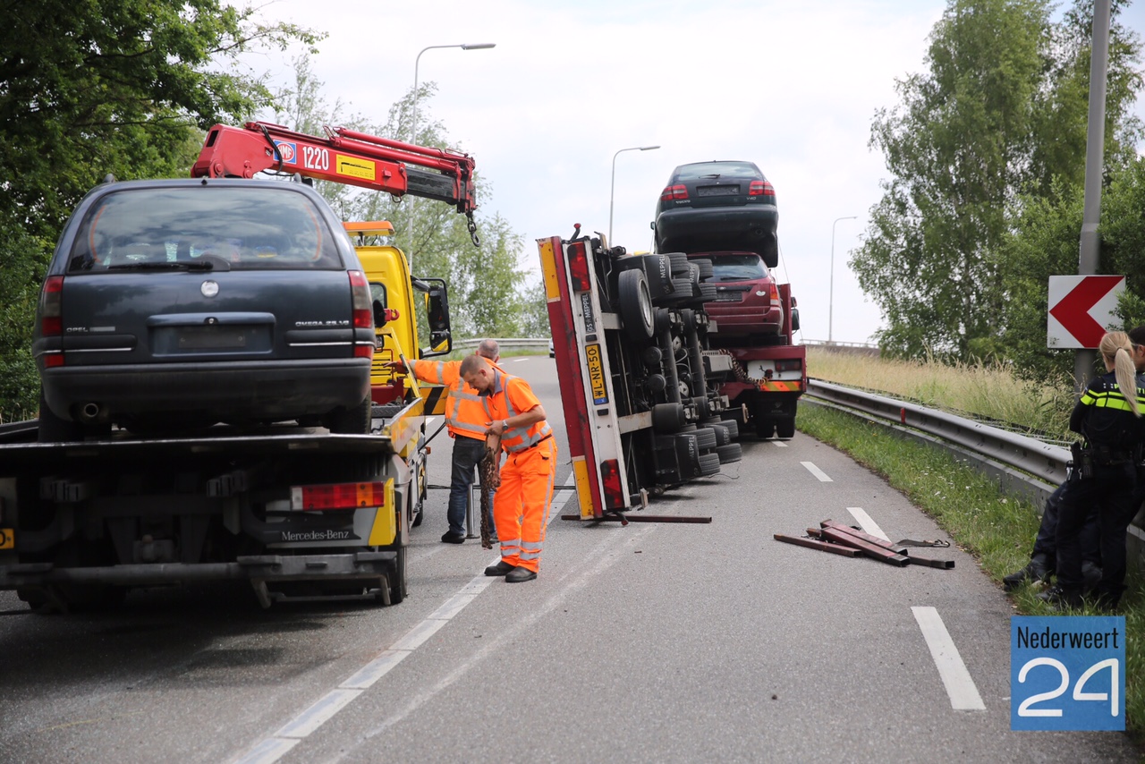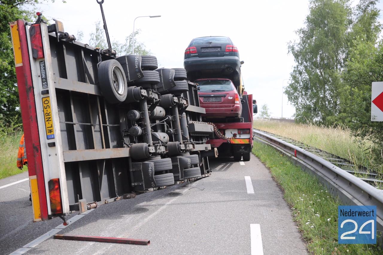 Het ongeluk gebeurde even voor half elf ter hoogte van het viaduct bij de haven van de zinkfabiek in Budel. De chauffeur van de vrachtwagen is niet gewond geraakt. Waarschijnlijk heeft de chauffeur zich verschrokken door een overstekend dier en vervolgens een uitwijkmanoeuvre gemaakt waardoor de aanhangwagen is gekanteld. Naar verwachting blijft de weg zo’n twee uur dicht.