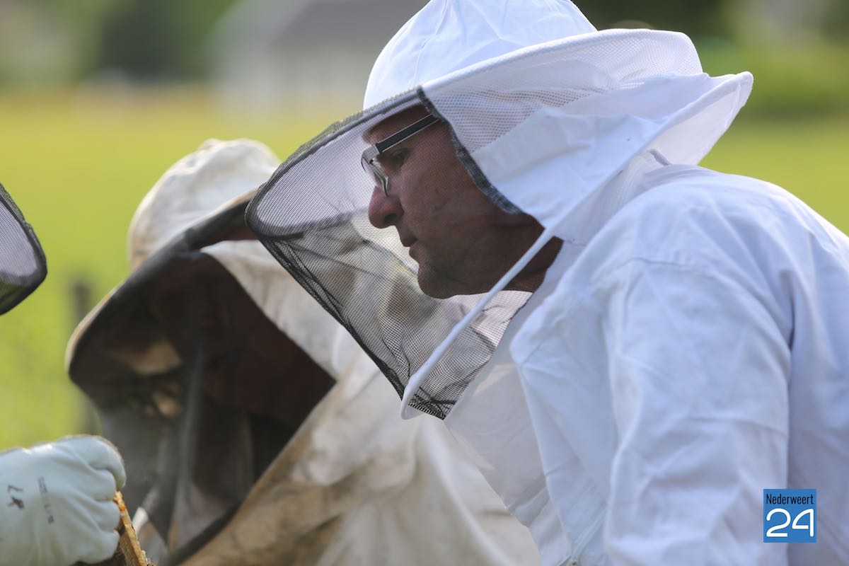 Lei Reemers en Geert Parren zijn trots op hun eerste bijen in de “Bijje-Volk” aan de Hoebenstraat in Nederweert.
