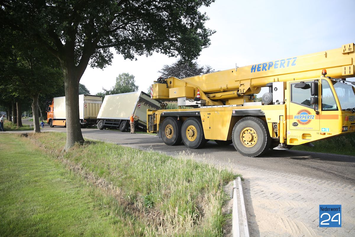 De vrachtwagenaanhanger heeft vervolgens de zachte kant van de berm geraakt en is de sloot in gegleden. Hij is niet helemaal omgekiept waardoor hopelijk de eieren die geladen waren nog heel zijn. Een grote kraan heeft de aanhanger uit de sloot gehaald.