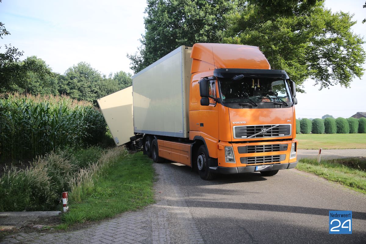 Vrijdagmorgen is een aanhanger van een vrachtwagen in de sloot langs de Kampersweg in Ospel terecht gekomen. De vrachtwagen moest uitwijken en is daarbij iets te ver opzij gegaan.