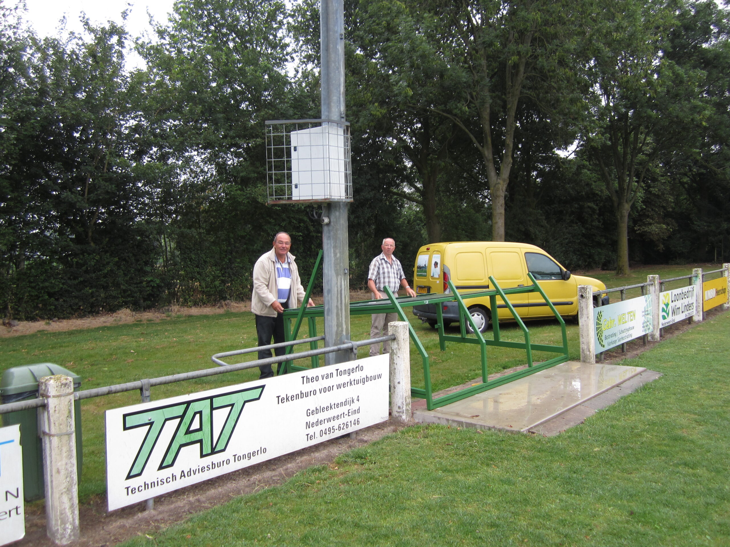 Nieuwe dug-outs  Eindse BoysDe oude dug-outs op het hoofdveld van Eindse Boys waren aan vervanging toe. Om het hoofdveld wat meer uitstraling te geven, is ervoor gekozen om deze keer de dug-outs boven de grond te plaatsen. De oude dug-outs waren namelijk gedeeltelijk ingegraven in het veld. Bijkomend voordeel van de nieuwe dug-outs is dat ze plaats bieden aan meer spelers. Na het verwijderen van de oude dug-outs bleef er een gat over in de grond. Dit is opgevuld en met de hulp van Wim Linders is er een betonnen vloer gestort. Deze is uiteindelijk afgewerkt met betonelementen geleverd door Granito Beton .