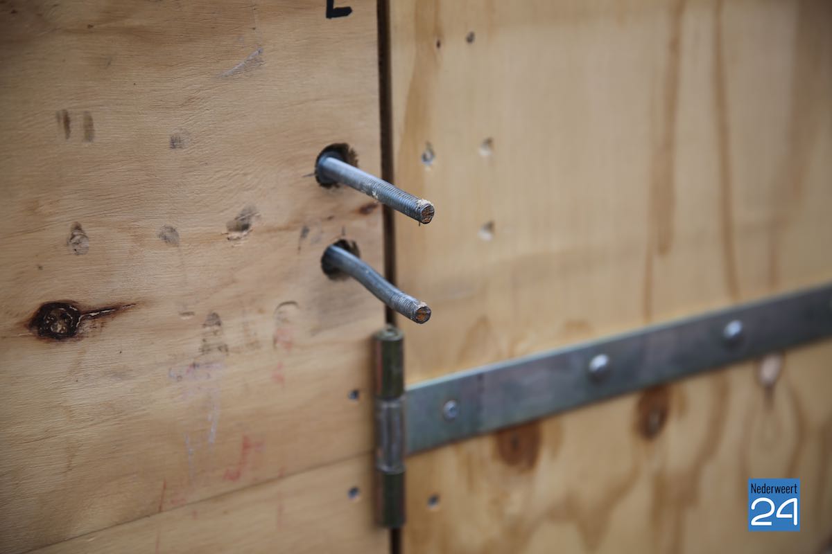 De dieven hebben waarschijnlijk eerst geprobeerd om via de “tijdelijke” zij-ingang toegang te krijgen. Toen dit niet lukte, zijn ze naar de hoofdingang gegaan die nu tijdelijk is afgesloten door een houten deur. Ondanks dat deze met zware balken en hangsloten is afgesloten, is het toch gelukt om via deze ingang binnen te komen.