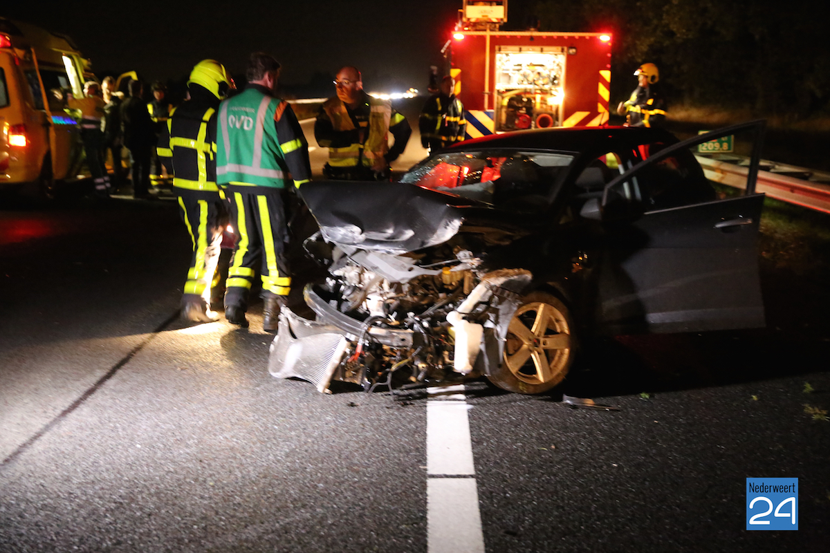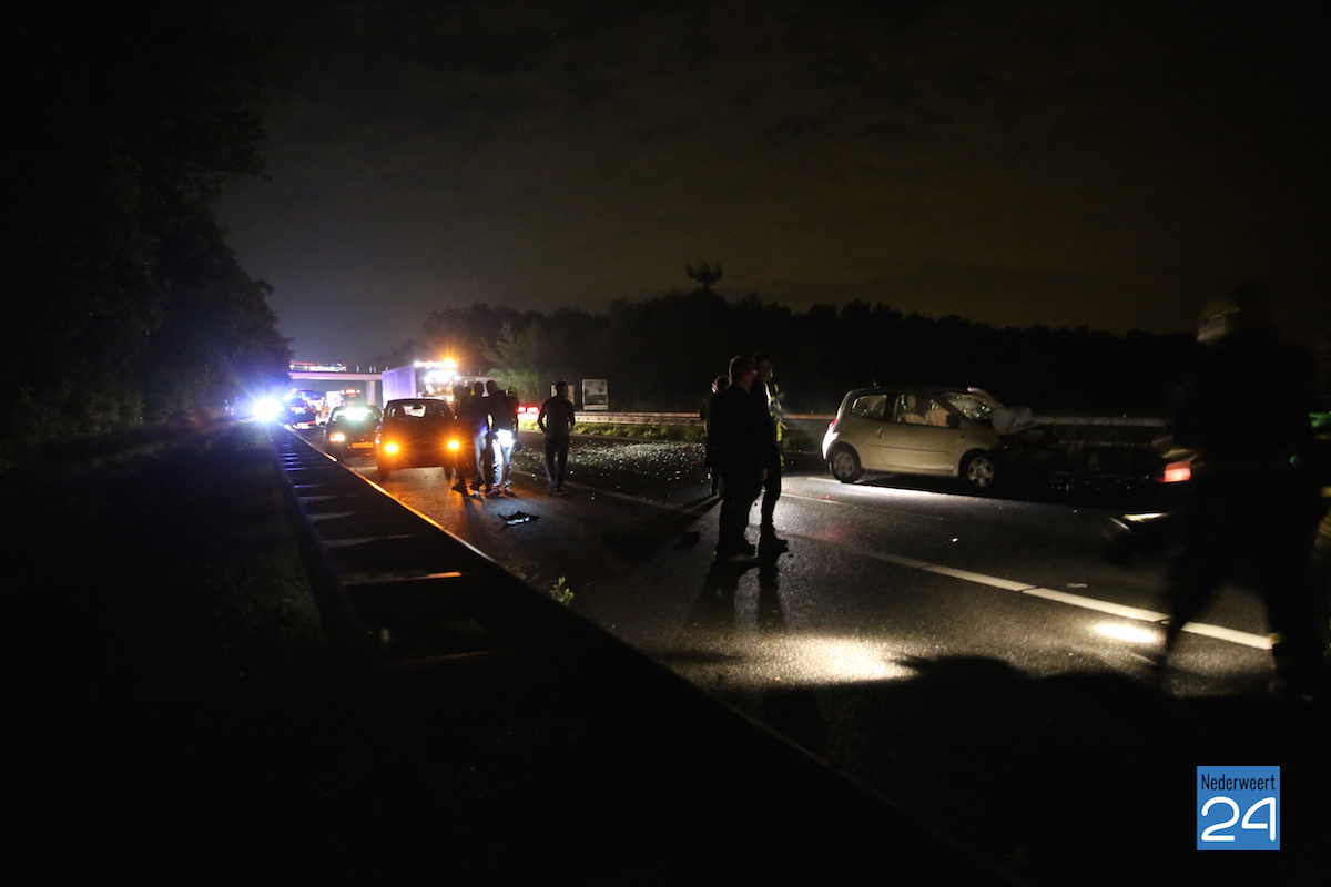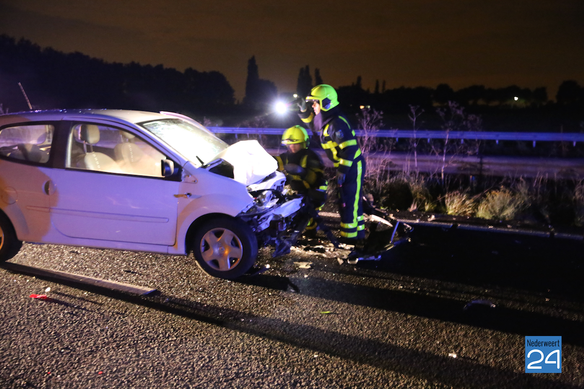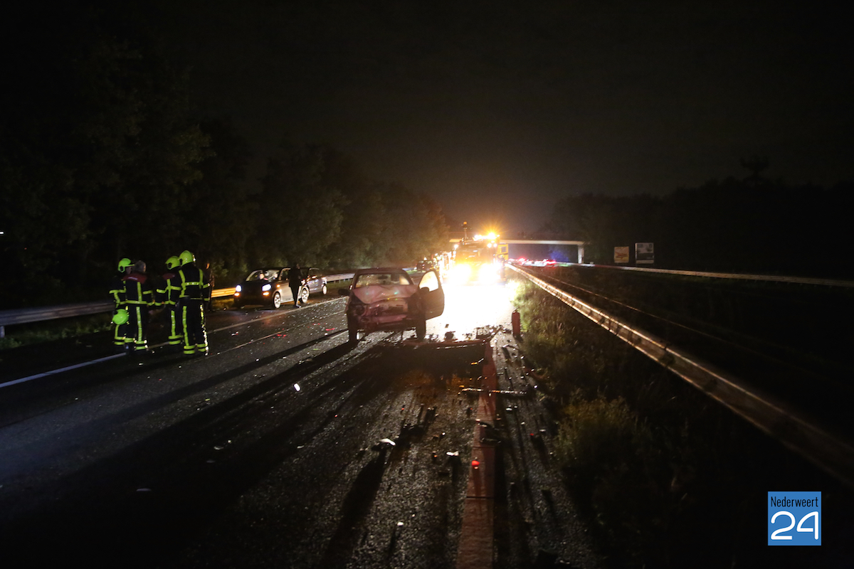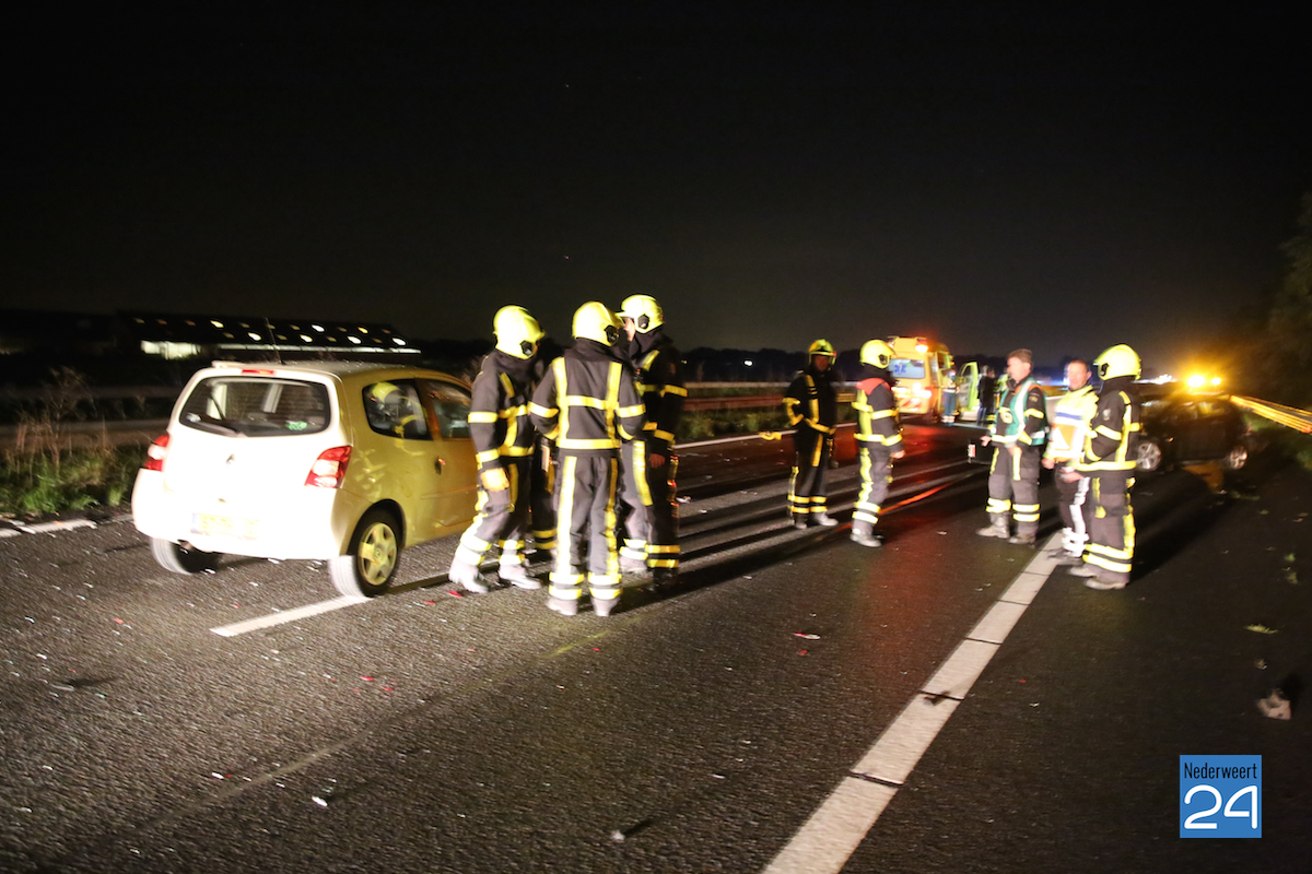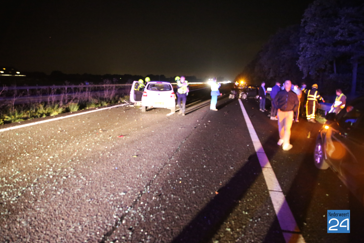 Een auto heeft een klapband gekregen en is daarna in de middenberm tegen de vangrail stil komen te staan. De bestuurster van die auto is daarna veilig achter de vangrail gaan staan. De twee auto’s hebben de stilstaande auto niet opgemerkt en zijn er bovenop geknald. Van de auto’s is niet veel meer over. Drie ambulances zijn ter plaatse en hebben de inzittenden van de auto’s die achterop reden onderzocht. “Ik heb echt een engeltje op mijn schouder gehad. Ik ben zo blij dat ik snel uit mijn auto ben gestapt” aldus de bestuurster van de auto met de klapband.