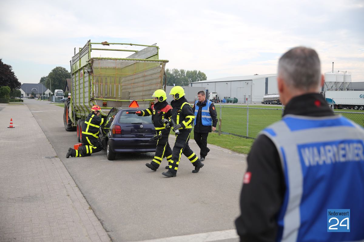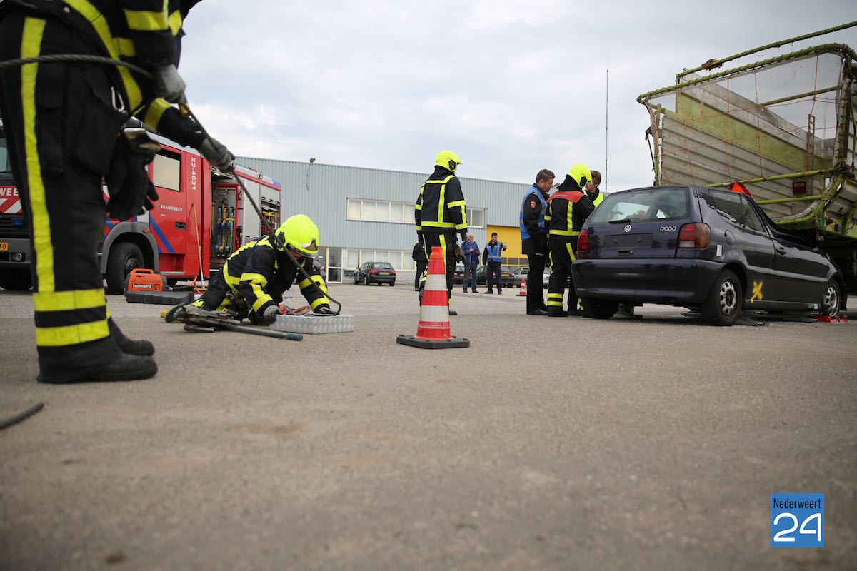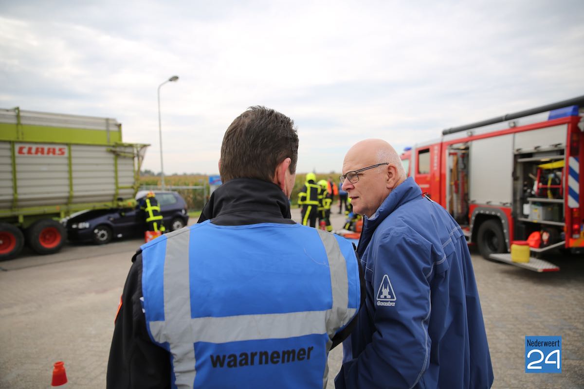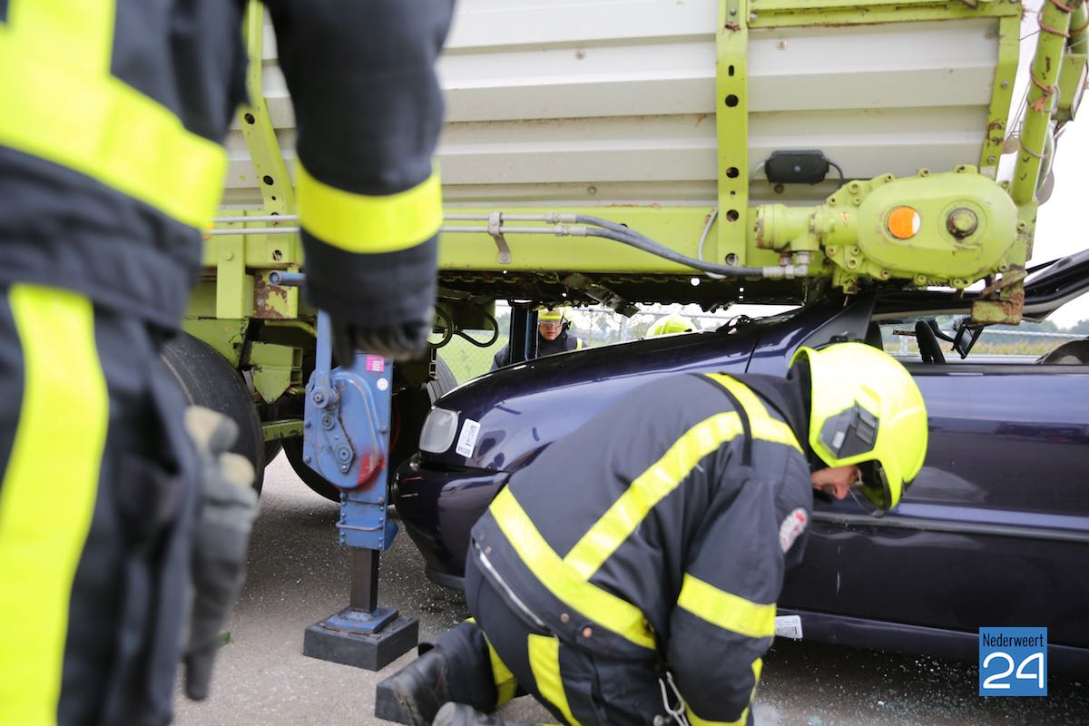 Het scenario in Nederweert speelde zich af aan de Gebbelsweg in Ospel. Hier was een auto achter onder een opraapwagen gereden. De brandweer werd opgeroepen voor een ongeval met beknelling. Eén persoon zat nog vast in de auto. Een klus die de brandweer met de nodige voorzichtigheid moet uitvoeren. Met behulp van dommekrachten (= een soort van krik) werd de machine opgetild waarna met behulp van de staaldraadtakel de auto achteruit gesleept kon worden. Vervolgens kon de brandweer het slachtoffer uit de auto bevrijden.
