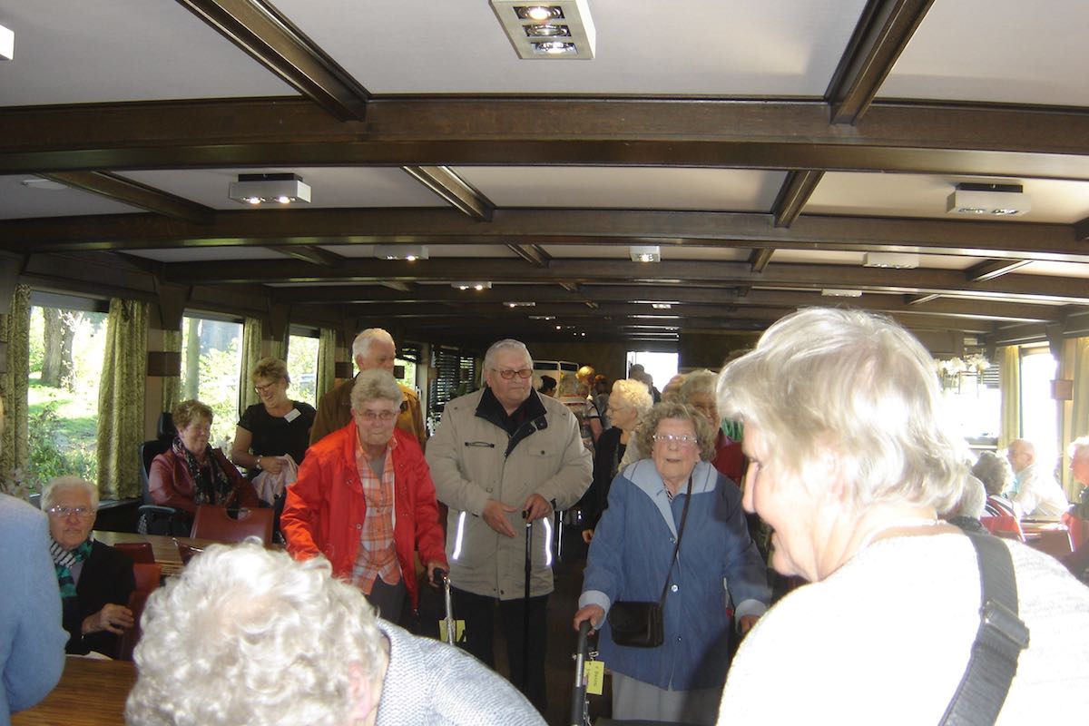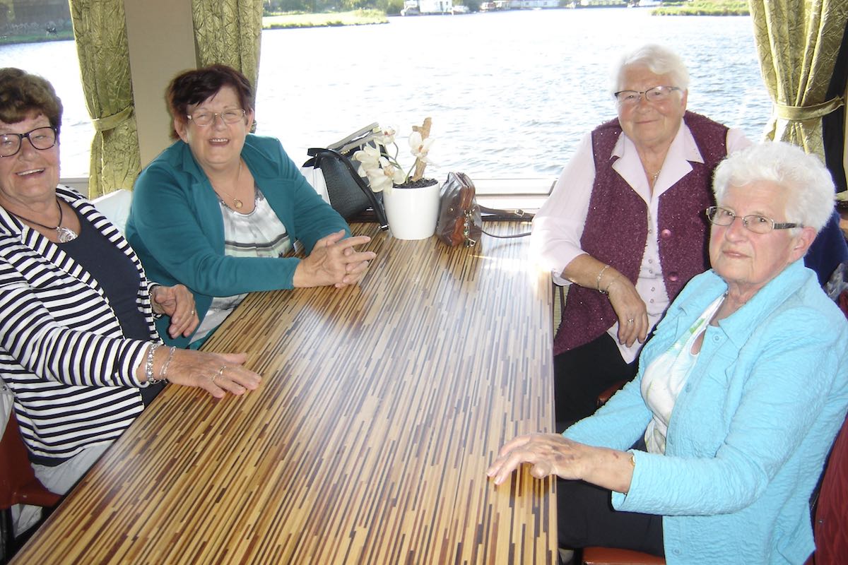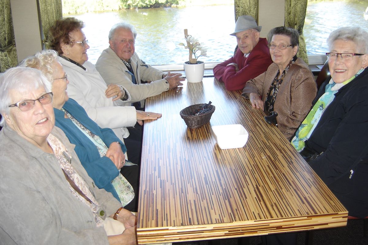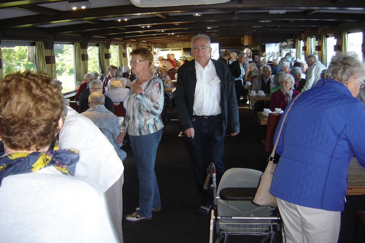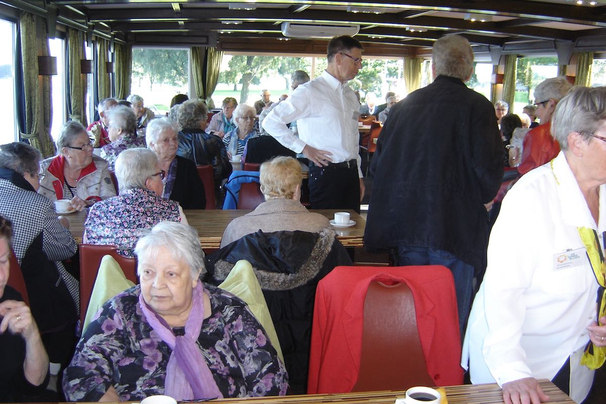 Om 9:00 uur vertrok de bus vanuit Ospel naar de haven in Roermond waar de rondvaartboot klaar lag. Het was prachtig weer en dus was het uitzicht vanaf het water erg mooi. De 188 gasten en vrijwilligers genoten dan ook met volle teugen. Een ieder werd rijkelijk voorzien van spijs en drank en er moest ook weer veel bij gebuurd worden.